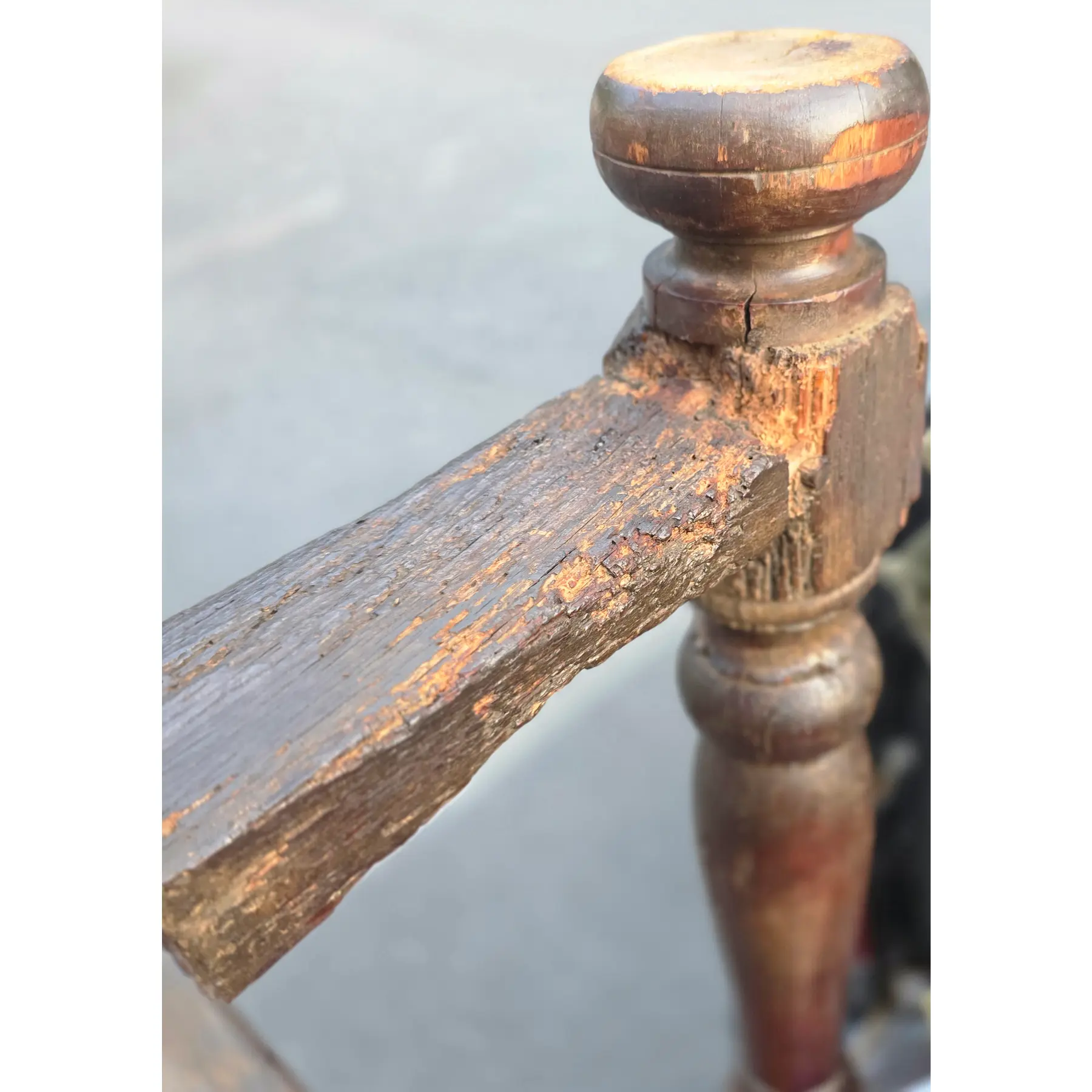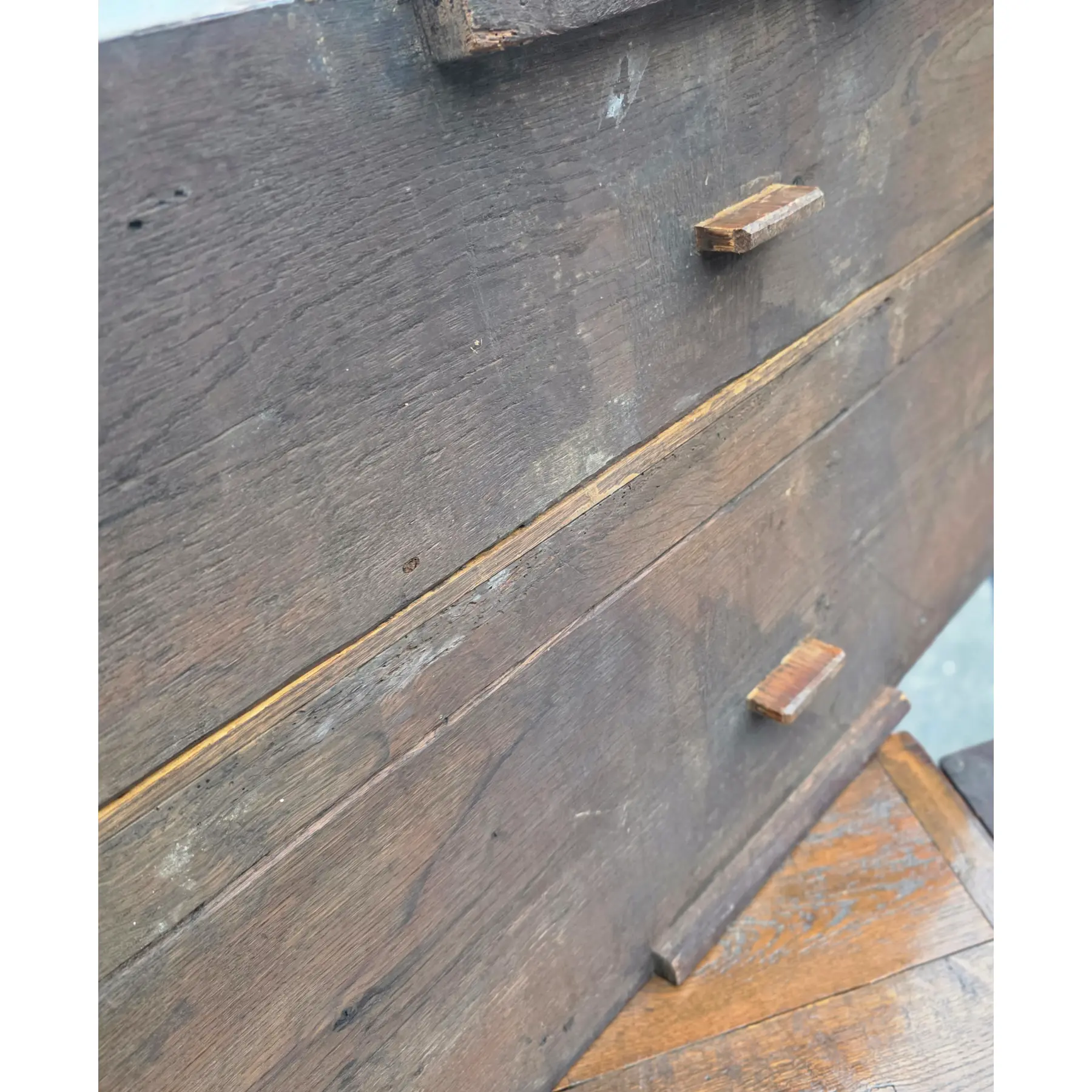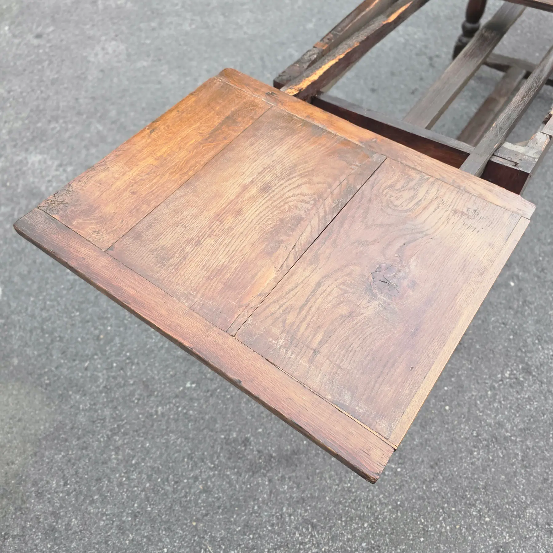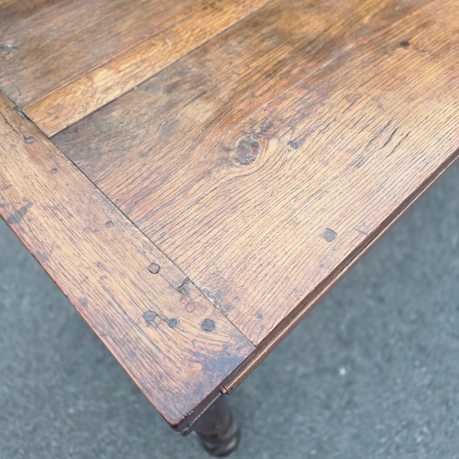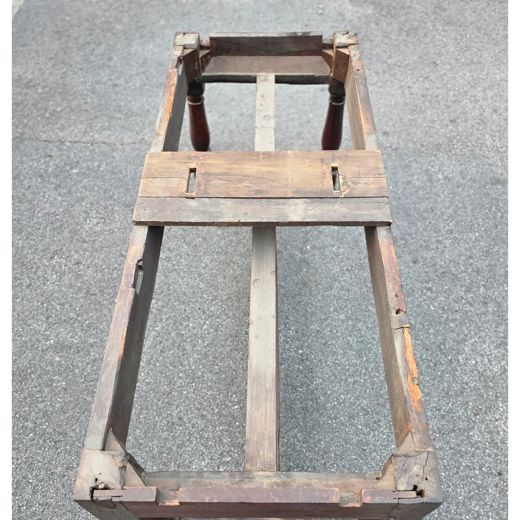 Good antique condition, exhibiting age-appropriate wear consistent with its 100-200-year life, including extensive surface wear. Being offered as found, unrestored. Areas of wood loss and degradation, including exposed grain, particularly along edges, stretchers, and underside, and some cracking and separation in joints around leg mortises. Old nails, replaced wood segments, pegs, and historic repairs are visible. Wear to finish, surface checking, oxidation, scratches, and patinated exposed wood are present throughout.