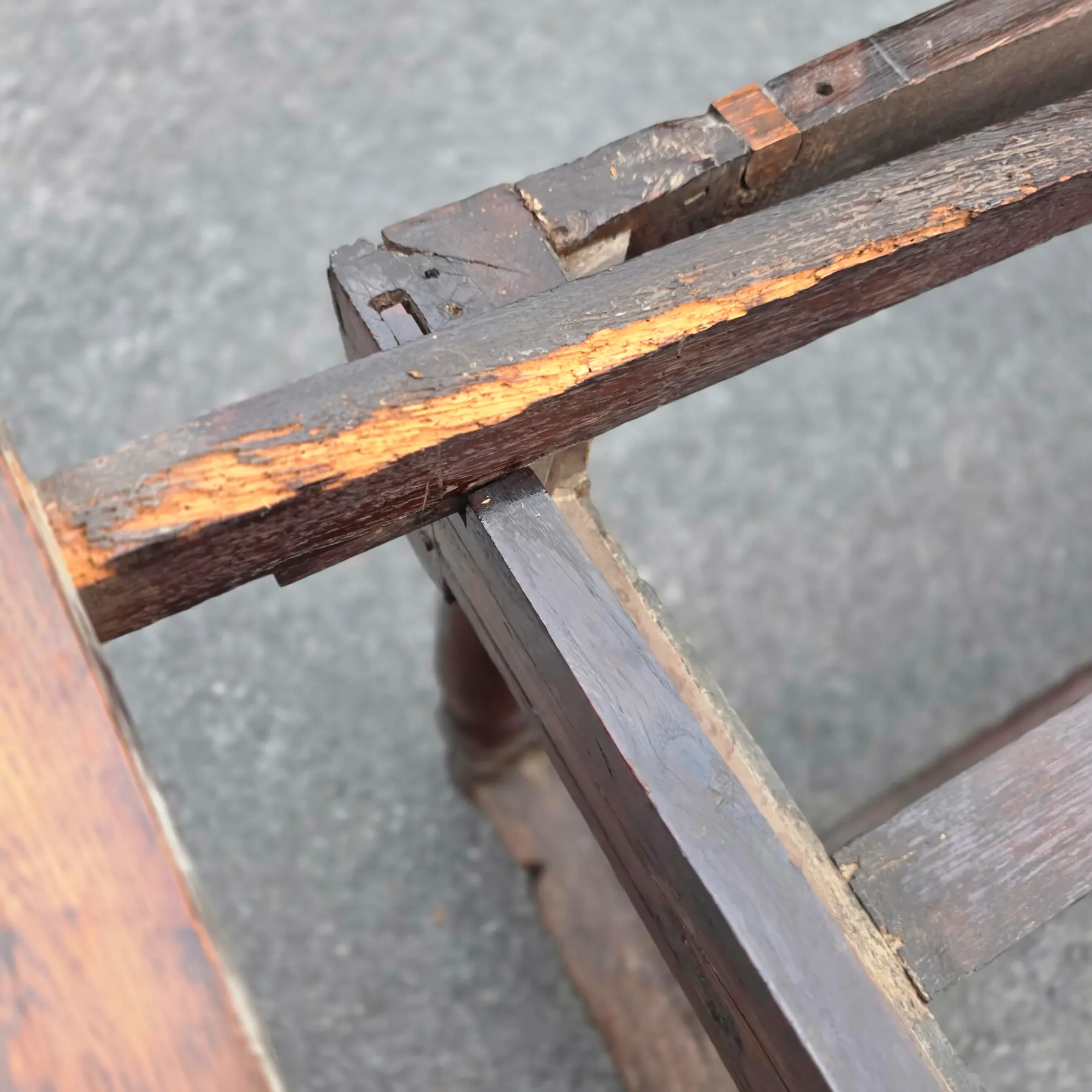Mortise-and-tenon elements, handmade pegs, and visible tool marks beneath the table from period carpentry
