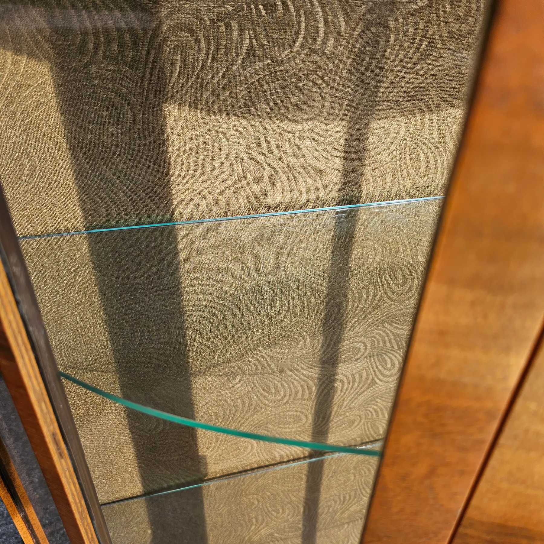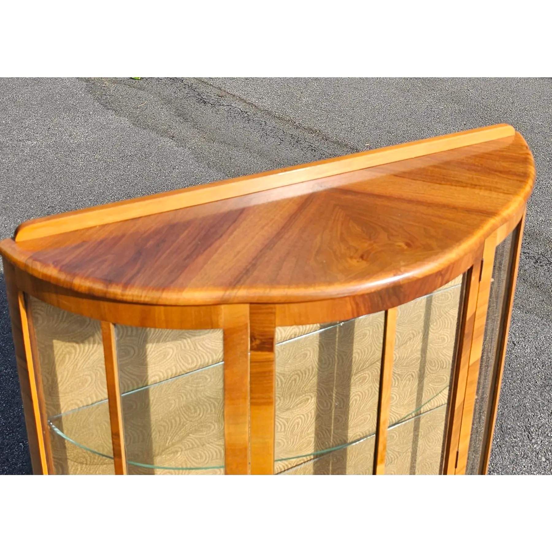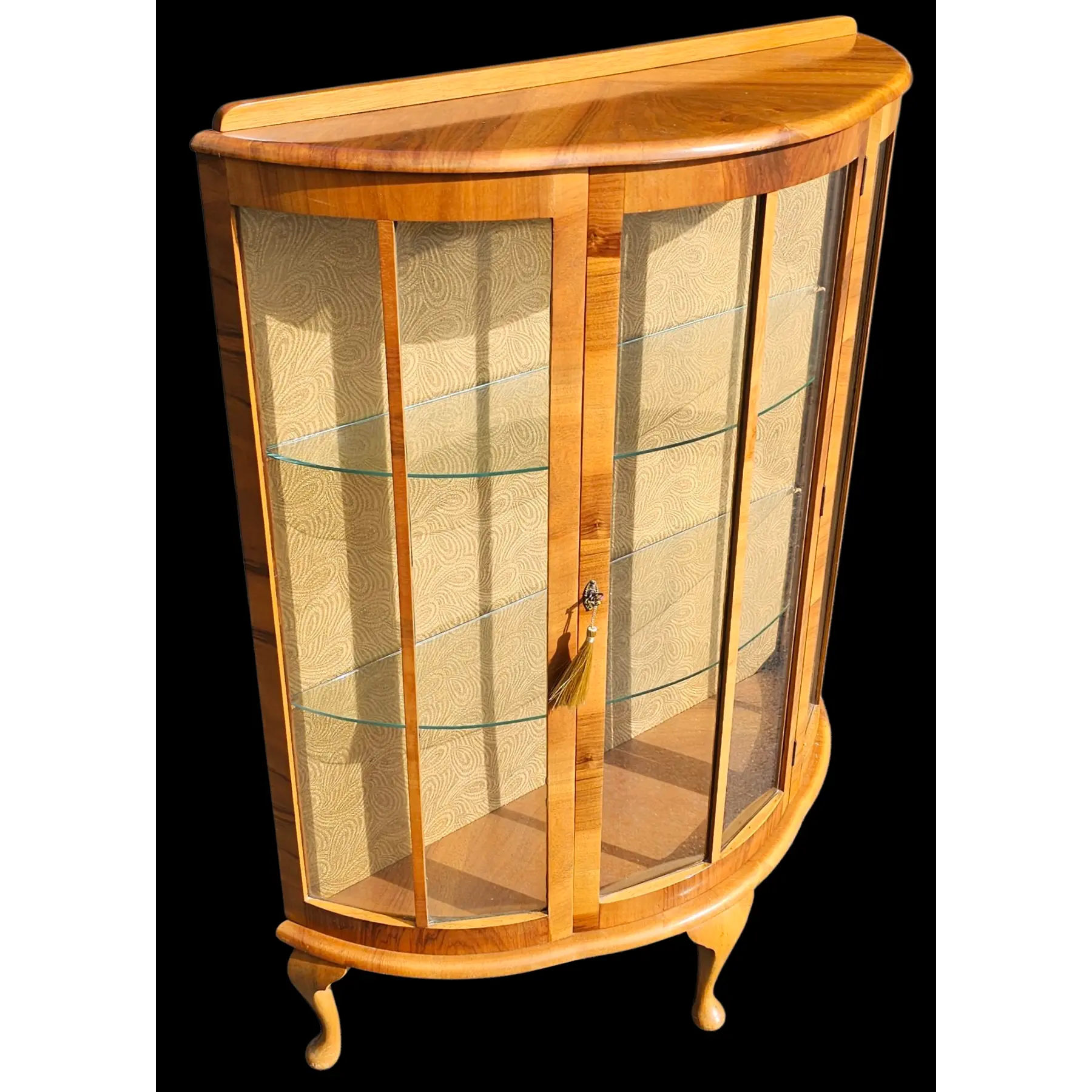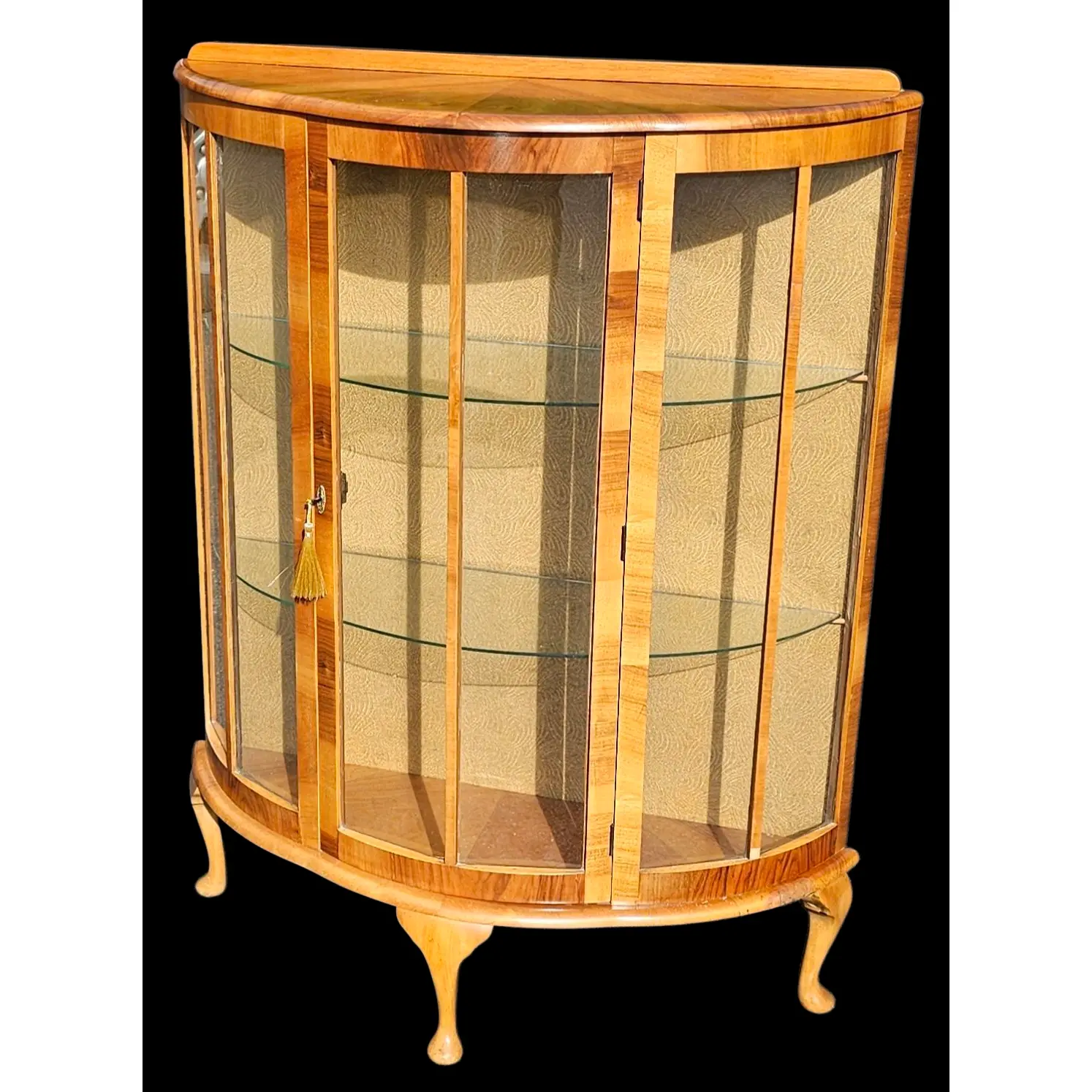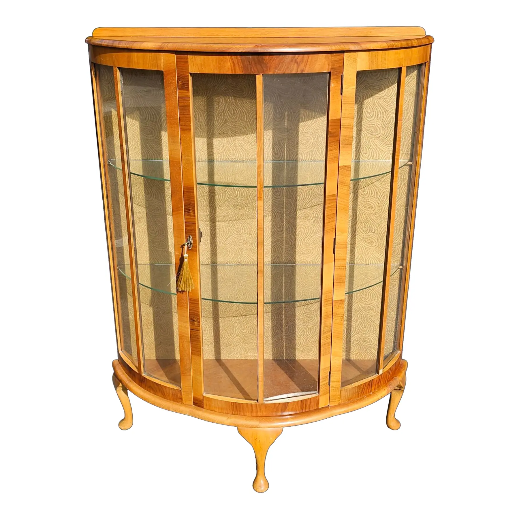 Featured is a 1930s Diminutive Bow Front Curio Cabinet with multiple glass shelves, and lockable door. The cabinet is designed with a curved front and is supported by elegant, cabriole-style legs. The wood is a light-toned veneer with a prominent grain pattern. The interior back panel has a patterned covering.