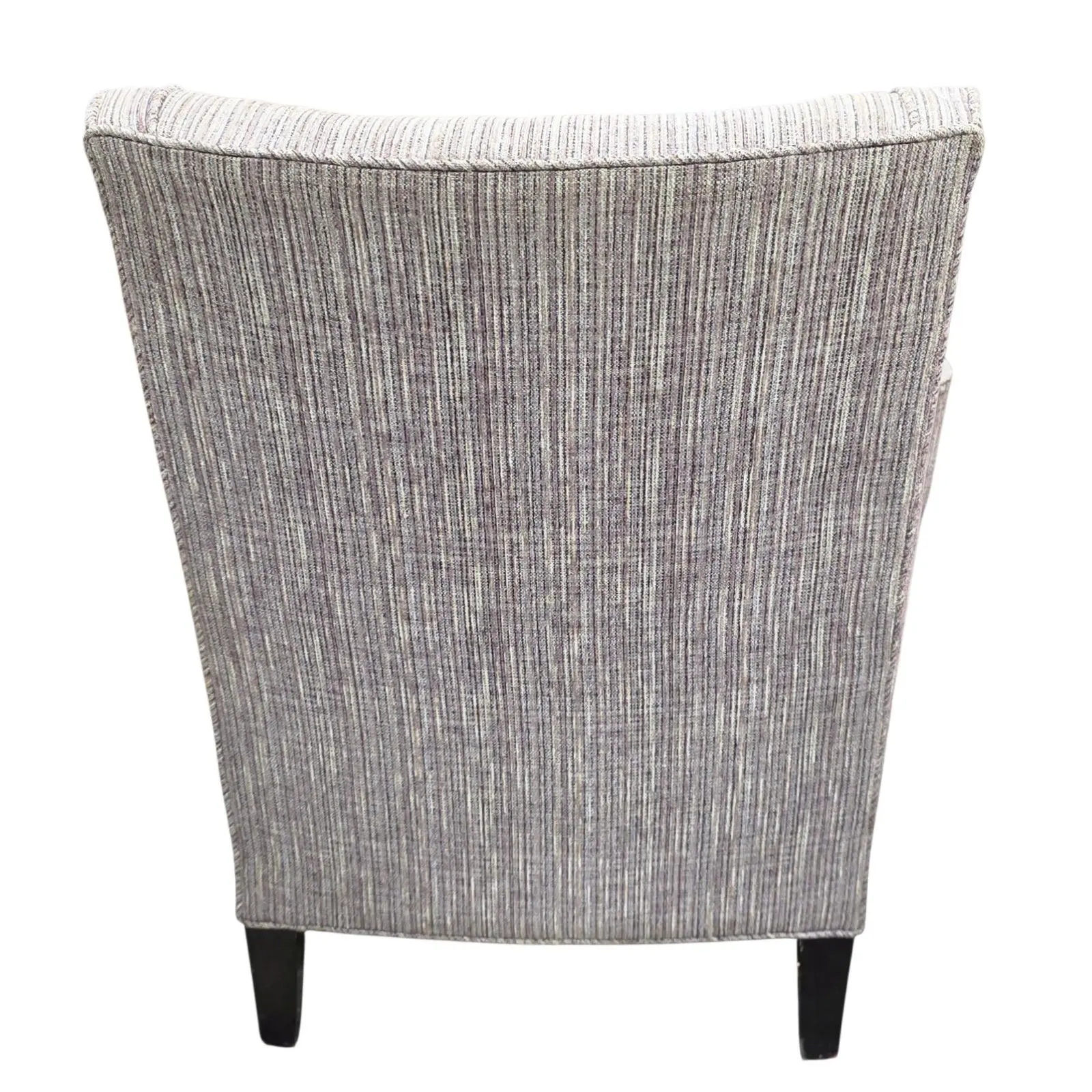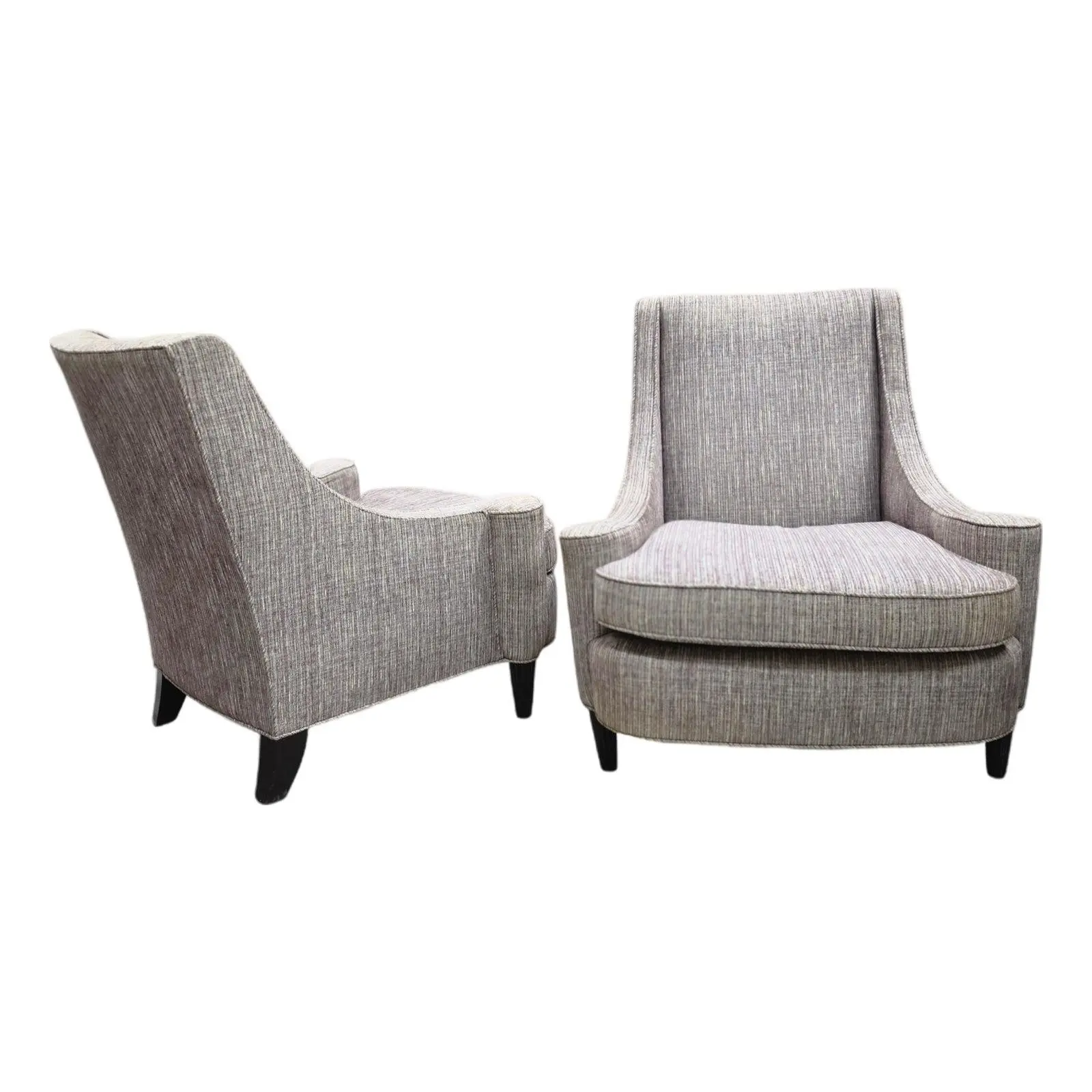 Featured is a refined Pair of Vintage Barbara Barry Lounge Chairs softly curved arms, a gently sloped back, and deep, comfortable seating. Upholstered in a neutral textured purplish gray fabric that complements a wide range of interiors, from modern and transitional to classic spaces. The tailored silhouette is elevated by tapered black legs, giving the chairs a light, elegant presence.
