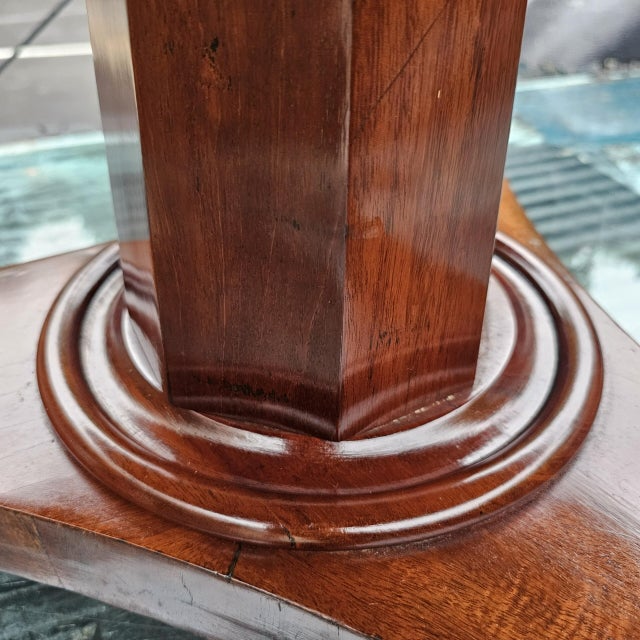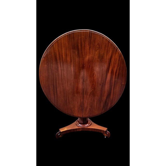 This 19th-century English William IV Mahogany Tilt-Top Table with Pedestal Tri-Form Base is a quietly commanding piece that combines elements of late Regency and Victorian design.