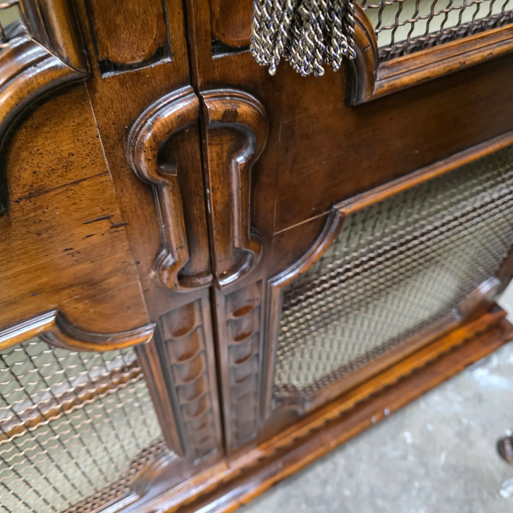 * Large solid wood cabinet with double doors that are inset with decorative mesh panels framed by shaped and carved modlings