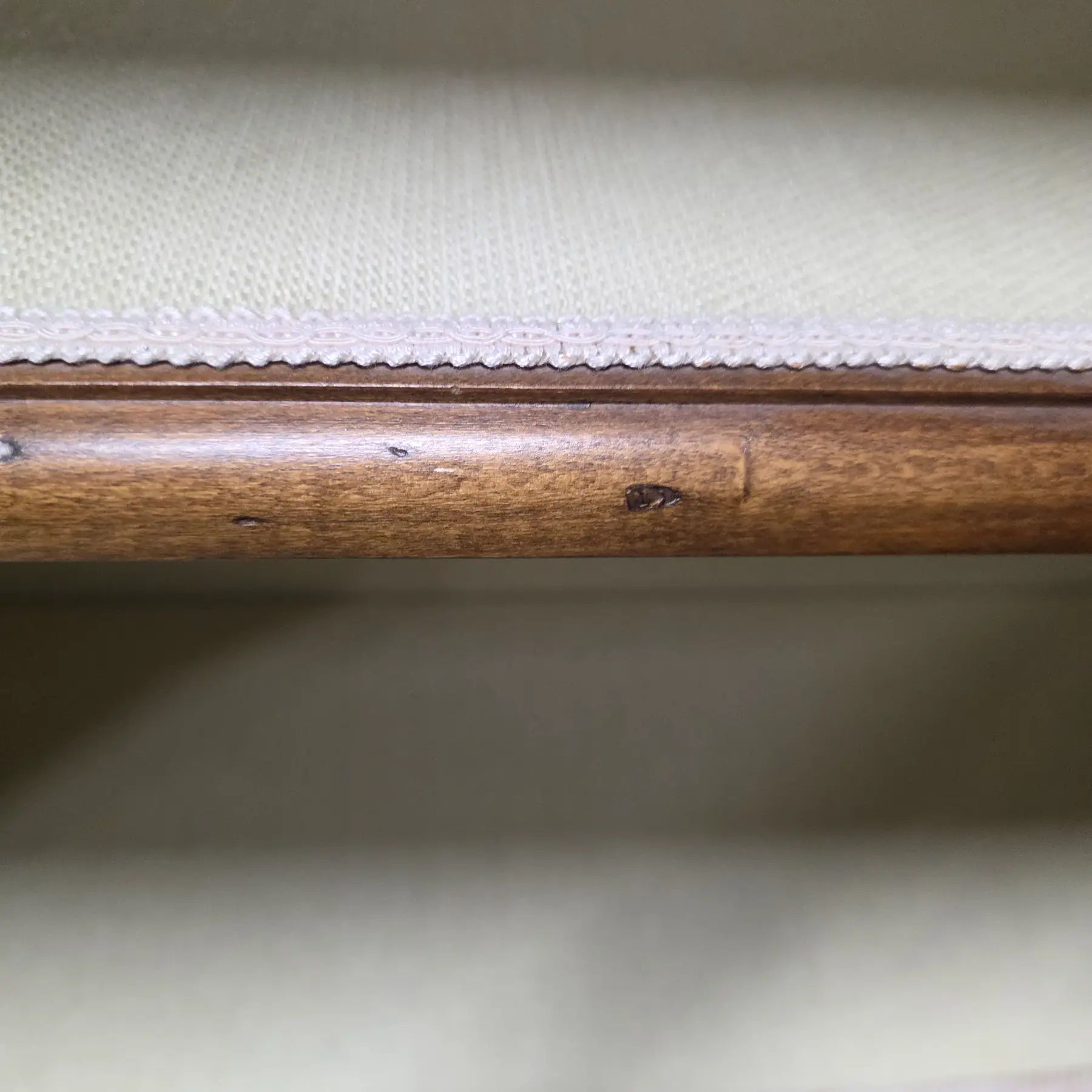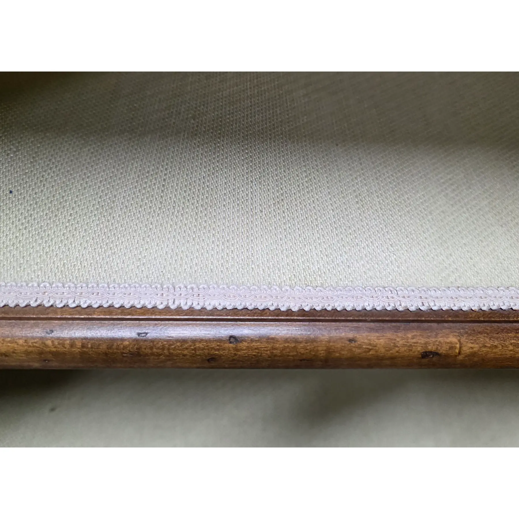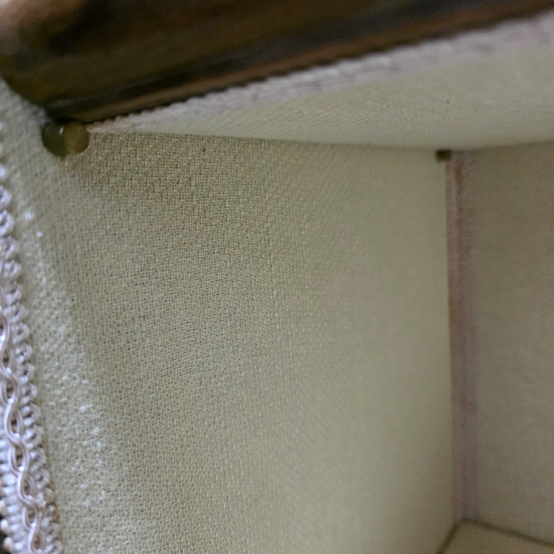 * Recently reupholstered interior in tightly woven fabric that is finished with delicate trim along the shelf edges