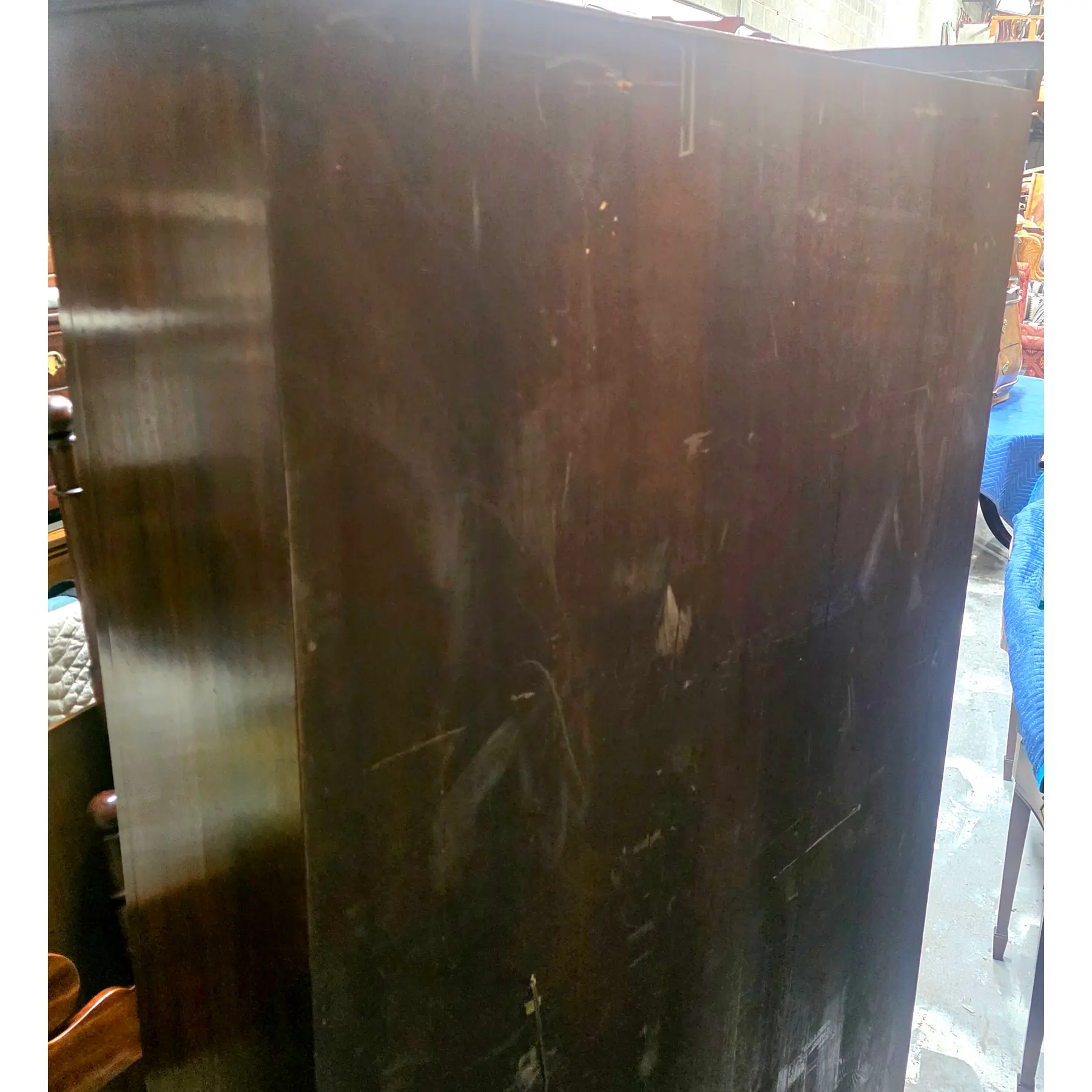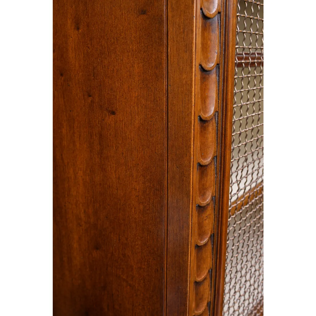 * Good vintage condition and structurally sound with exterior wood surfaces displaying scattered surface scratches and abrasions (see side panels and lower front molding photos) consistent with age-related wear. Interior fabric lining is clean with no visible tears. Lower plinth and base molding display scattered surface wear and visible scuffs, small nicks, and finish losses consistent with age. Minor finish inconsistencies and small darkened marks visible along lower molding and base edge. Wire mesh is in tact end evenly installed.