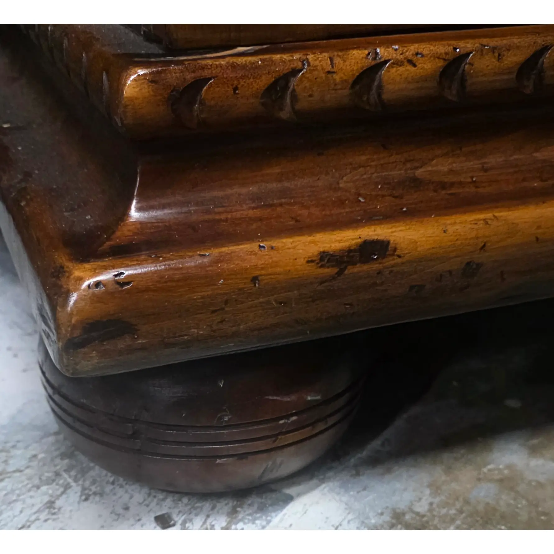 * Molded cornice, paneled sides, and grounded plinth base resting on rounded bun-style feet