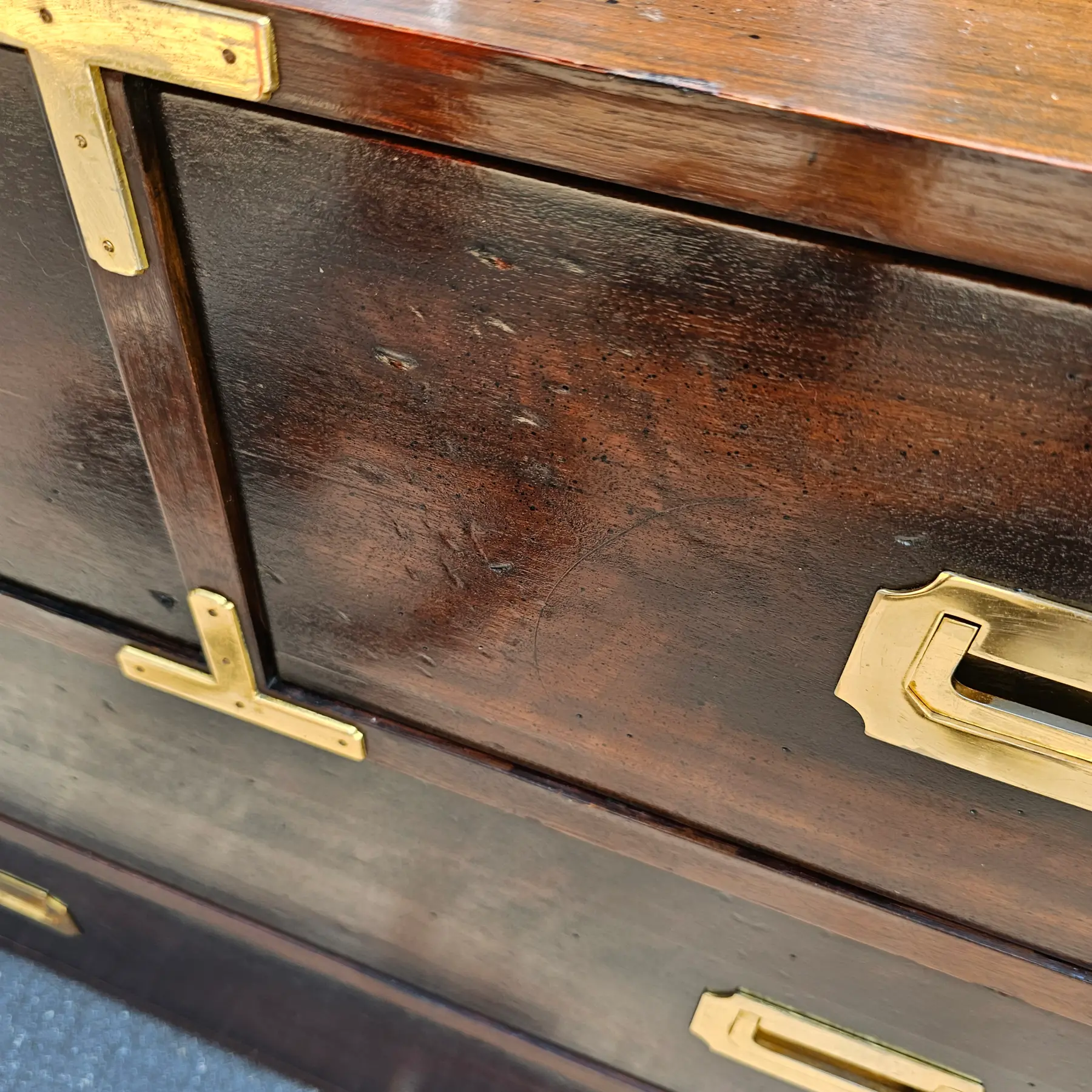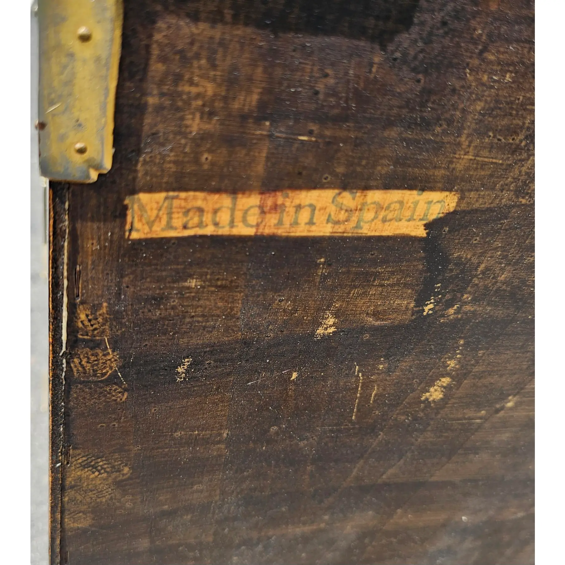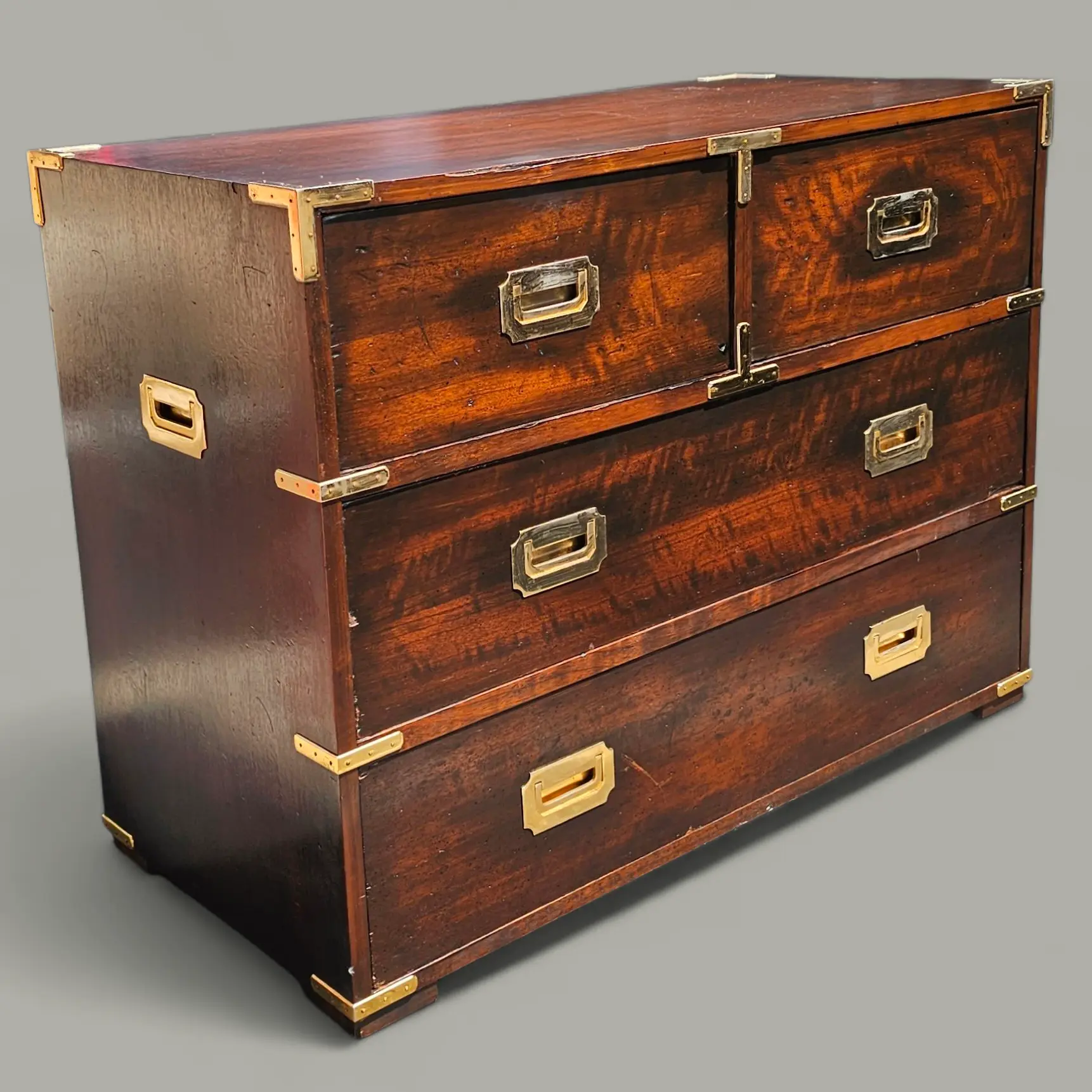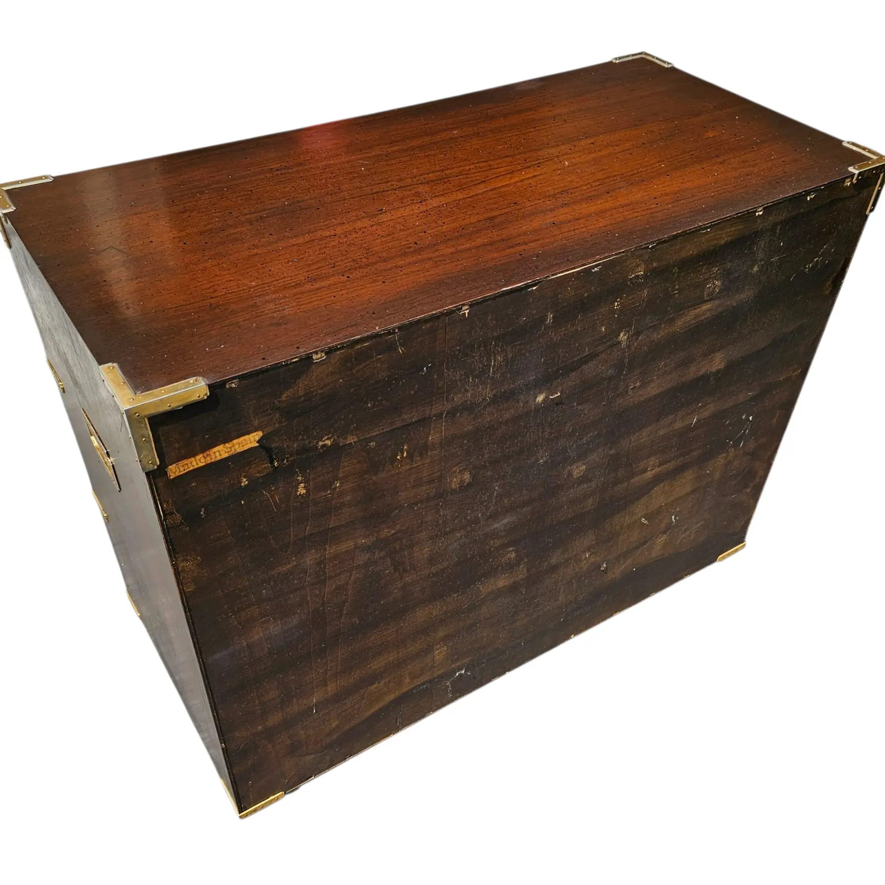 Featured is a late 19th Century Antique Campaign Style Bachelor’s Chest Made in Spain.