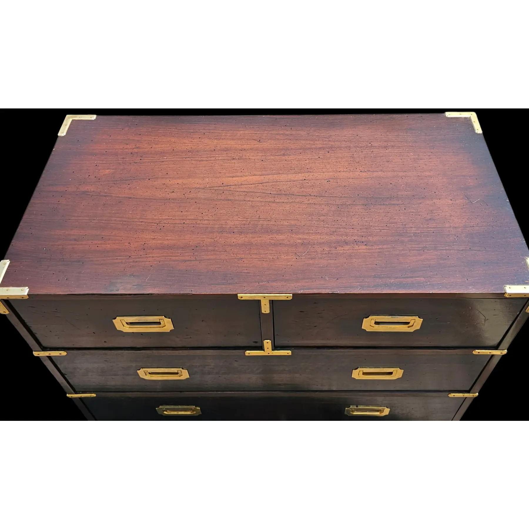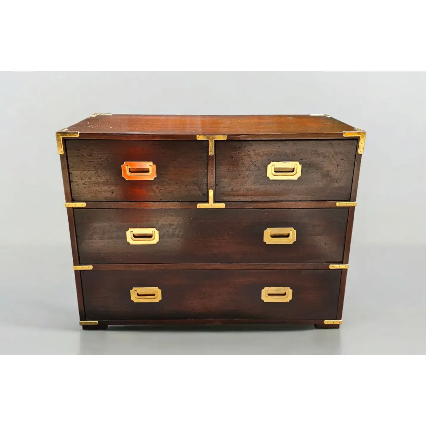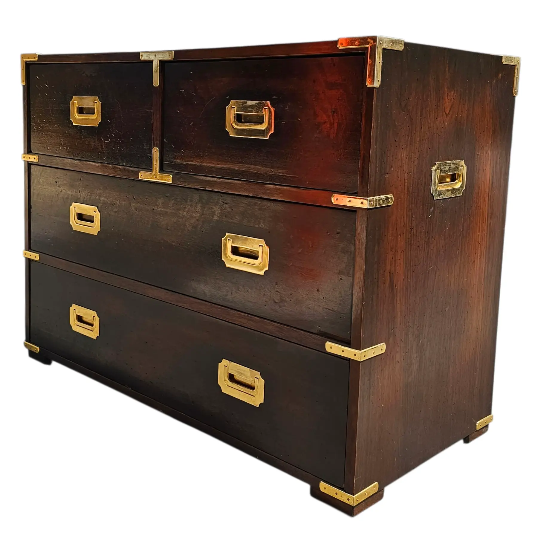 Add a touch of sophistication to your space with this stunning chest of drawers. Featuring four spacious drawers, it offers ample storage for clothes, linens, or accessories. The rich, dark wood finish is complemented by striking brass hardware and corner accents, giving it a luxurious and timeless appeal. Crafted with sturdy construction and classic detailing, this piece is perfect for adding character and functionality to your bedroom, hallway, or living area.