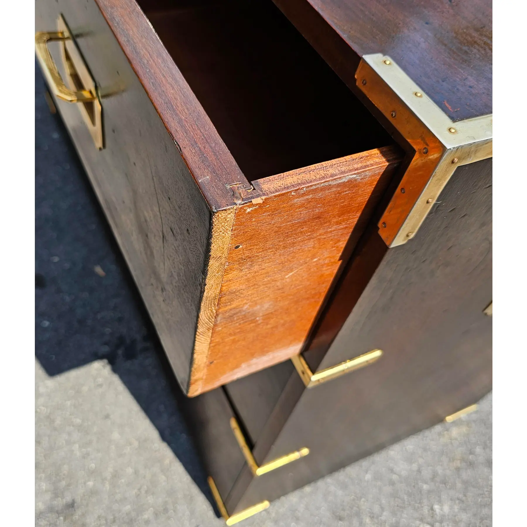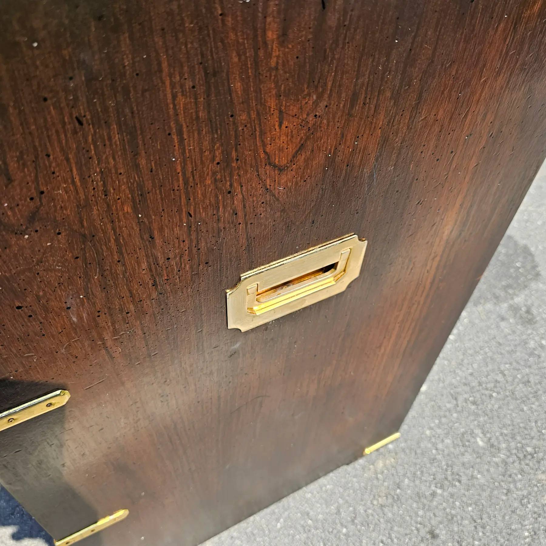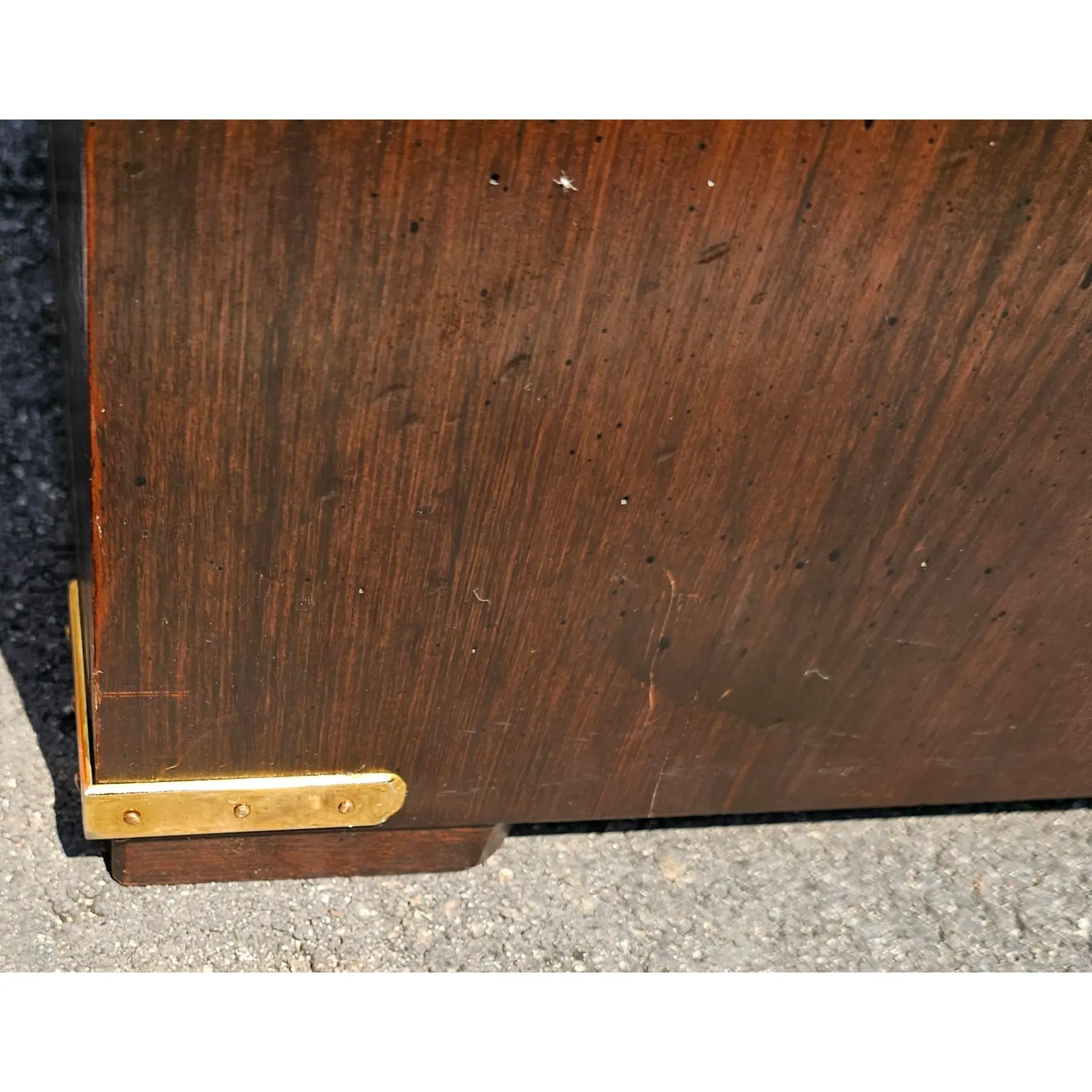 Add a touch of sophistication to your space with this stunning chest of drawers. Featuring four spacious drawers, it offers ample storage for clothes, linens, or accessories. The rich, dark wood finish is complemented by striking brass hardware and corner accents, giving it a luxurious and timeless appeal. Crafted with sturdy construction and classic detailing, this piece is perfect for adding character and functionality to your bedroom, hallway, or living area.