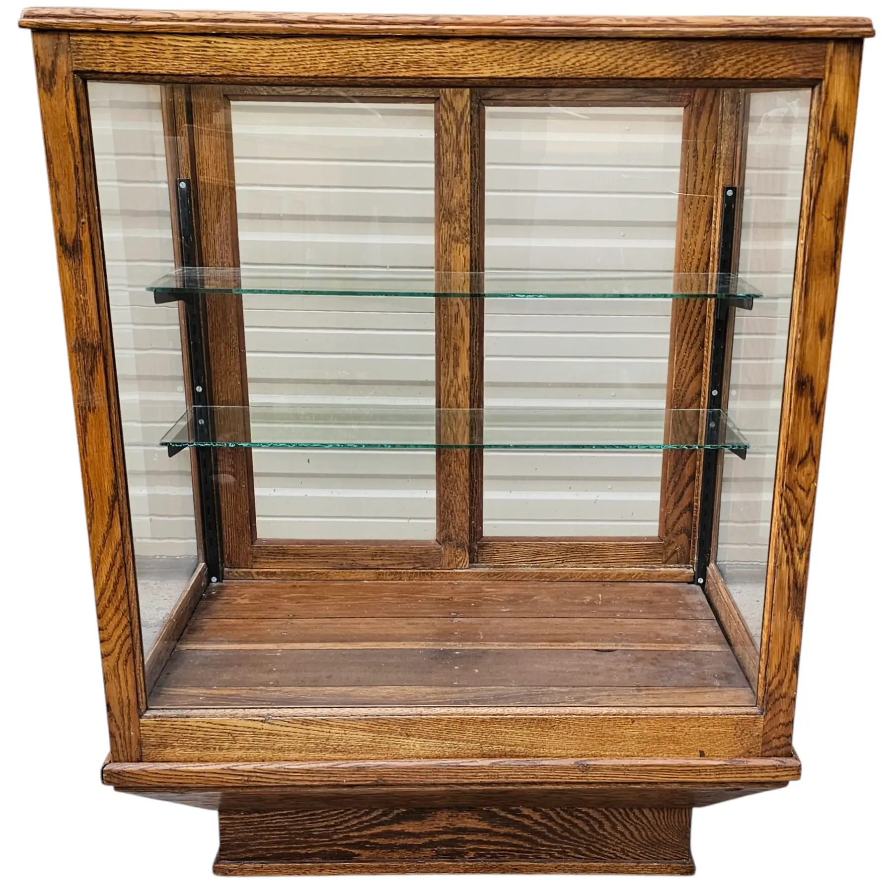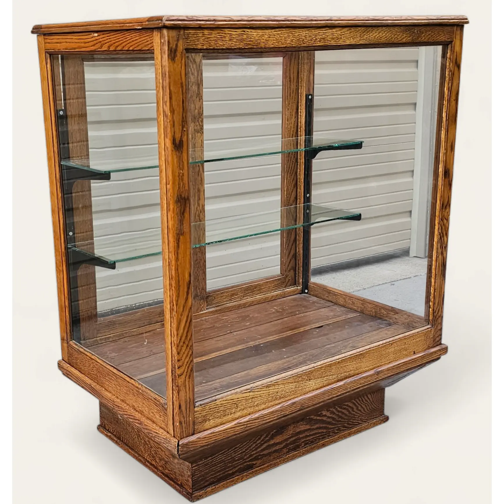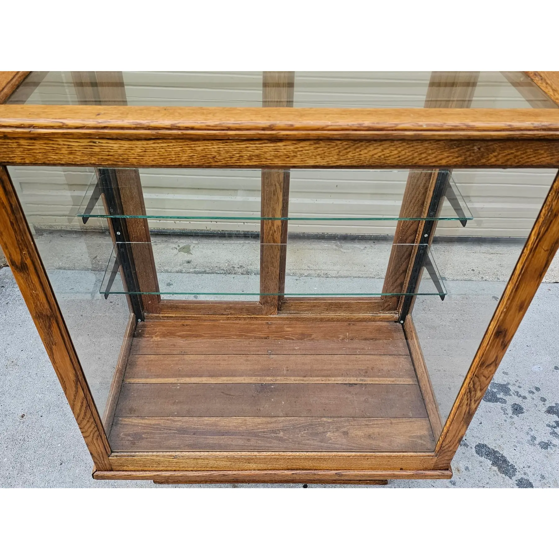 Interior houses two tempered glass shelves supported by period-style metal brackets on adjustable rails