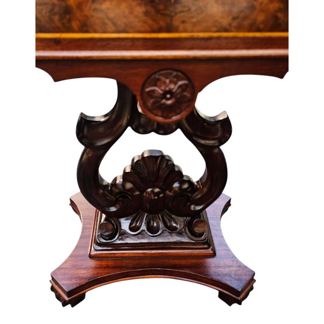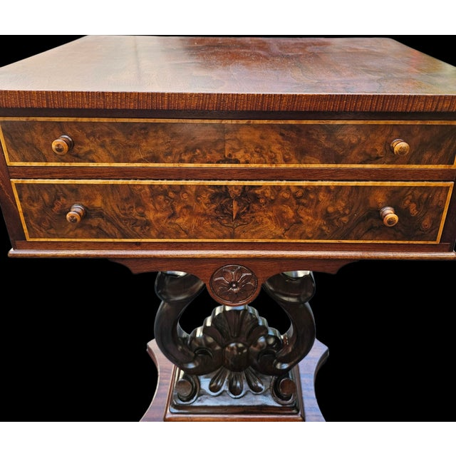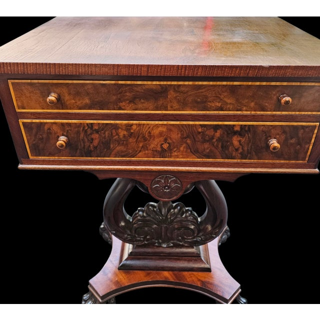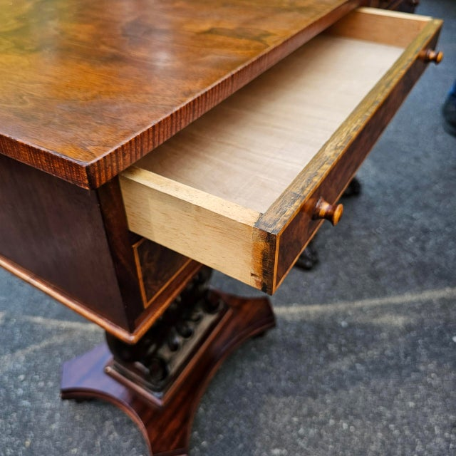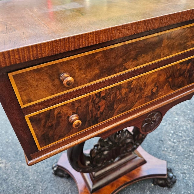 Made from solid figured mahogany with matched burled walnut drawer frongs and satinwood string inlay