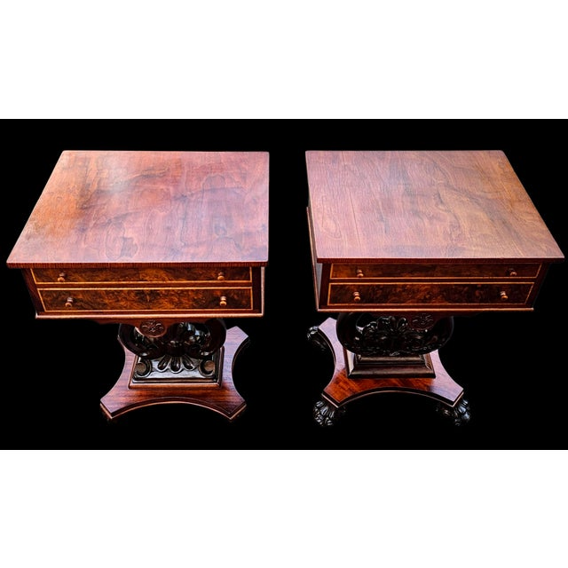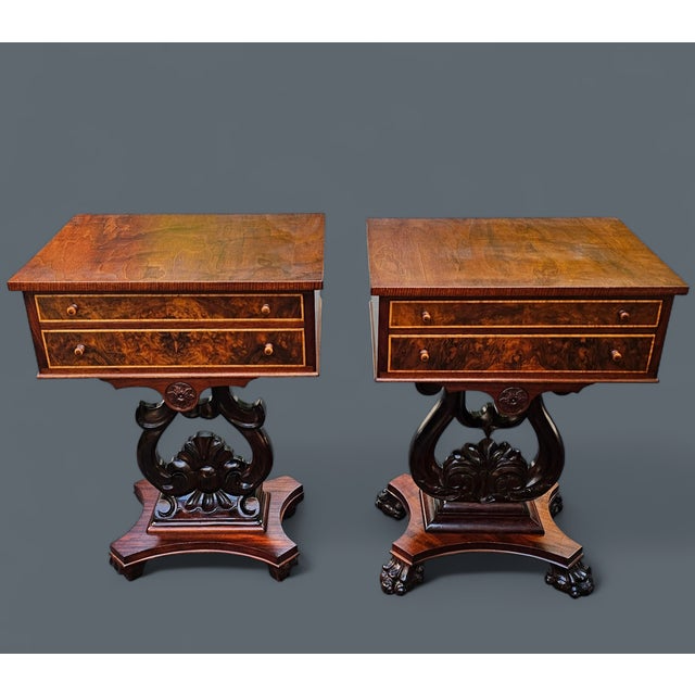 This Antique Pair (His and Hers) of Ornately Carved His and Her Nightstands is a unique and exceptionally rare match from the 19th century in the opulent Classical Revival style.