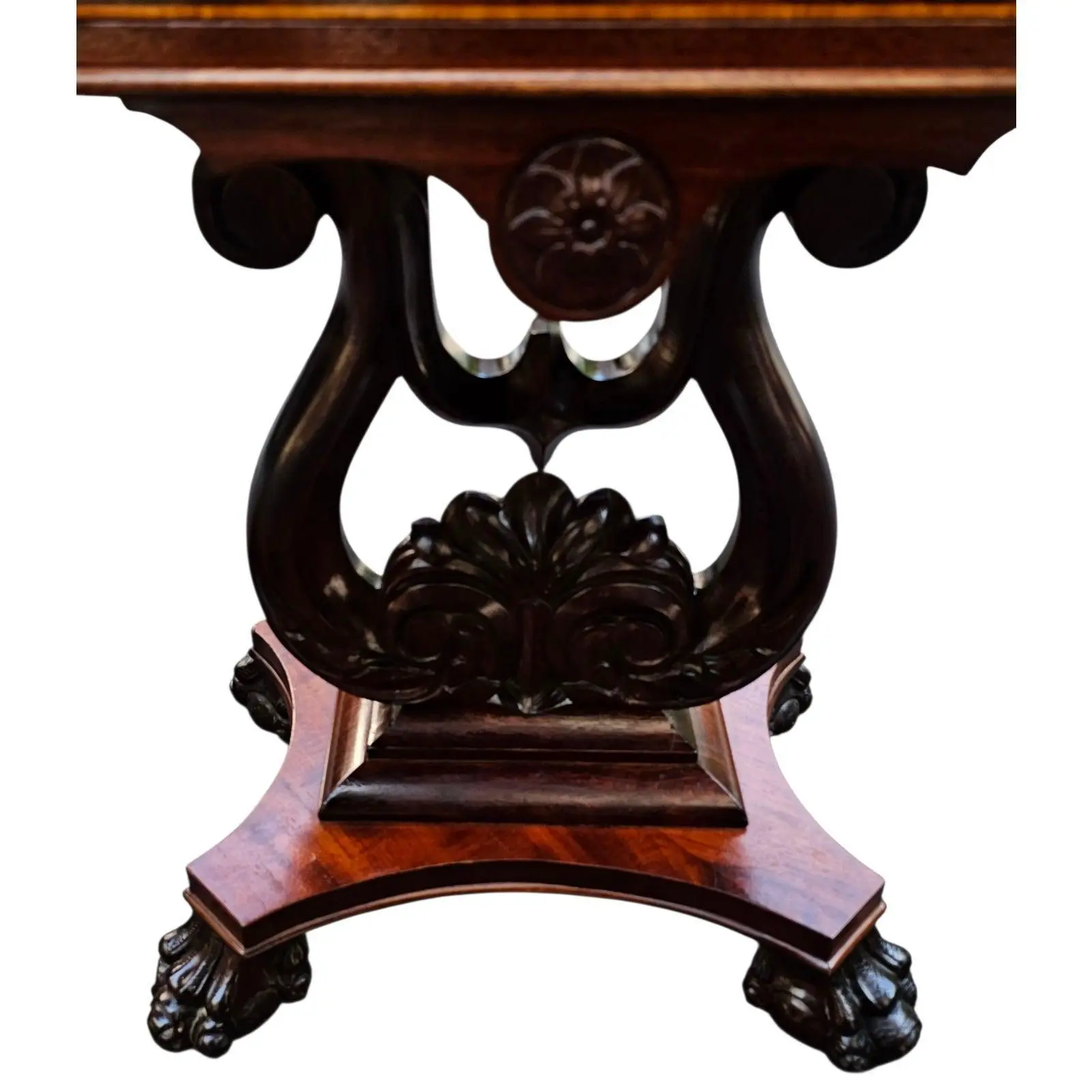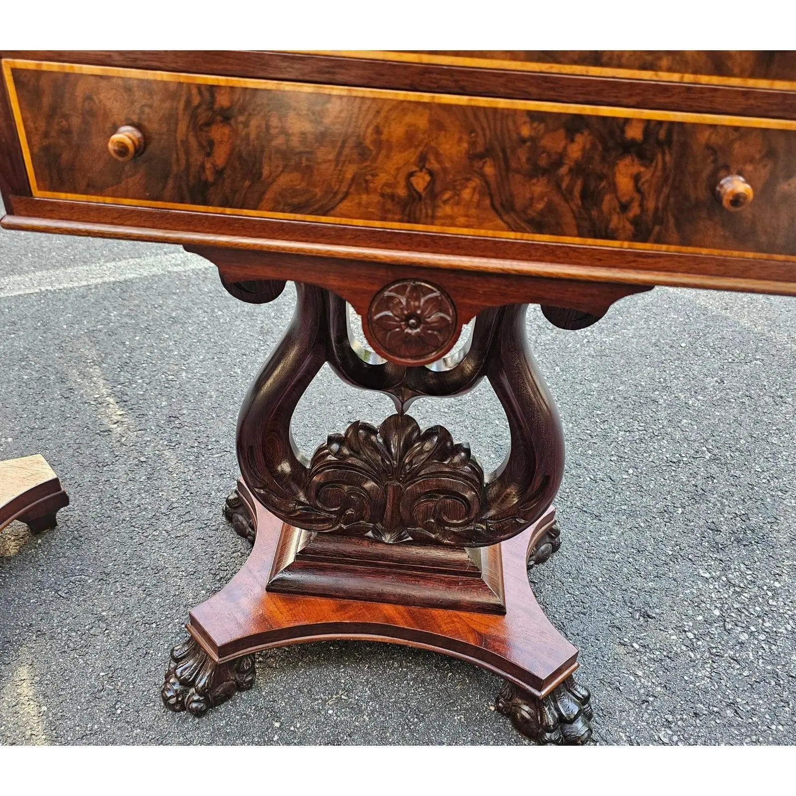 Made from solid figured mahogany with matched burled walnut drawer frongs and satinwood string inlay