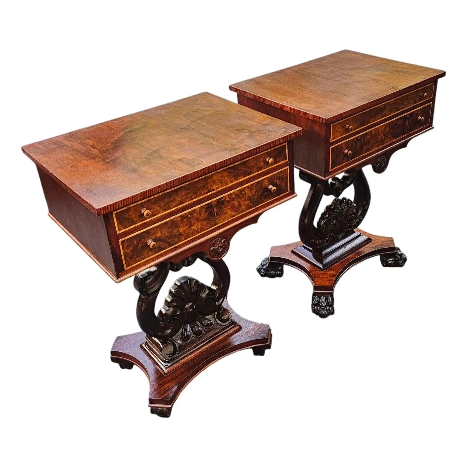 This Antique Pair (His and Hers) of Ornately Carved His and Her Nightstands is a unique and exceptionally rare match from the 19th century in the opulent Classical Revival style.
