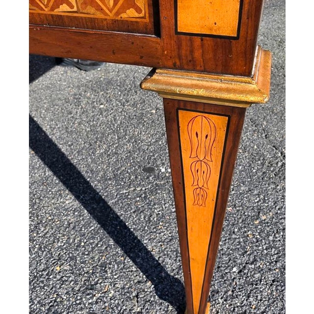 Marquetry patterns in a geometric motif of gilded leaf diamonds across the drawers and side panels