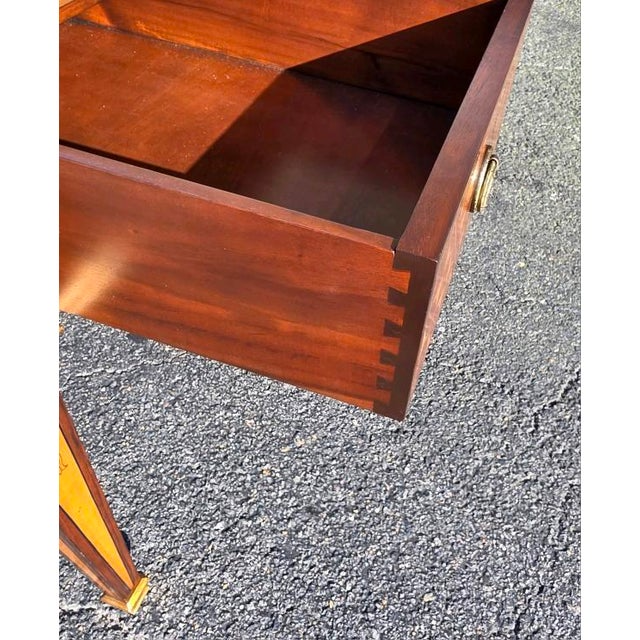 Constructed from striking contrasts of rich fruitwoods, inlaid veneers, and hand-applied gilded accents