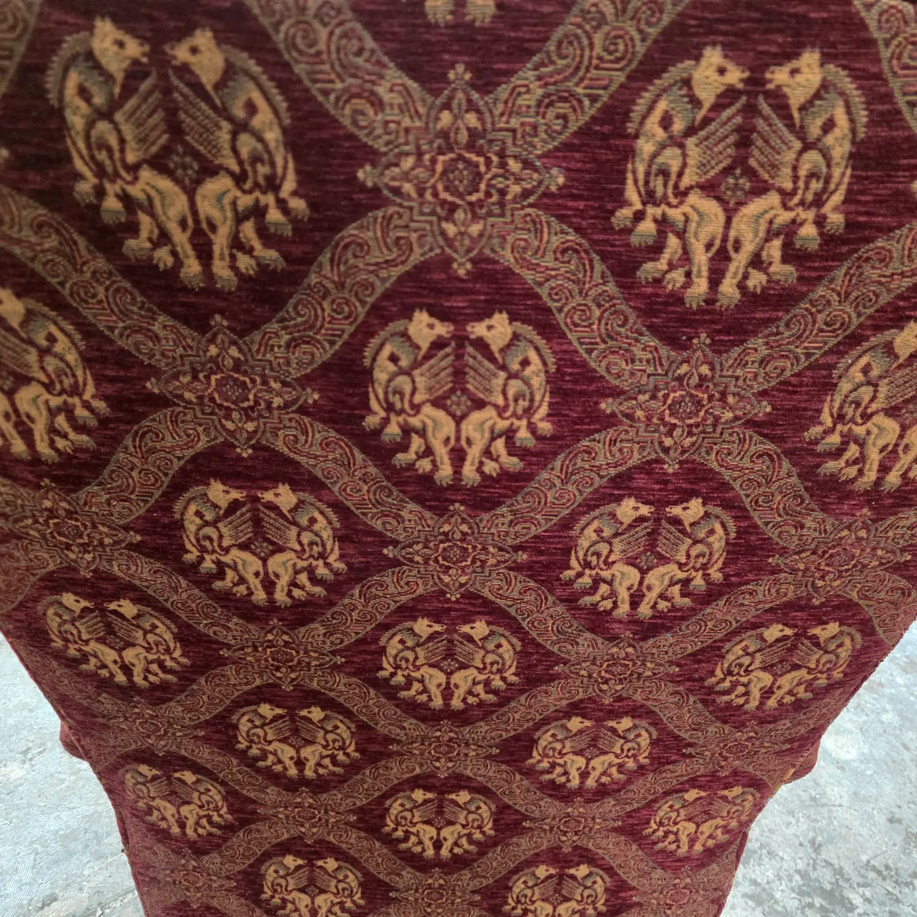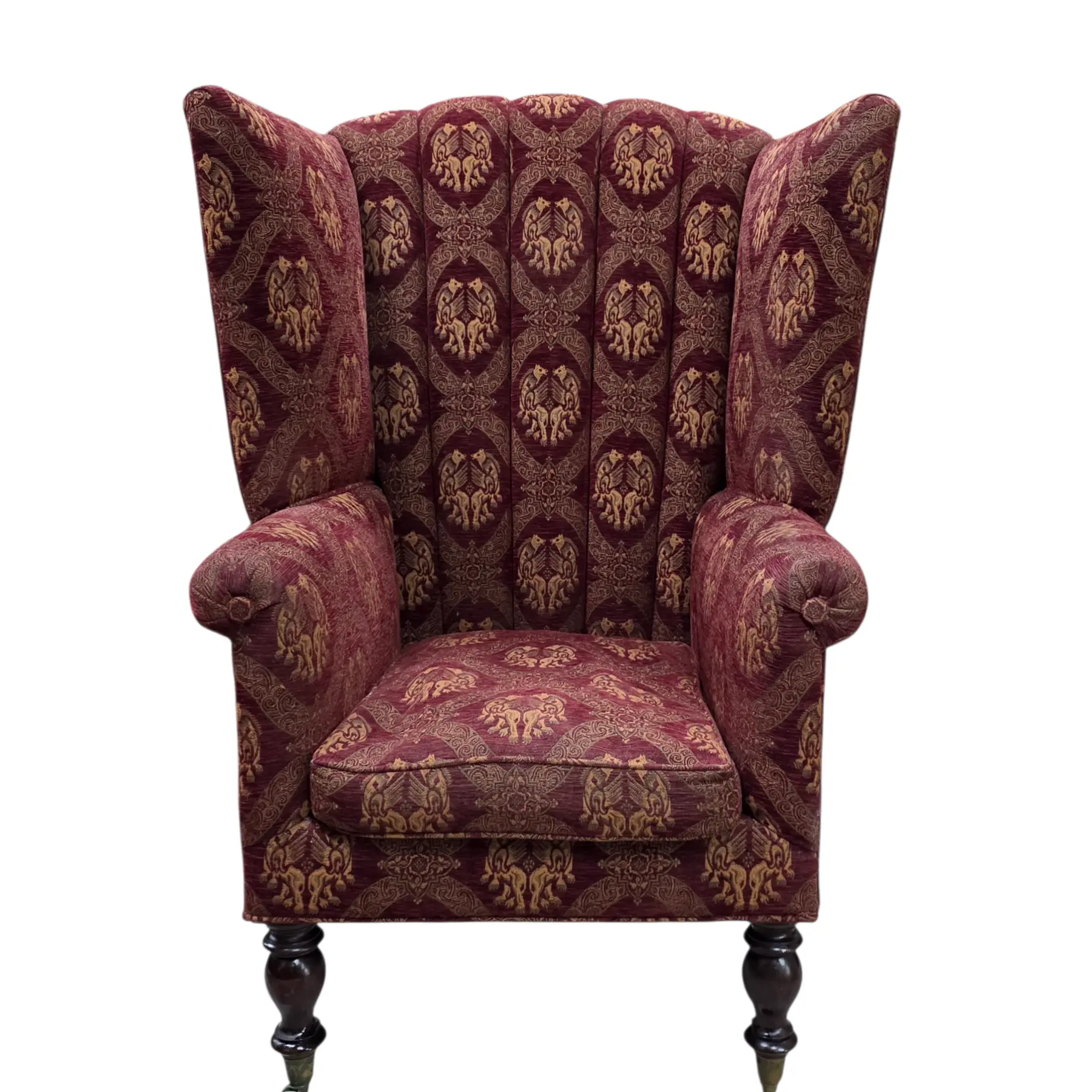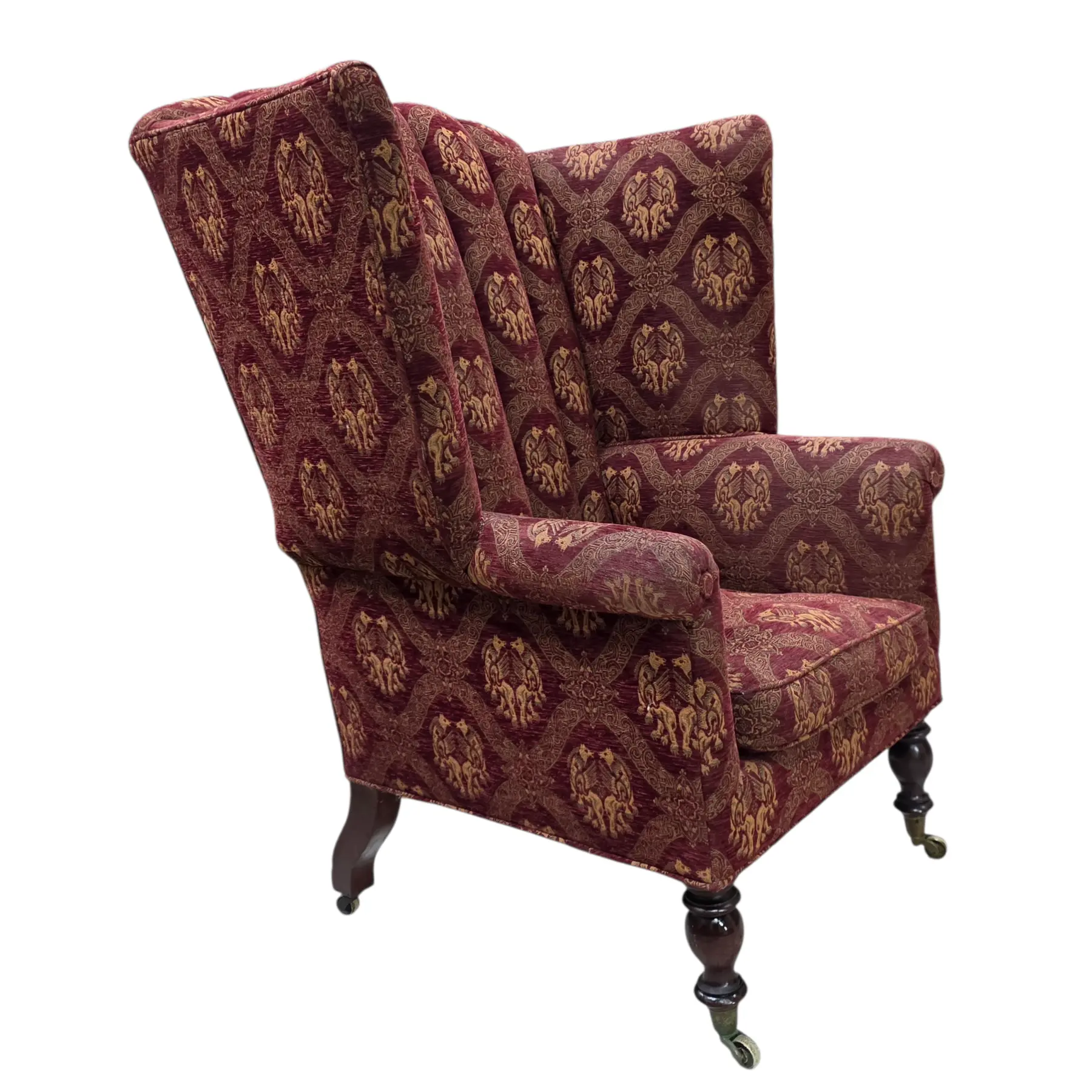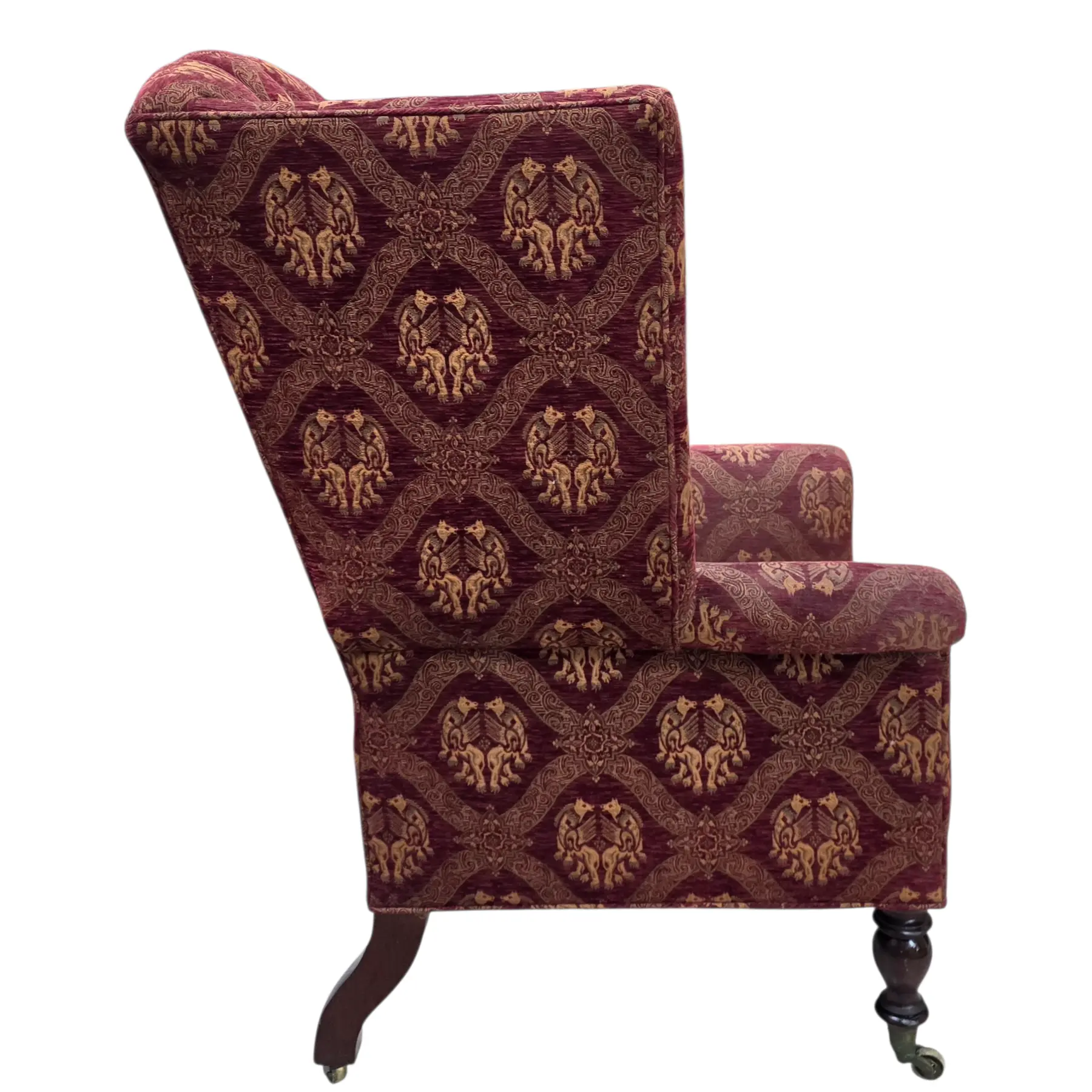 Upholstered in lustrous burgundy pattern fabric with a repeating heraldic-style motif within an ornamental lattice – unified throughout the backrest, wings, arms, seat cushion, and rear elevation