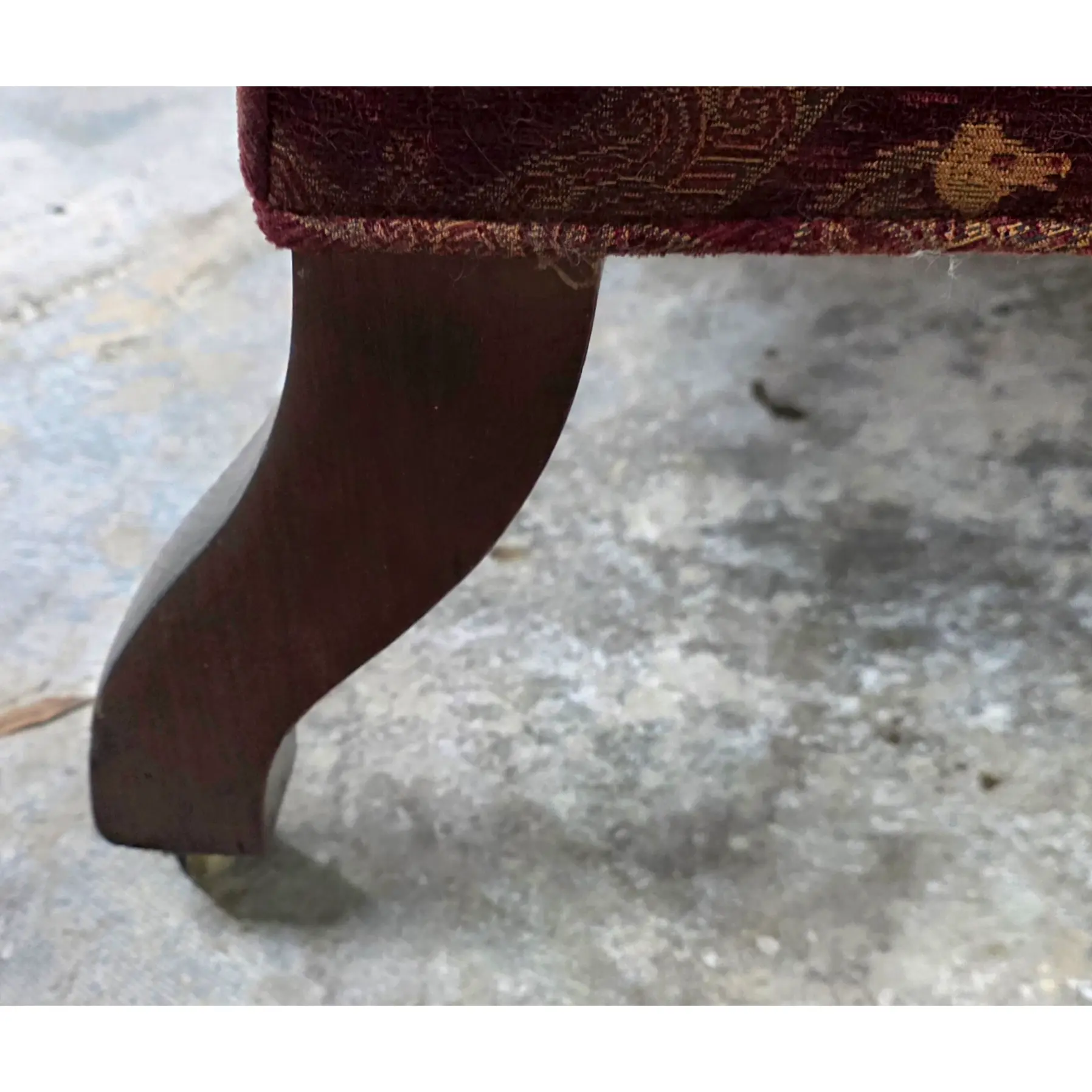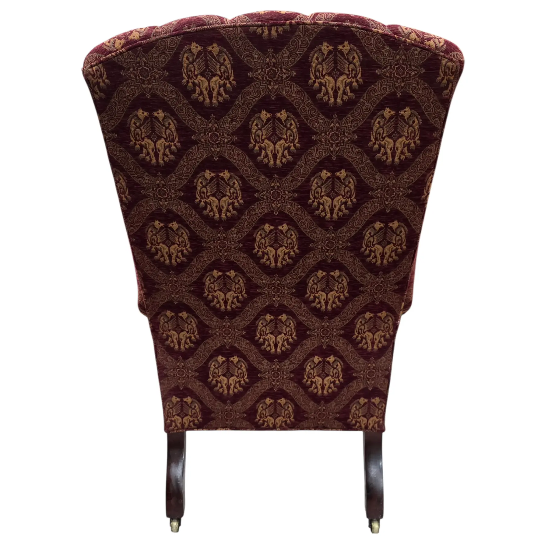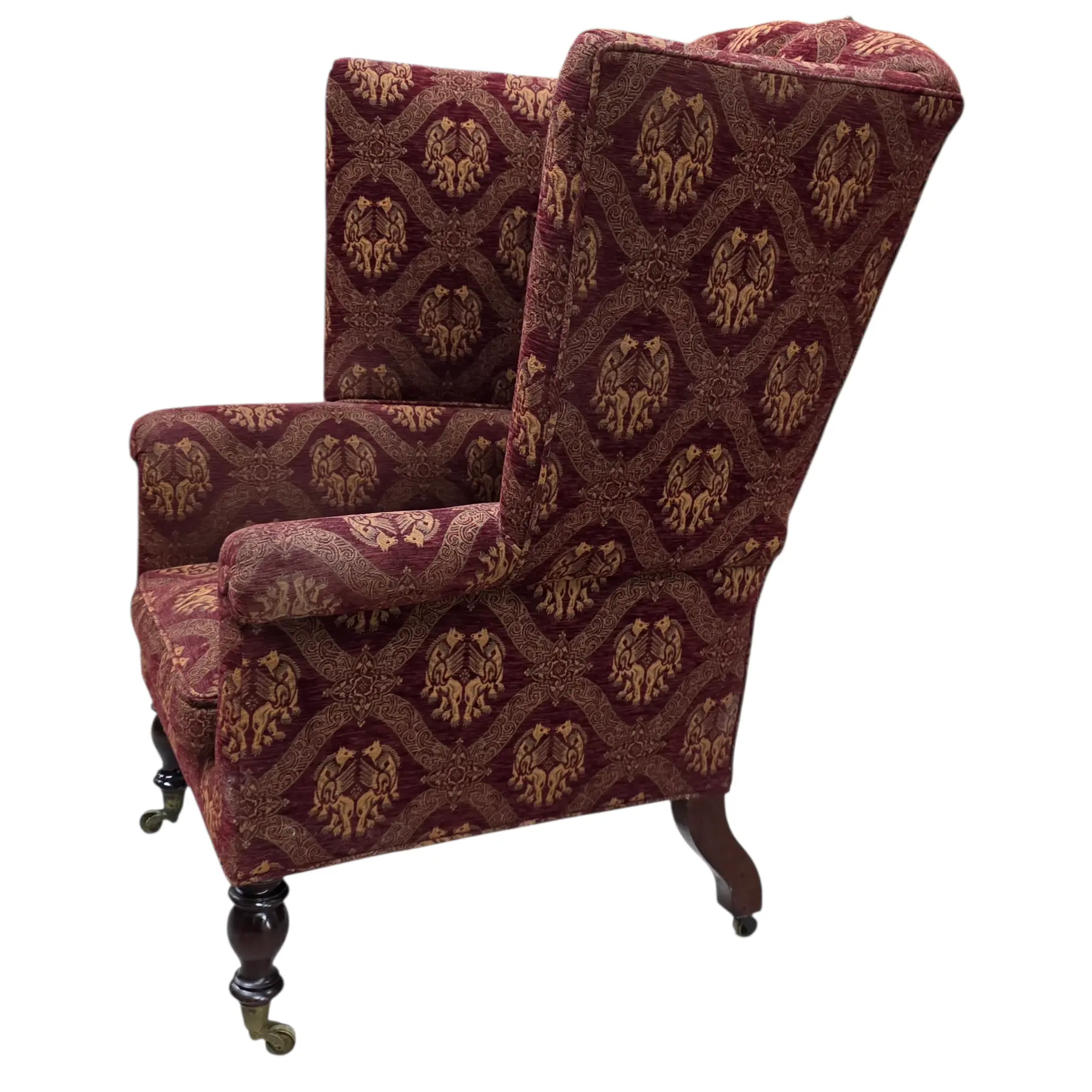 This Georgian Revival wingback chair is elegant in deep burgundy has a commanding traditional profile and is a classically grounded seating piece, reupholstered (not recent) in a richly patterned and decorative woven fabric that can easily integrate into a wide array of interior styles and living spaces, such as libraries, studies, sitting rooms, or as a statement accent.
