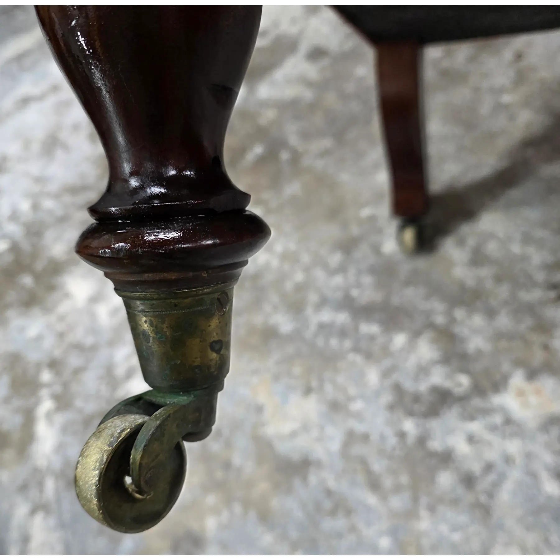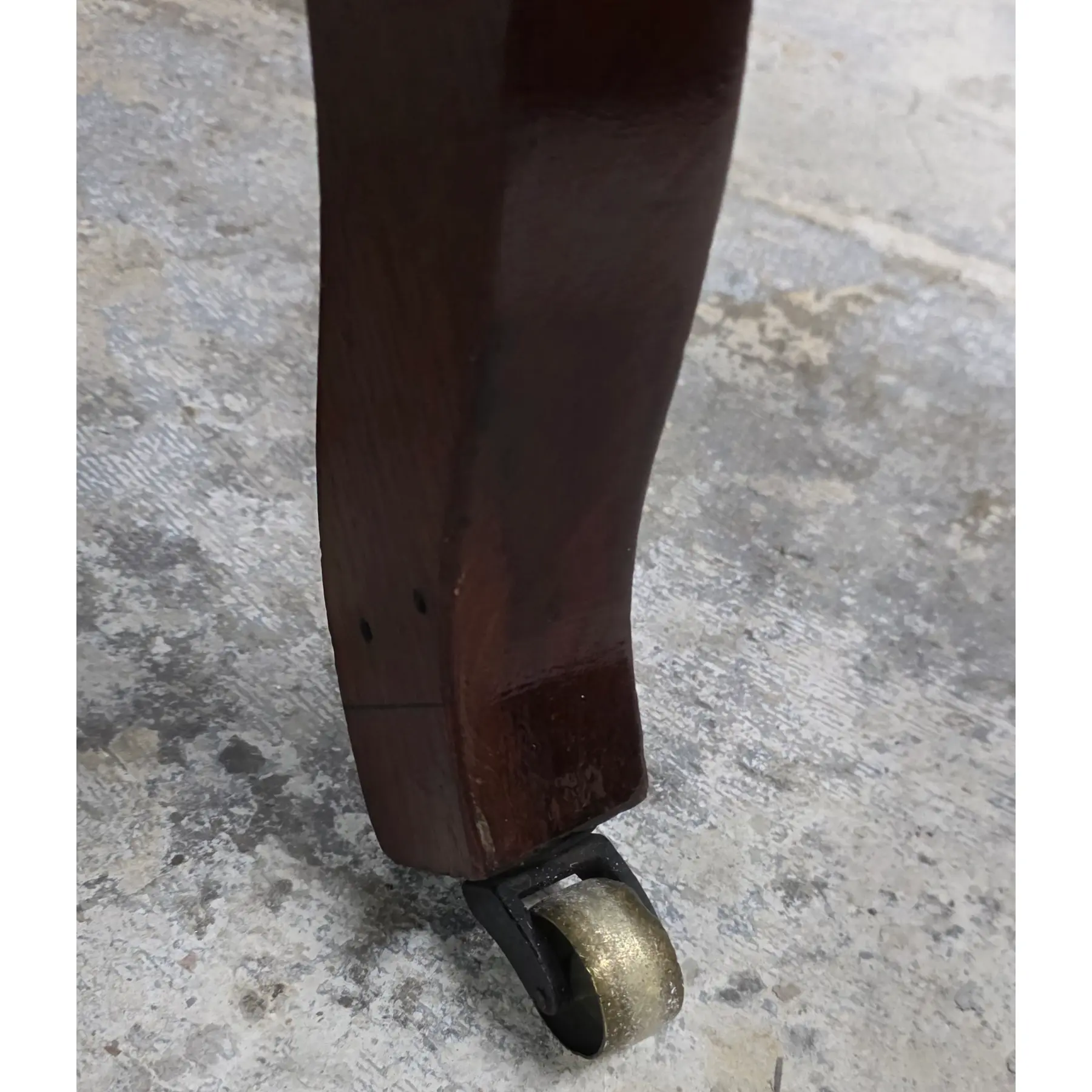 Dark-stained cabriole legs, subtly curved and terminating in brass casters