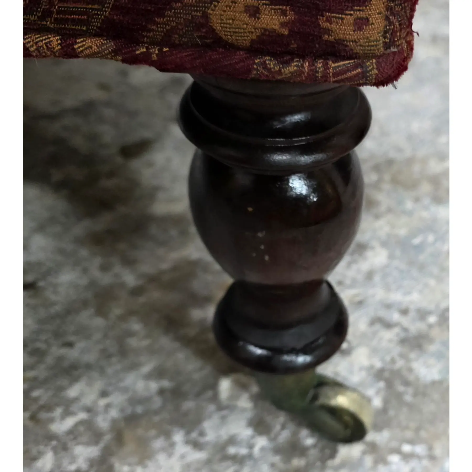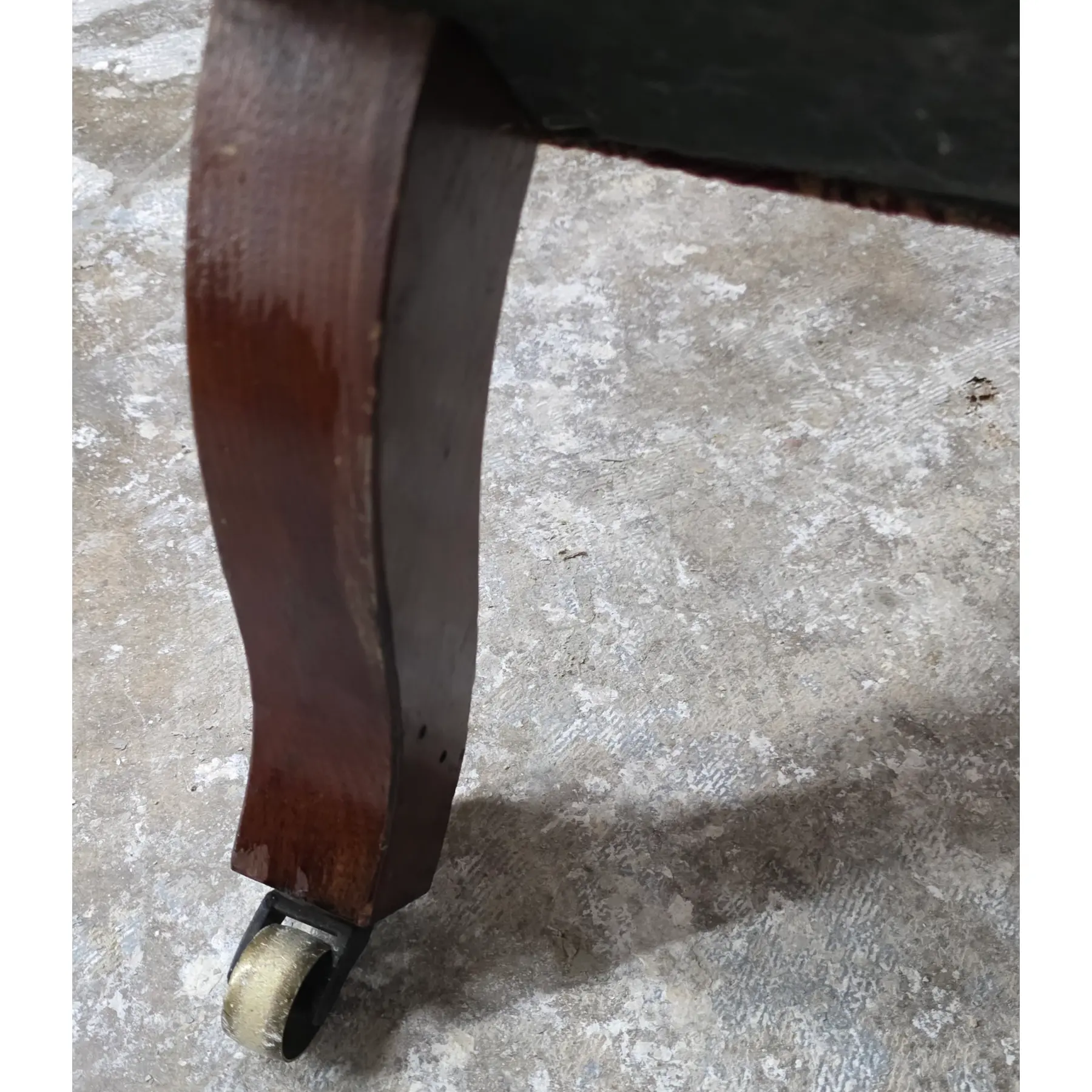 Good vintage condition with signs of age-consistent wear. Upholstery, though not recently applied, presents cleanly with several areas of slightly faded coloration (see photos) and intact pattern definition. Minor surface impressions and light compression visible in seat and back areas consistent with light handling. Lower upholstery edges show sligh irregularity and soft rippling where fabric meets the frame. Wood legs show scattered small surface marks and finish wear consistent with age and handling. One leg shows small darkened spots and finish variation. Overall condition is structurally sound with age-appropriate wear.