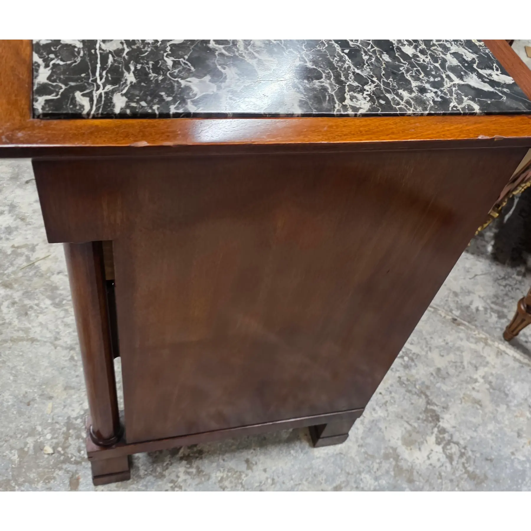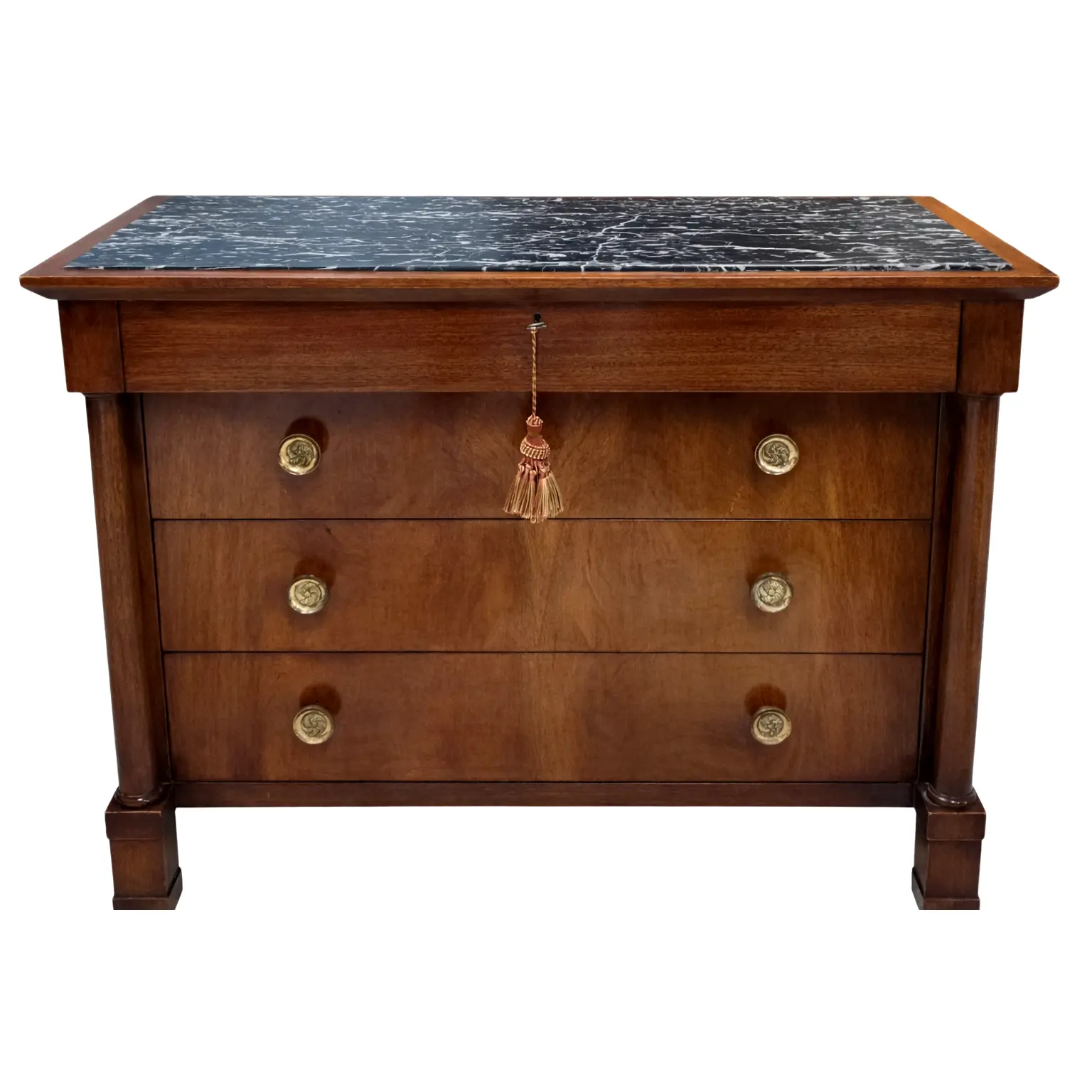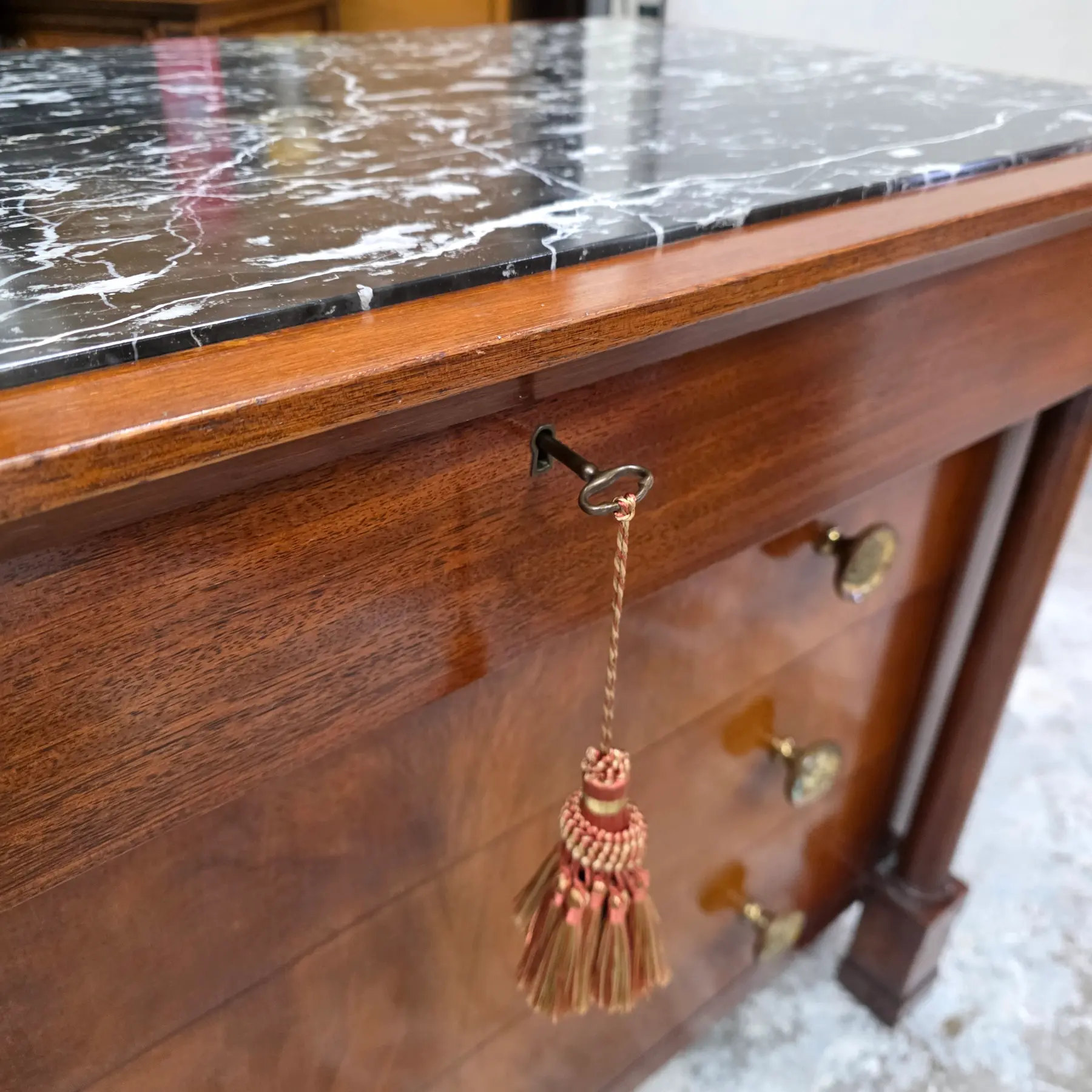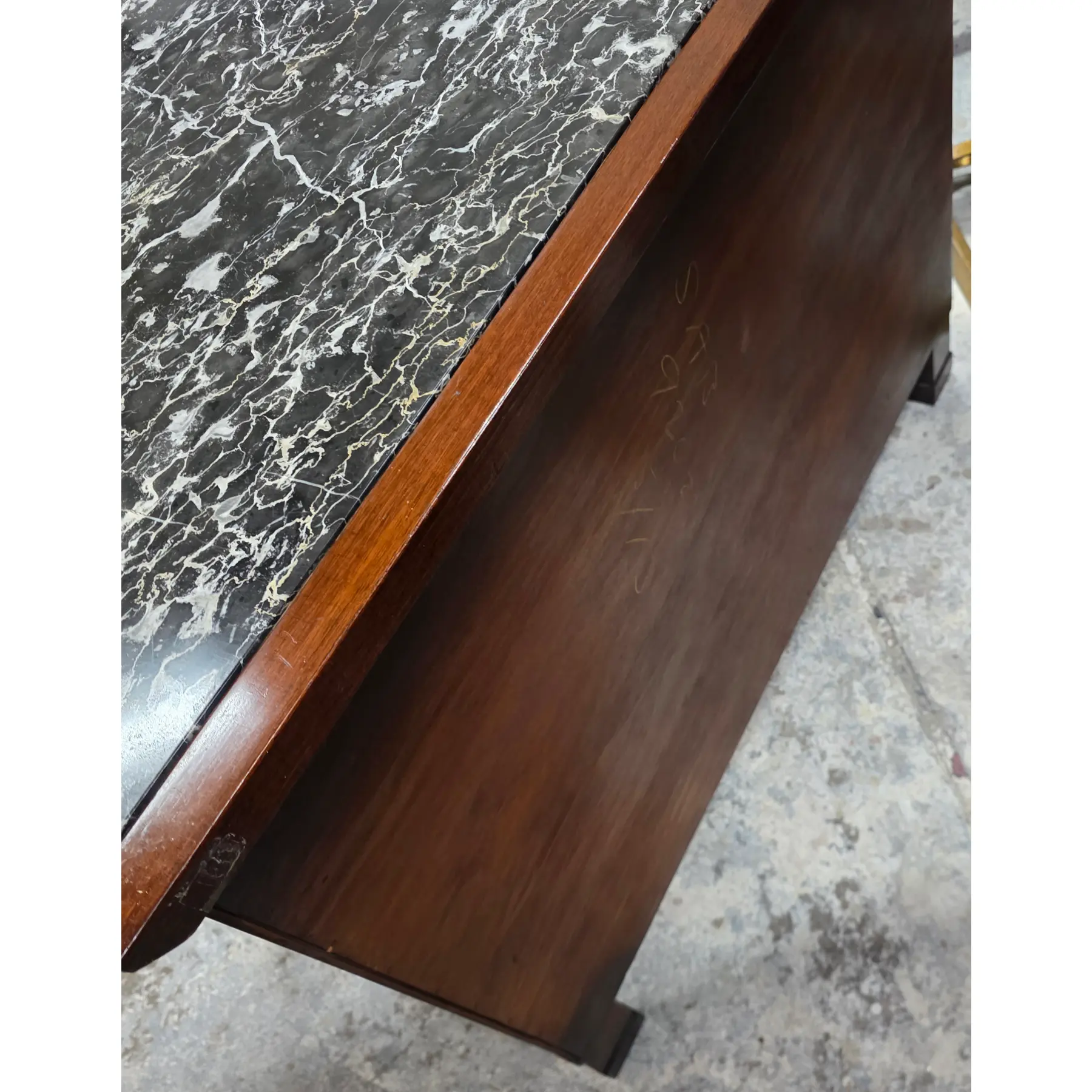 * Very good vintage condition showing light surface scratching along with minor edge wear along portions of the perimeter. Upper wood edge beneath the marble shows small nicks and light abrasions. Upper wood edge beneath marble shows small nicks and light abrasions. Drawer fronts display scattered small finish inconsistincies and minor surface scratches consistent with age and handling. Fluted column fron show minor scuffs and finish wear. Lower plinth base exhibits edge wear, small abrasions and minor finish loss along bottome edge. Side panels and back panel show light surface marks consistent with age. Very minor separation lines at select wood joints consistent with age. Key escutcheon area displays light surrounding wear from use. Interior drawers show light discoloration consistent with age. it.