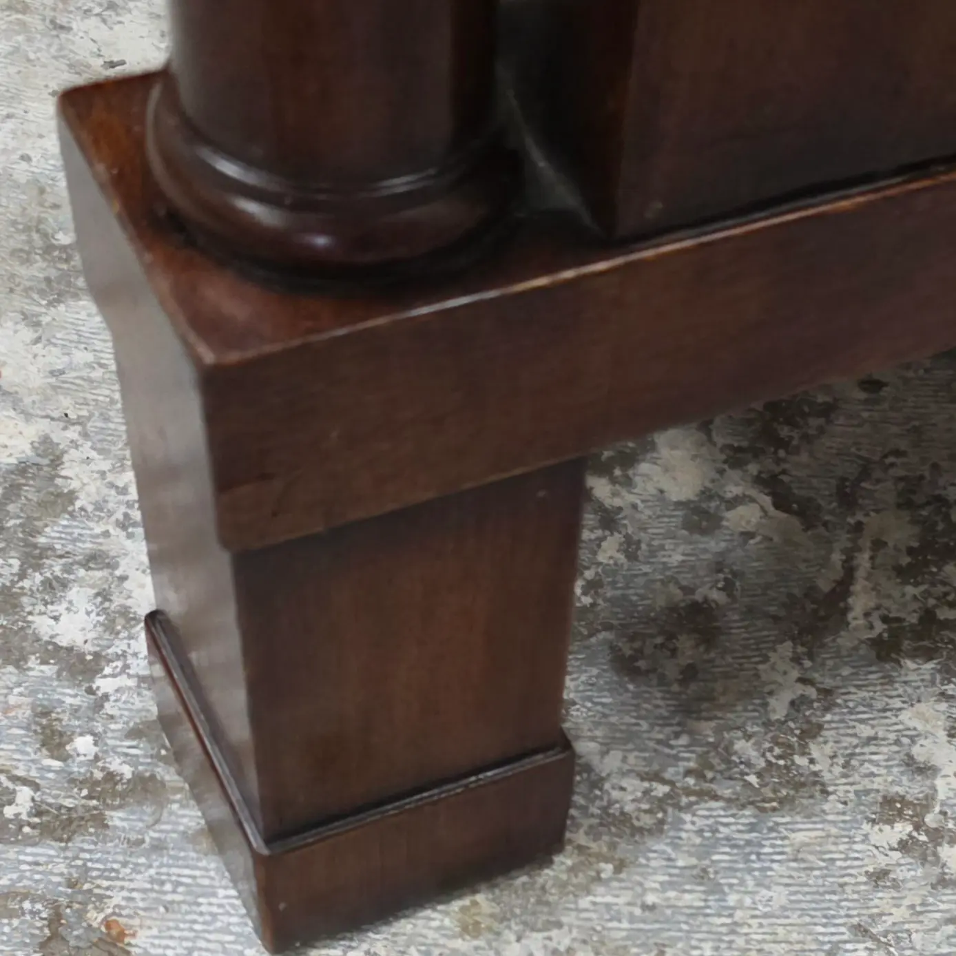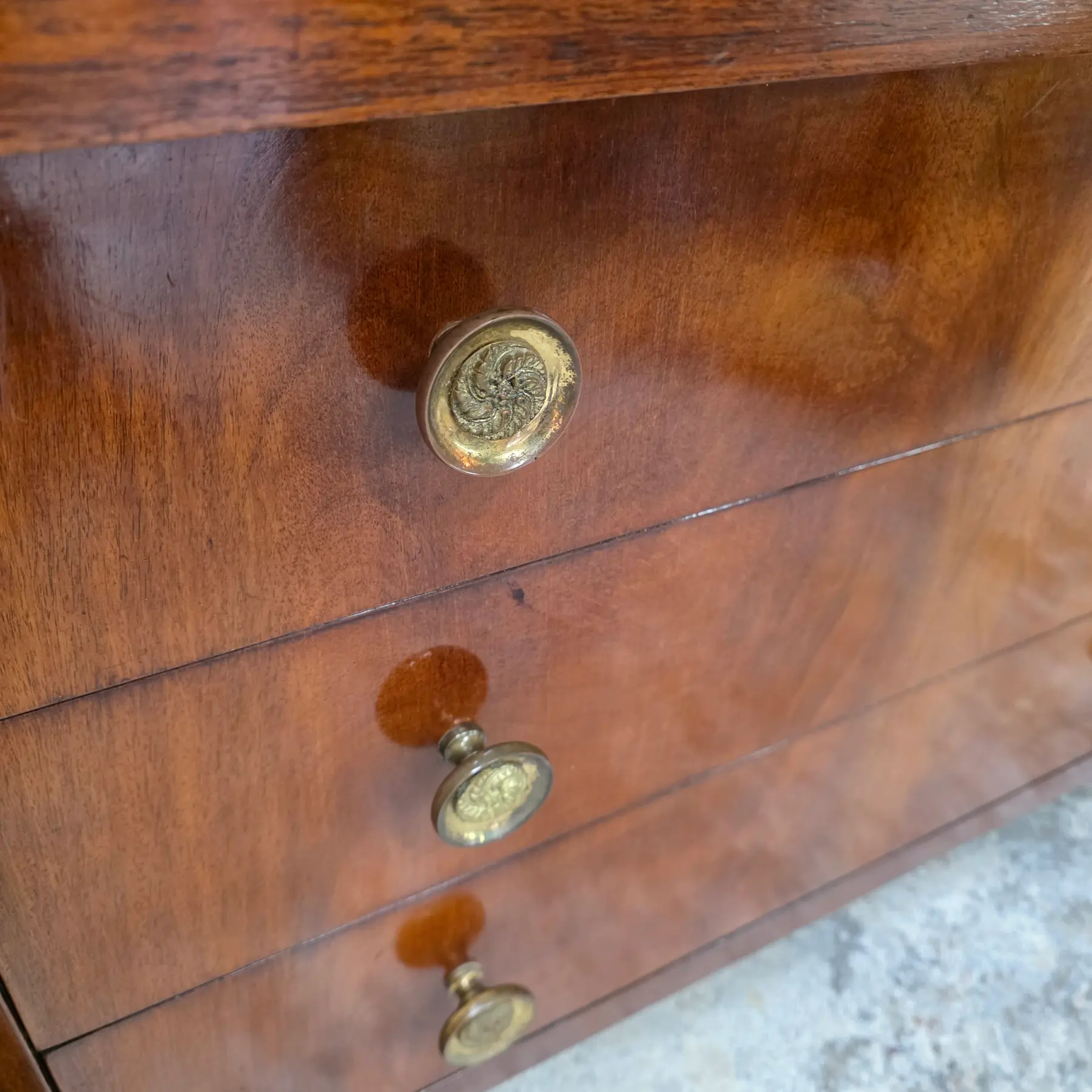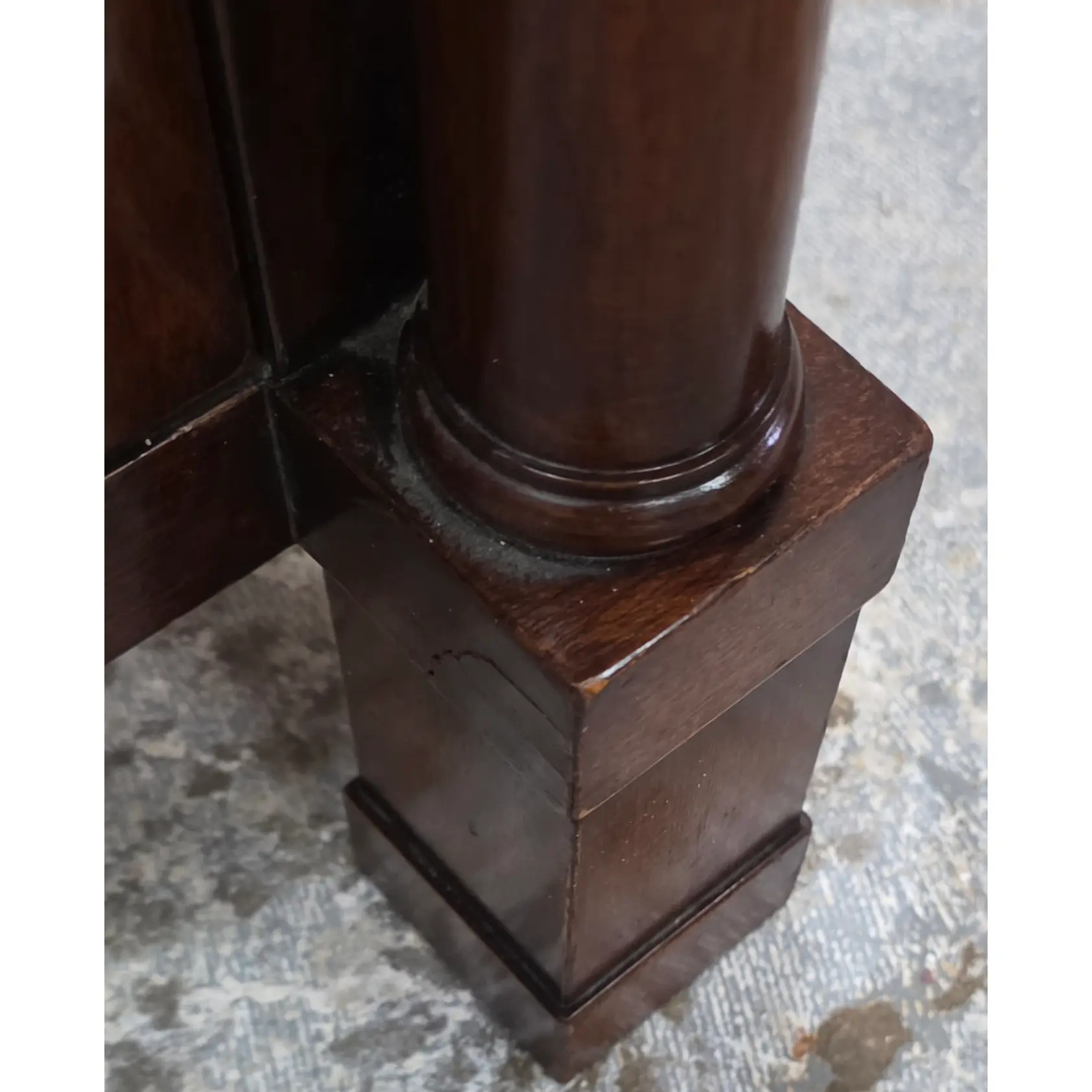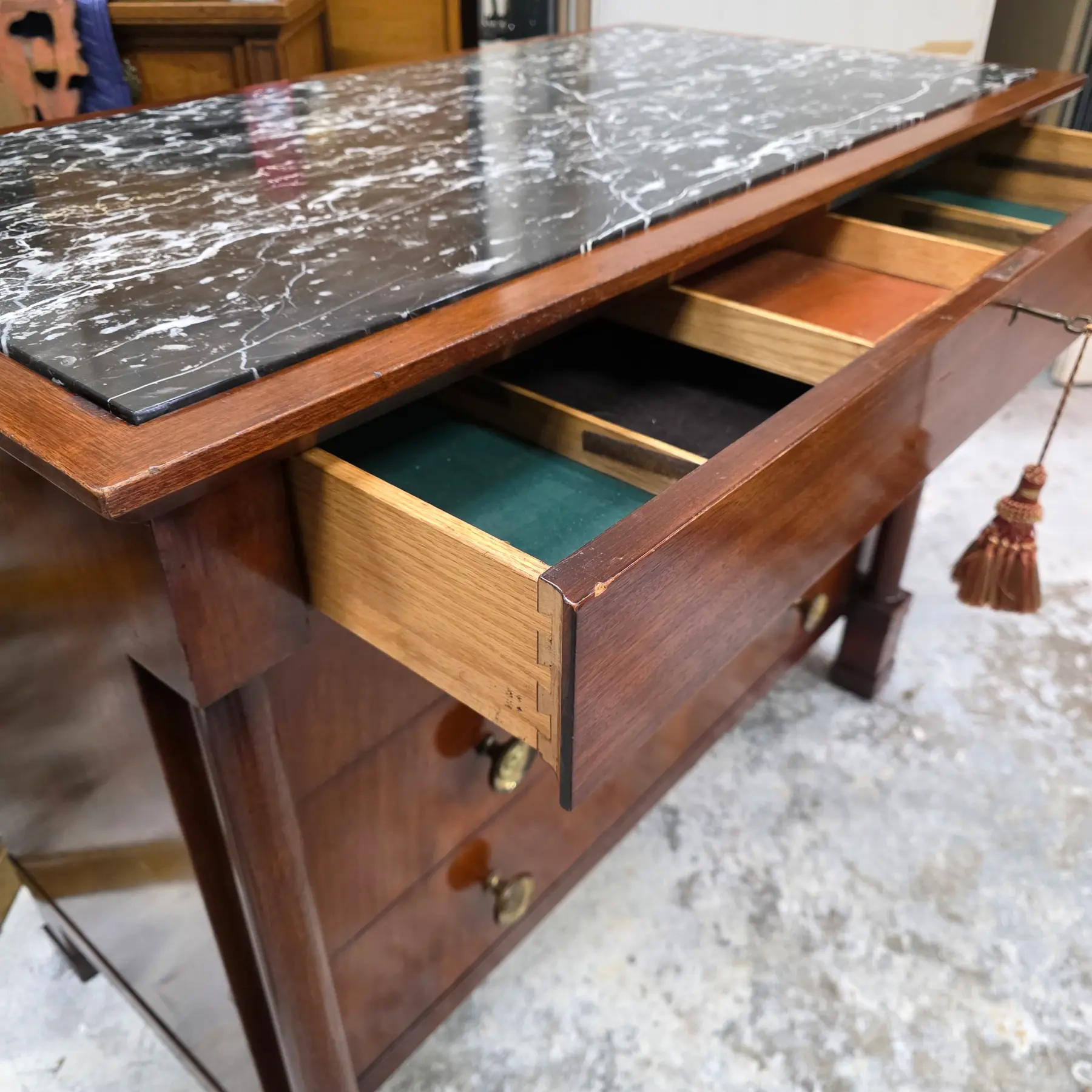 * Very good vintage condition showing light surface scratching along with minor edge wear along portions of the perimeter. Upper wood edge beneath the marble shows small nicks and light abrasions. Upper wood edge beneath marble shows small nicks and light abrasions. Drawer fronts display scattered small finish inconsistincies and minor surface scratches consistent with age and handling. Fluted column fron show minor scuffs and finish wear. Lower plinth base exhibits edge wear, small abrasions and minor finish loss along bottome edge. Side panels and back panel show light surface marks consistent with age. Very minor separation lines at select wood joints consistent with age. Key escutcheon area displays light surrounding wear from use. Interior drawers show light discoloration consistent with age. it.
