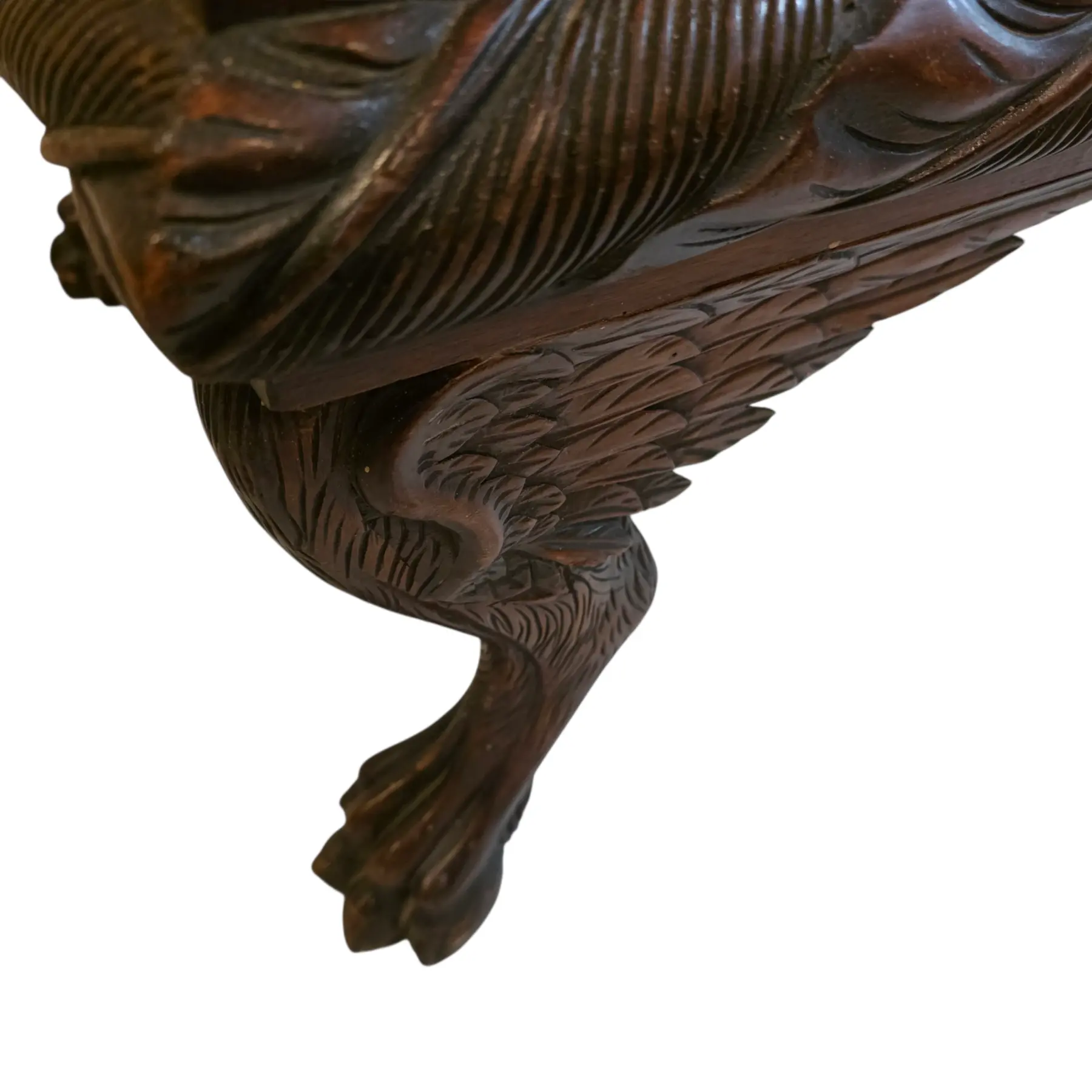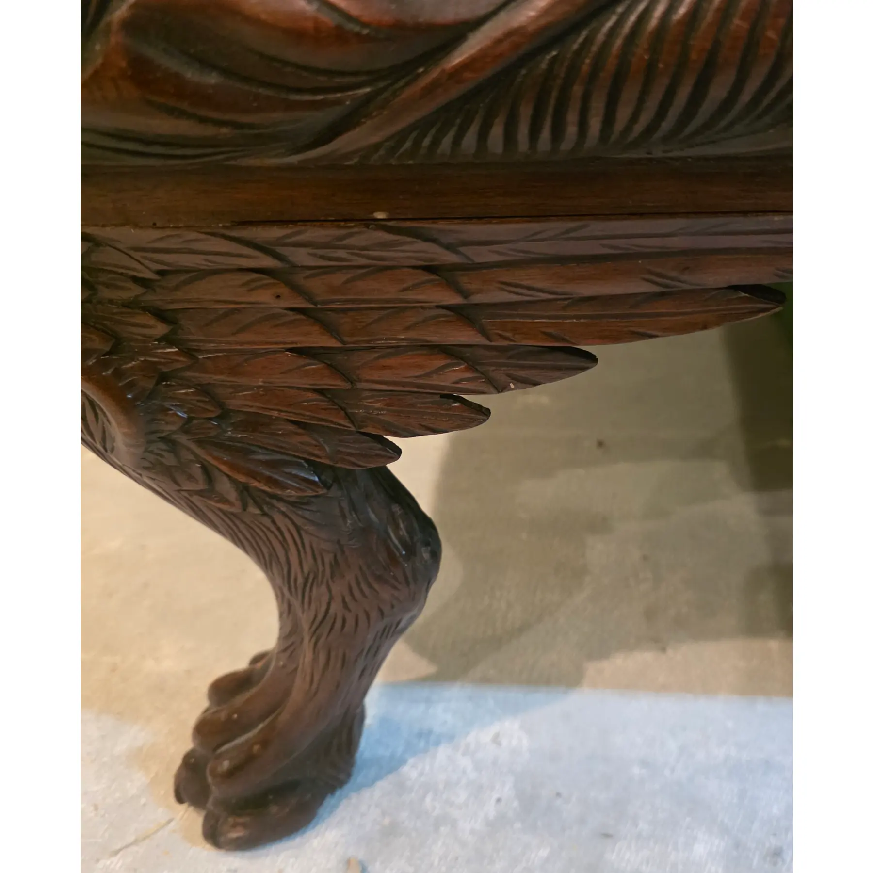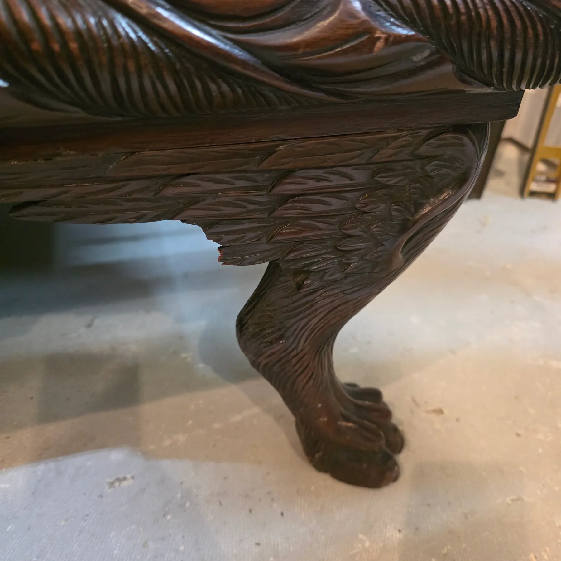 Good antique condition with surface that shows scattered finish wear and abrasions consistent with age and use, including small losses along carved details. Localized areas of wood loss and chipping along carved wing elements and lower carved sections. Carved wing and feather elements exhibit small edge losses. Top and upper molding show surface scuffs, edge wear and small finish inconsistencies. Back panel exhibits age darkening, surface wear and tonal variations. Structurally sound. Condition reflects authentic age-related wear.