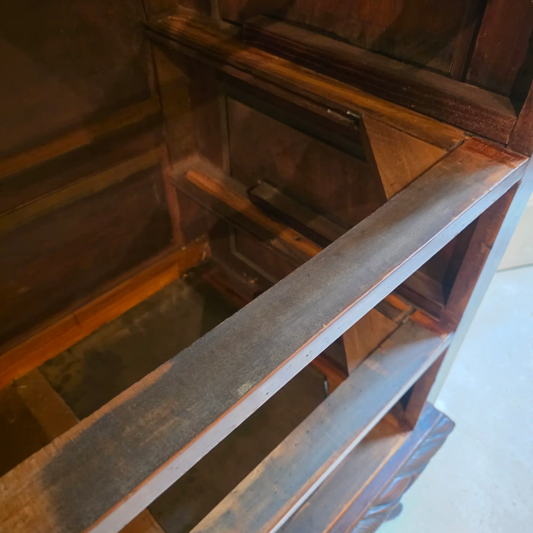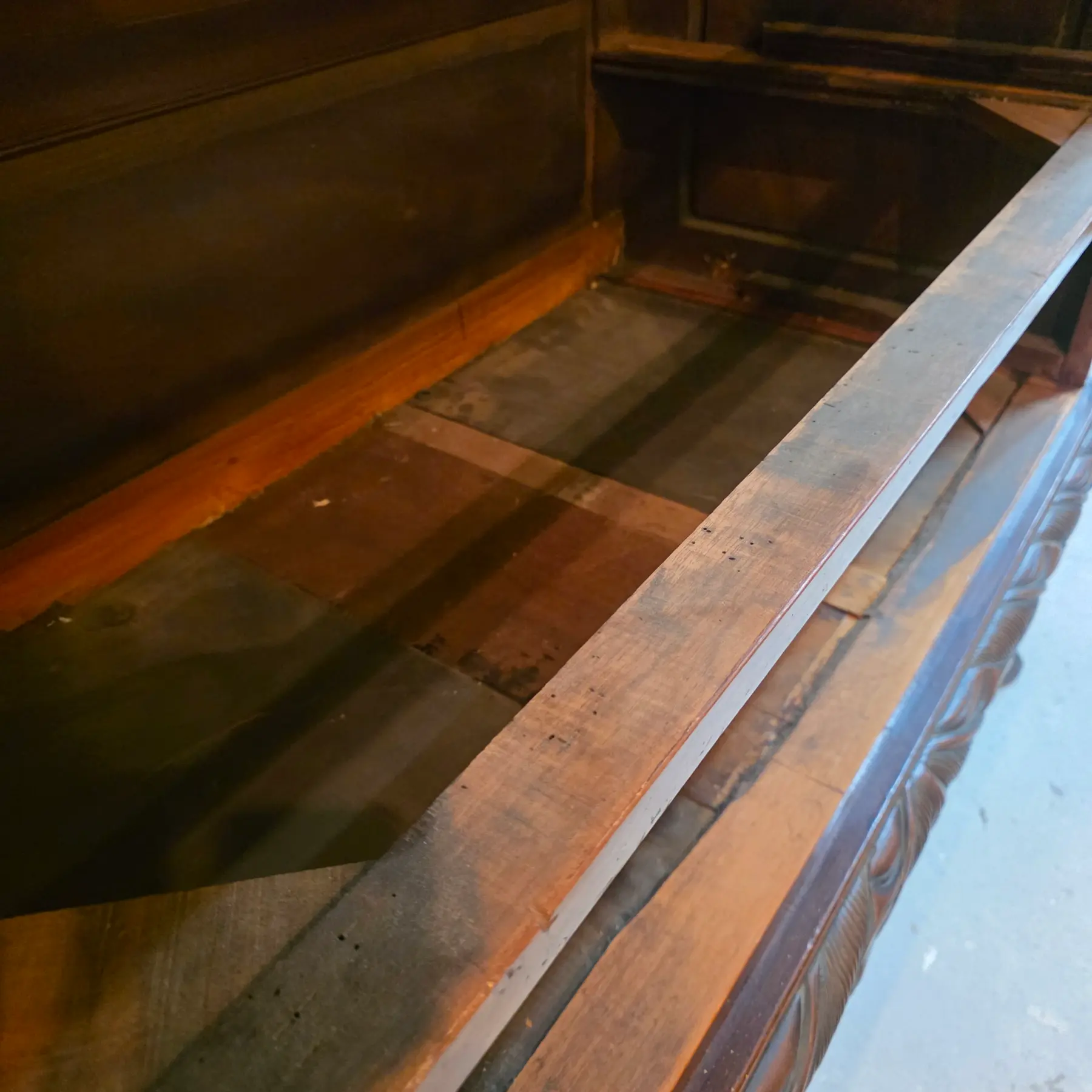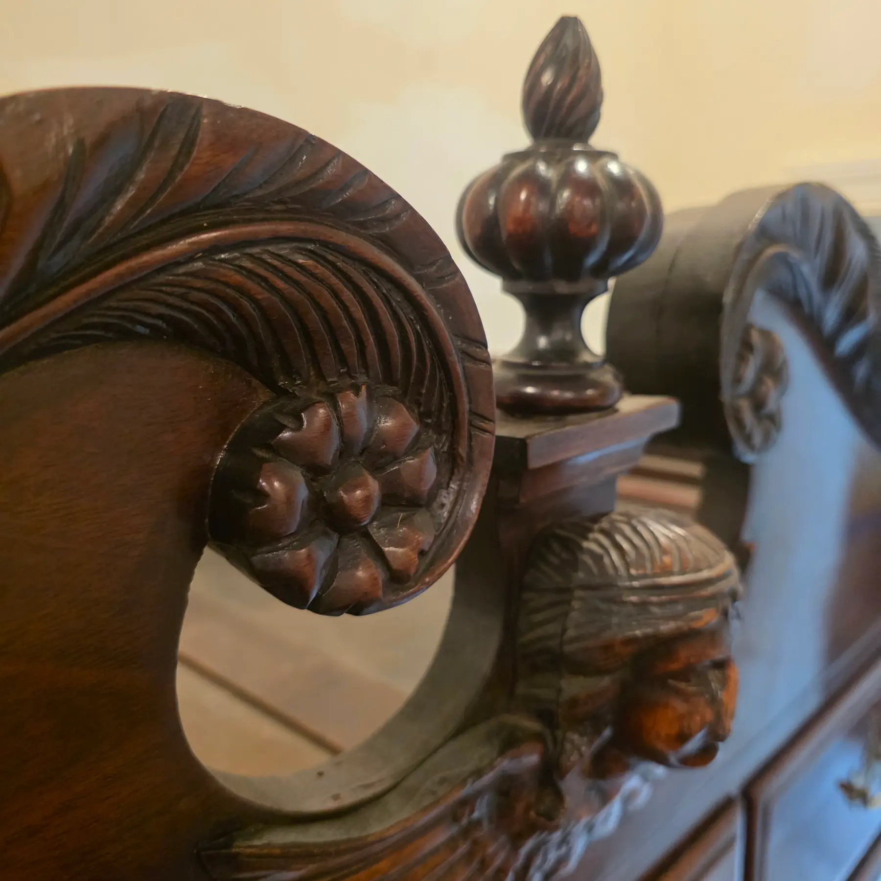 Good antique condition with surface that shows scattered finish wear and abrasions consistent with age and use, including small losses along carved details. Localized areas of wood loss and chipping along carved wing elements and lower carved sections. Carved wing and feather elements exhibit small edge losses. Top and upper molding show surface scuffs, edge wear and small finish inconsistencies. Back panel exhibits age darkening, surface wear and tonal variations. Structurally sound. Condition reflects authentic age-related wear.
