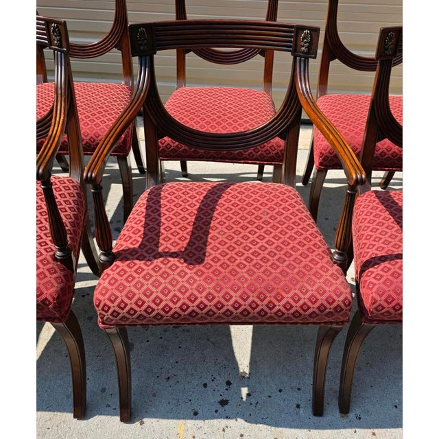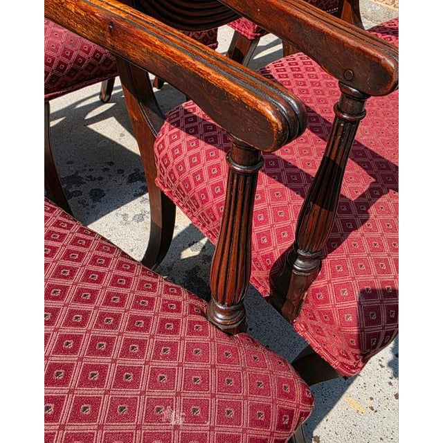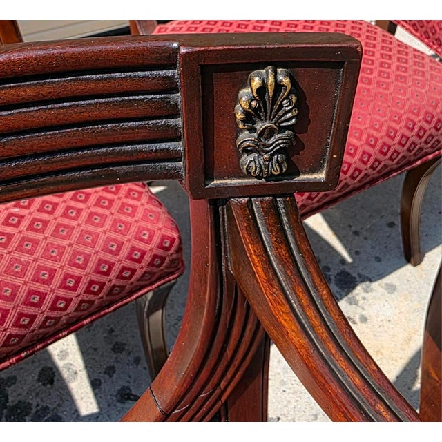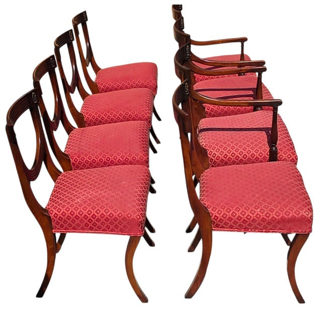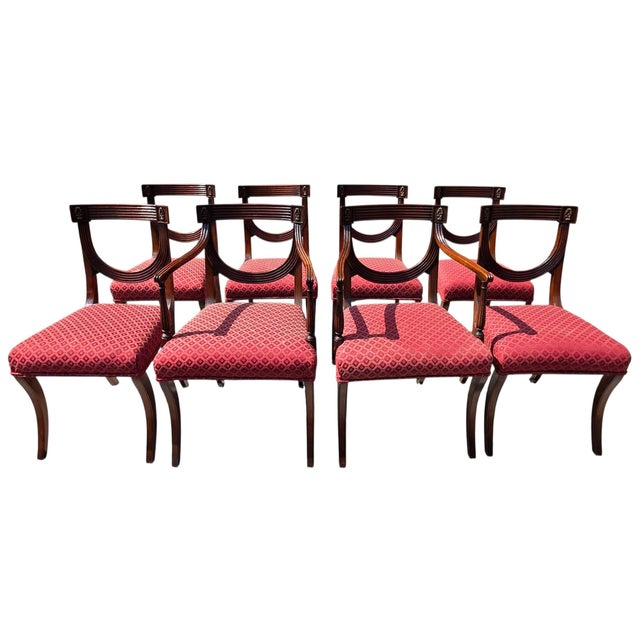 A striking ensemble of eight late 19th century Regency Revival dining chairs, this set artfully reinterprets classical elegance with masterful craftsmanship and sculptural grace