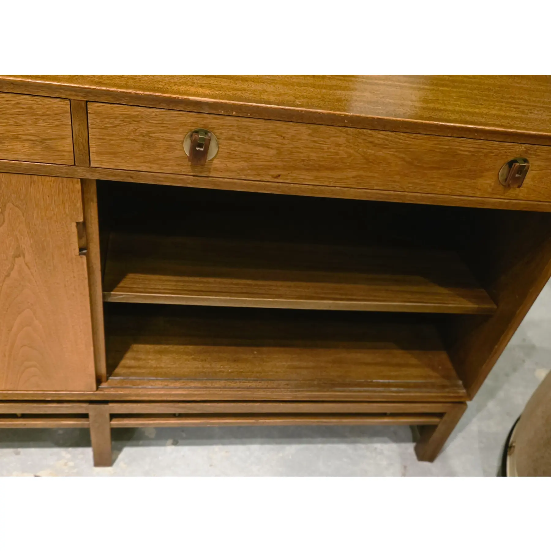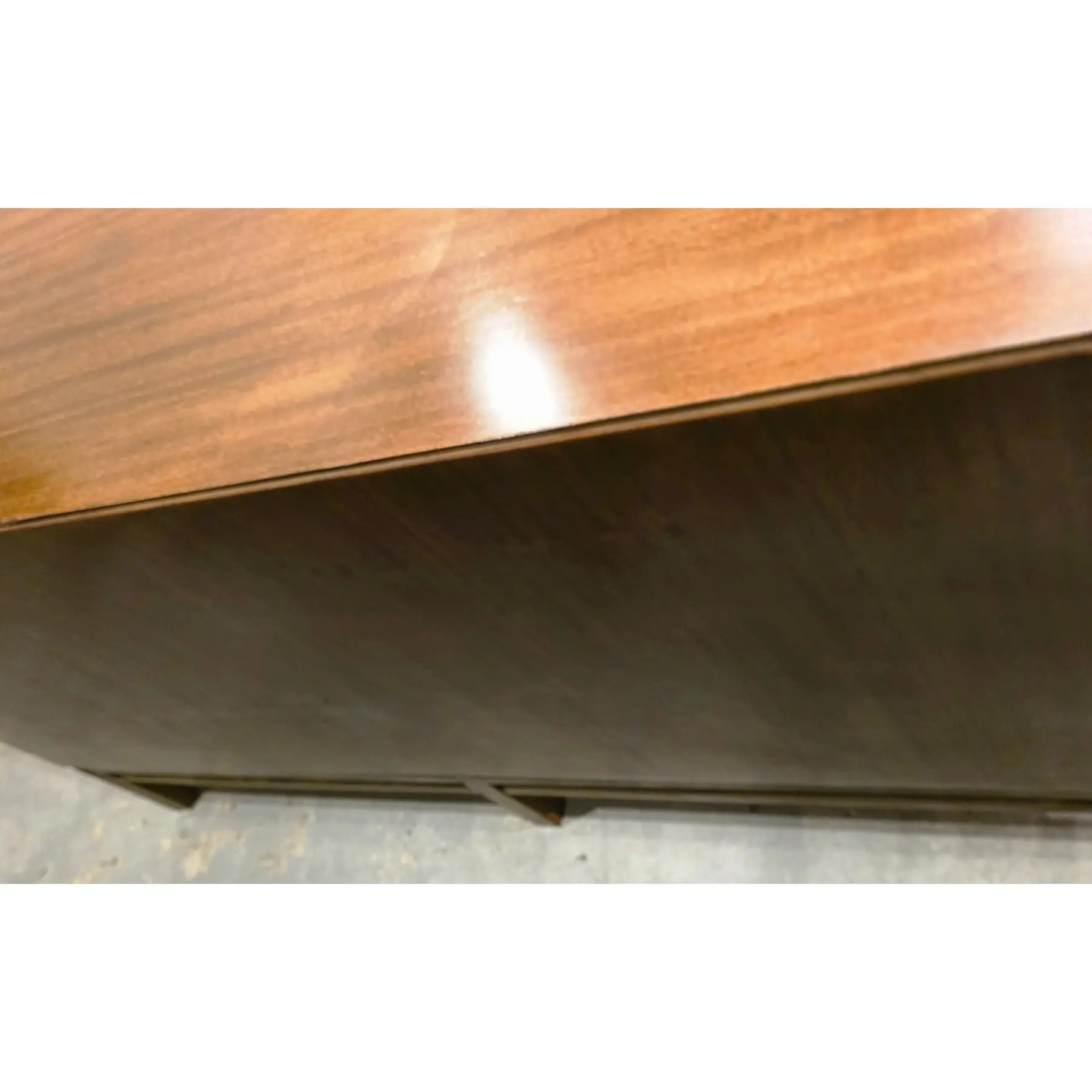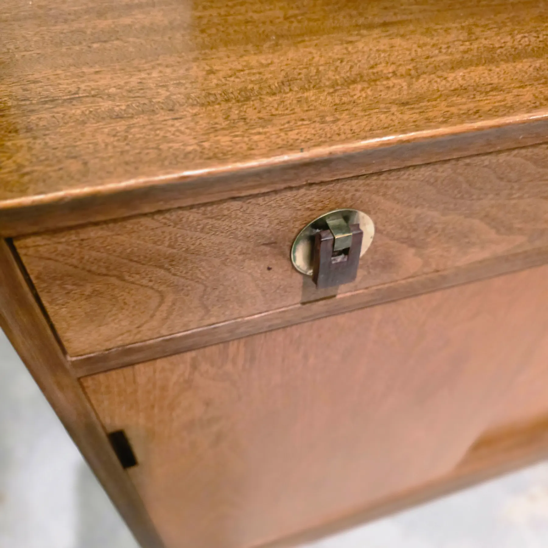 Very good vintage condition consistent with age and careful use. Top surface shows light surface scratches, fine scuffs, and minor finish abrasions consistent with normal use and age. Edges and corners exhibit minor softening and a small nick along the back edge and corners. A 4″ scratch on the left side. Drawer fronts and cabinet doors also show scattered light marks and small scratches, while the base and lower stretchers display light wear consistent with floor contact and movement over time. Hardware shows age-appropriate patina and minor wear.