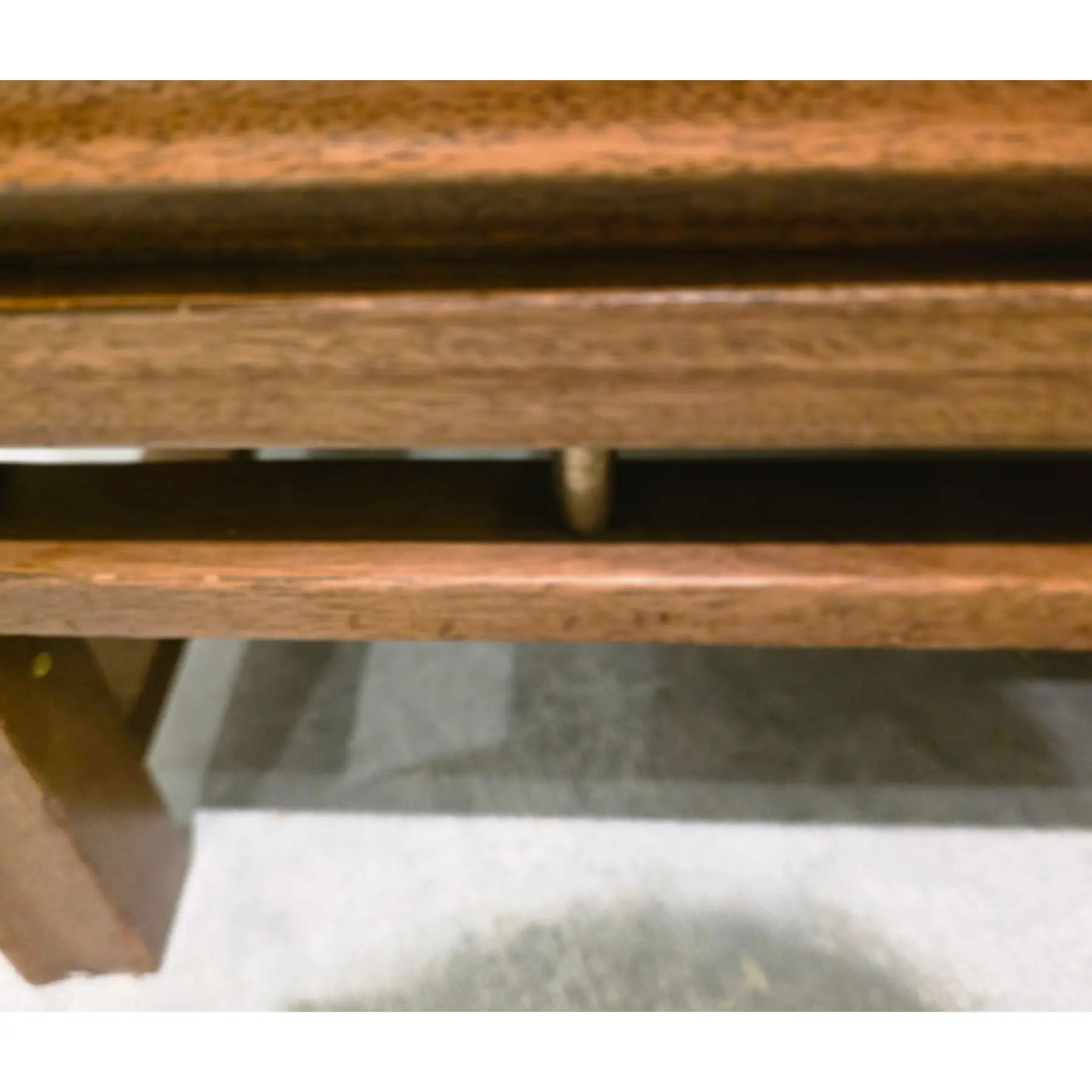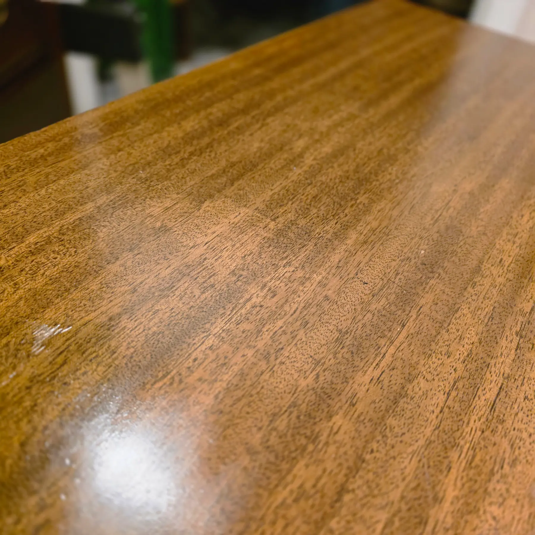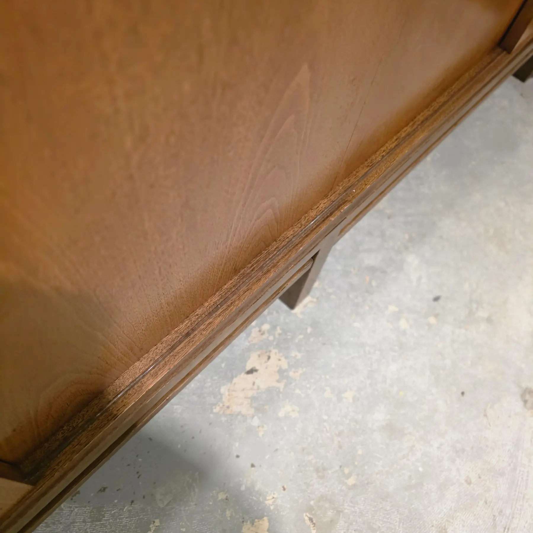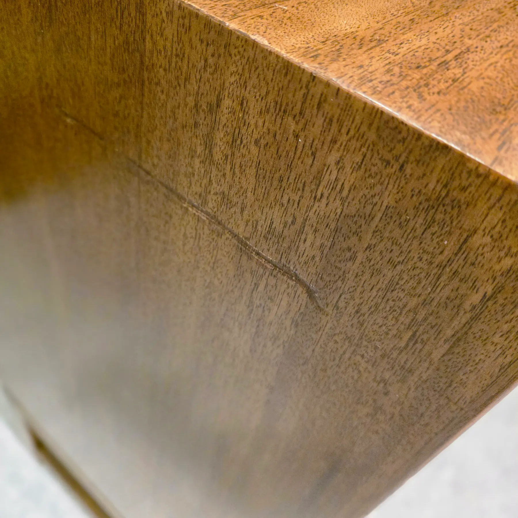 Very good vintage condition consistent with age and careful use. Top surface shows light surface scratches, fine scuffs, and minor finish abrasions consistent with normal use and age. Edges and corners exhibit minor softening and a small nick along the back edge and corners. A 4″ scratch on the left side. Drawer fronts and cabinet doors also show scattered light marks and small scratches, while the base and lower stretchers display light wear consistent with floor contact and movement over time. Hardware shows age-appropriate patina and minor wear.