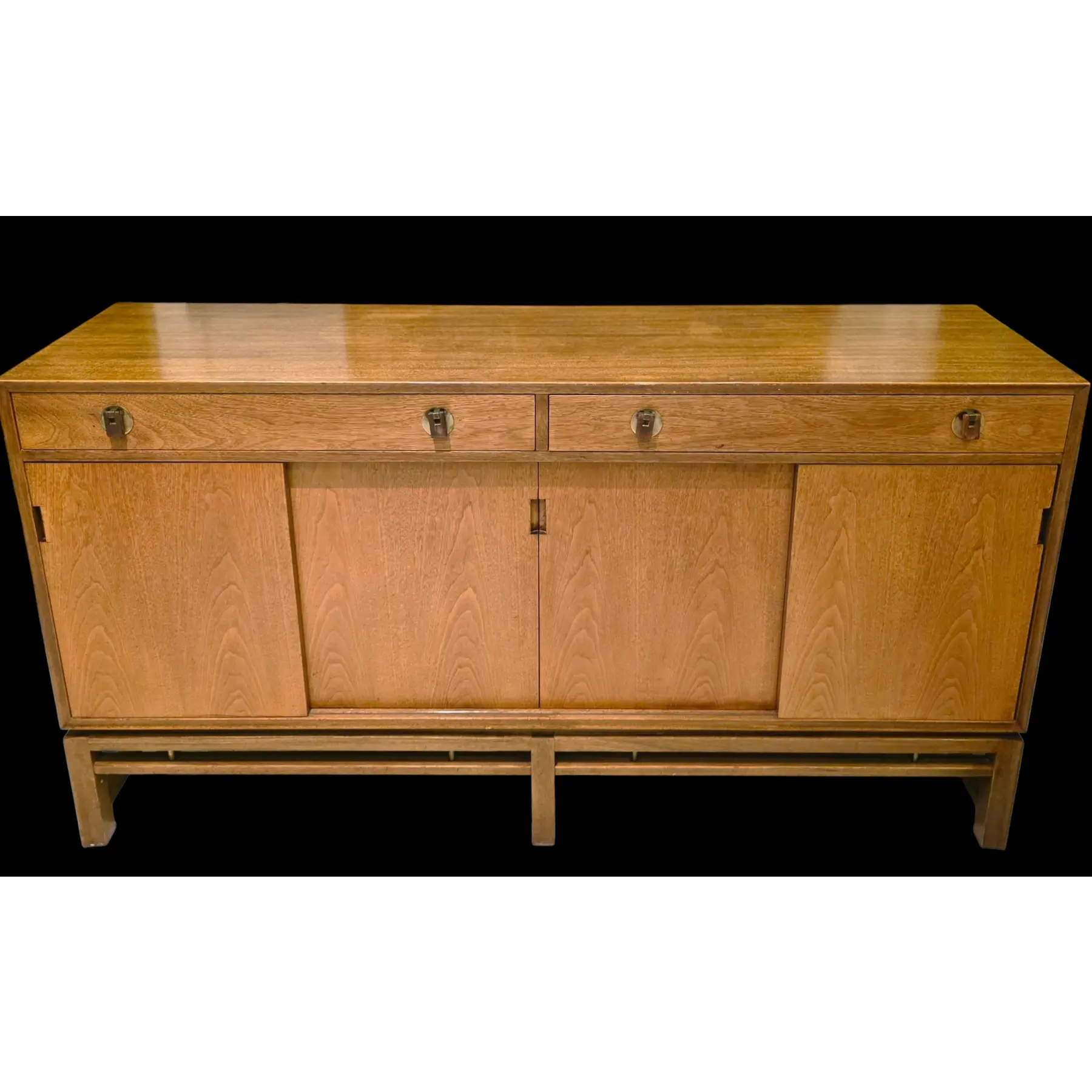 Upper drawer configuration includes four fitted drawers and sculptural pulls with circular brass backplates, with inset wooden tabs and brass accents