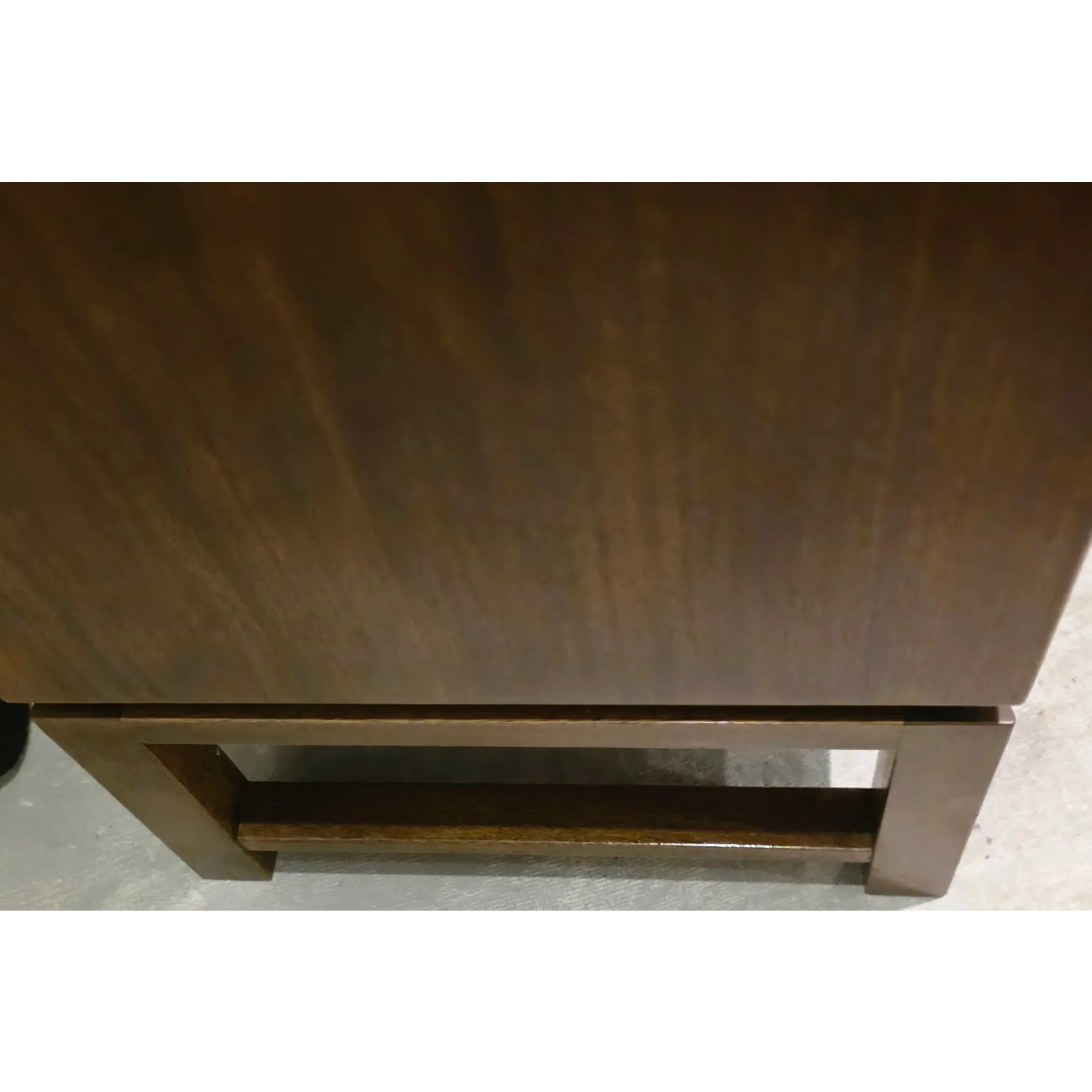 Rectilinear silhouette with a broad and visually expansive top surface and rear and side panels with a wood grain that runs horizontally and is evenly matched