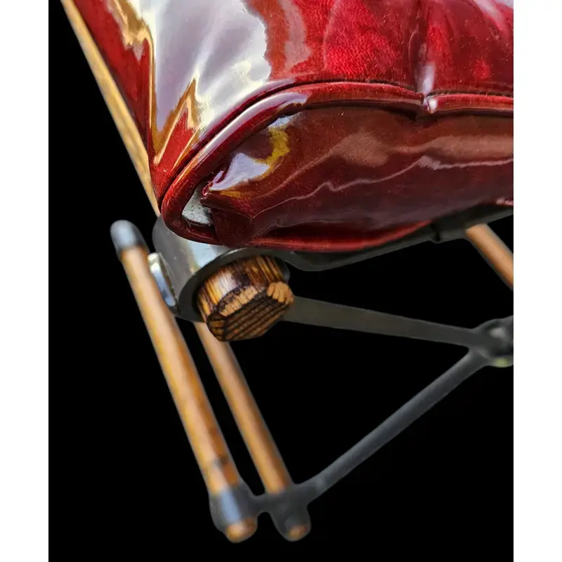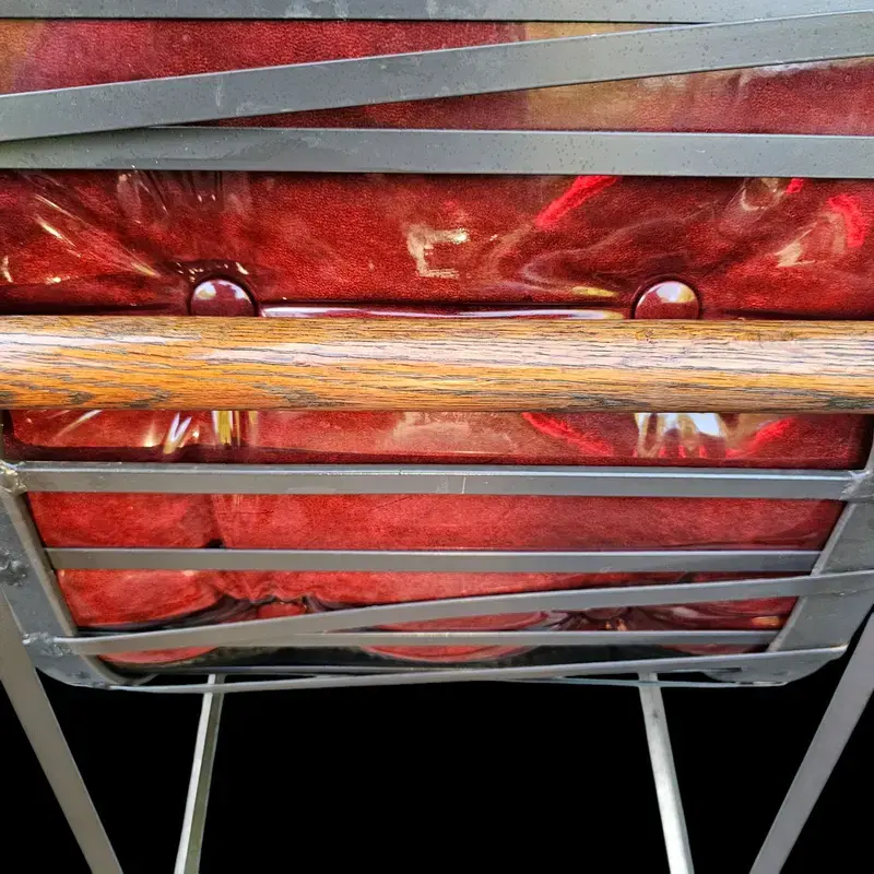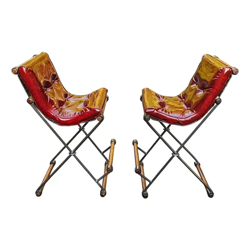 Mid 20th Century Pair of Campaign “X” Wrought Iron and Oak Bar Stools by Cleo Baldon for Terra of California