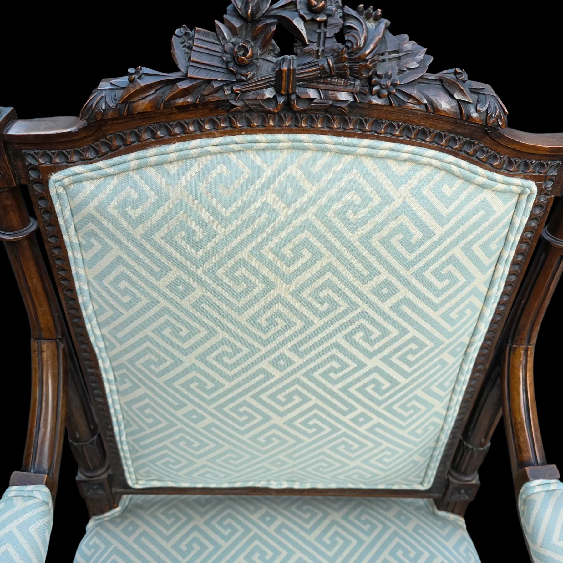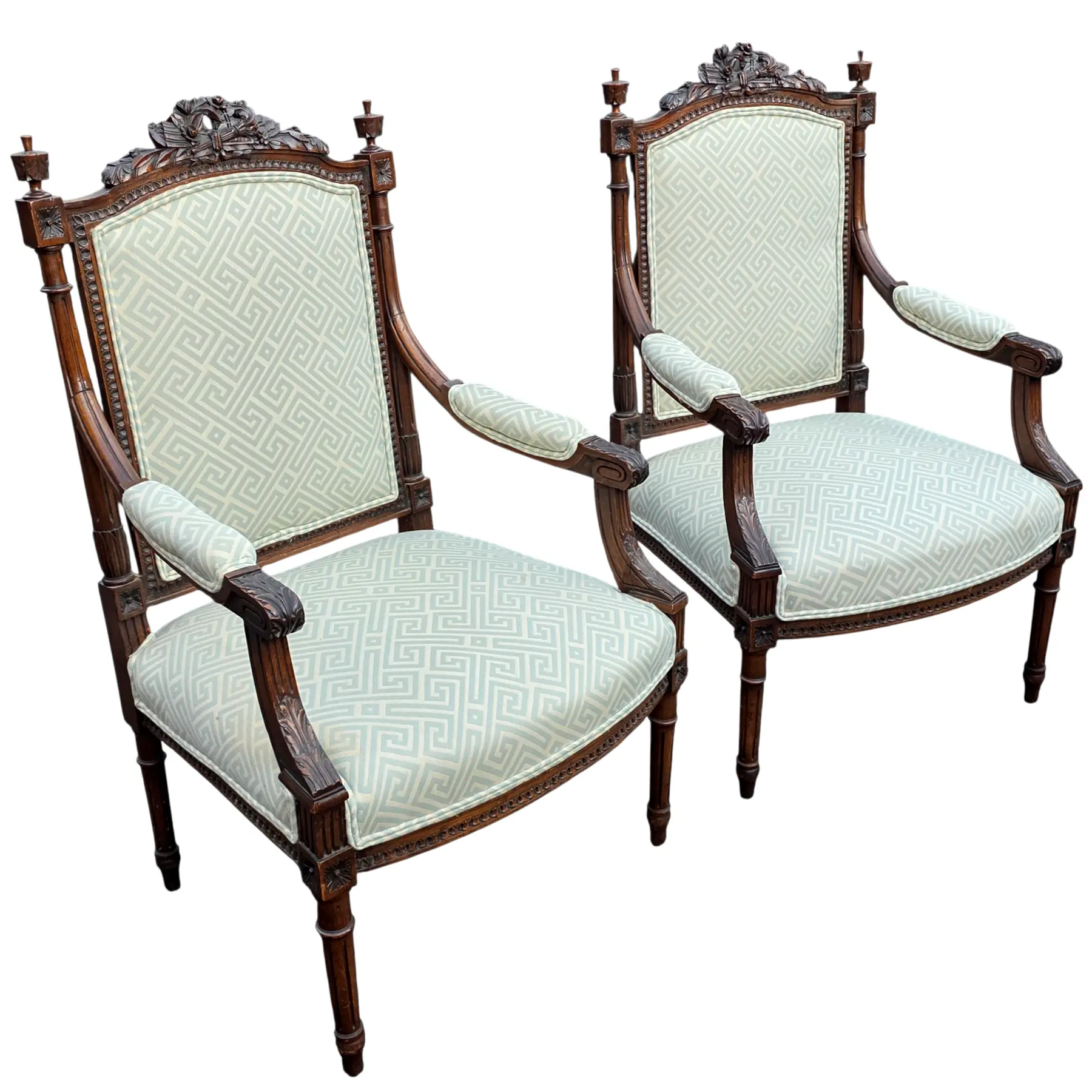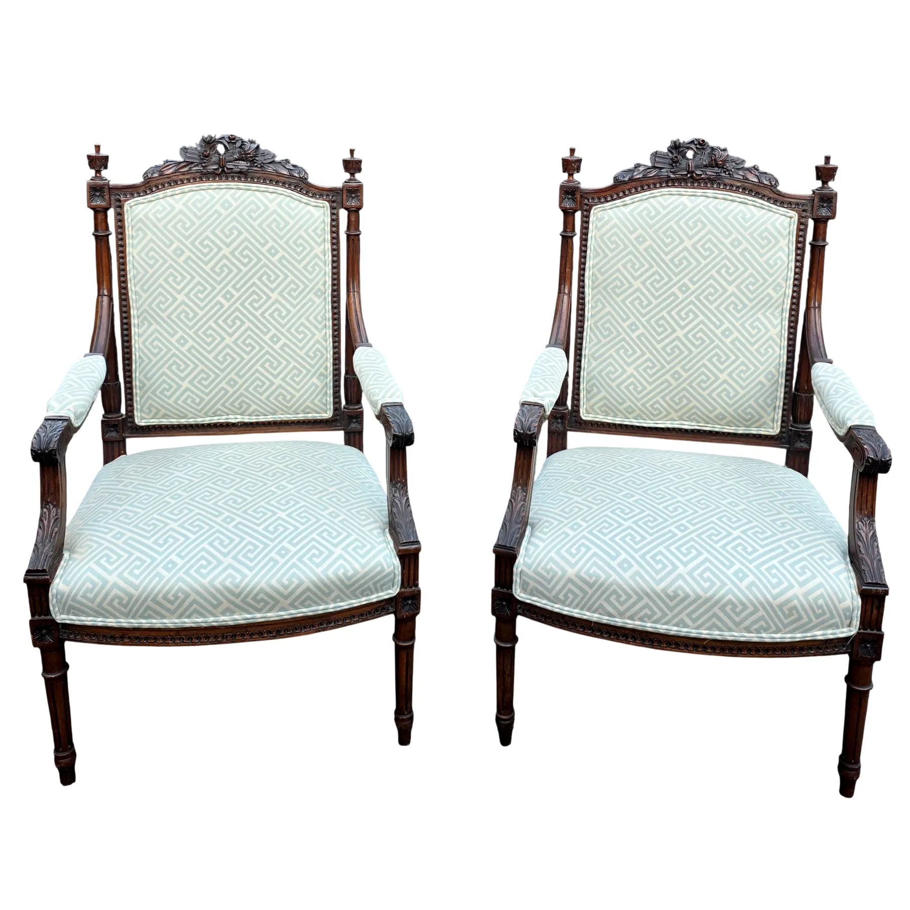 This Pair of antique French Louis XVI–style Hand-CArved Armchairs has classical detailing that gives them a refined balance of sculptural woodwork and tailored upholstery and makes them elgant and decoratively appealing for a variety of interior settings and styles. f
