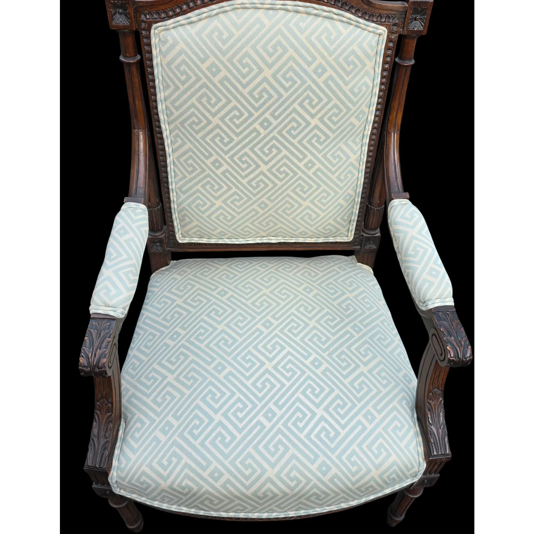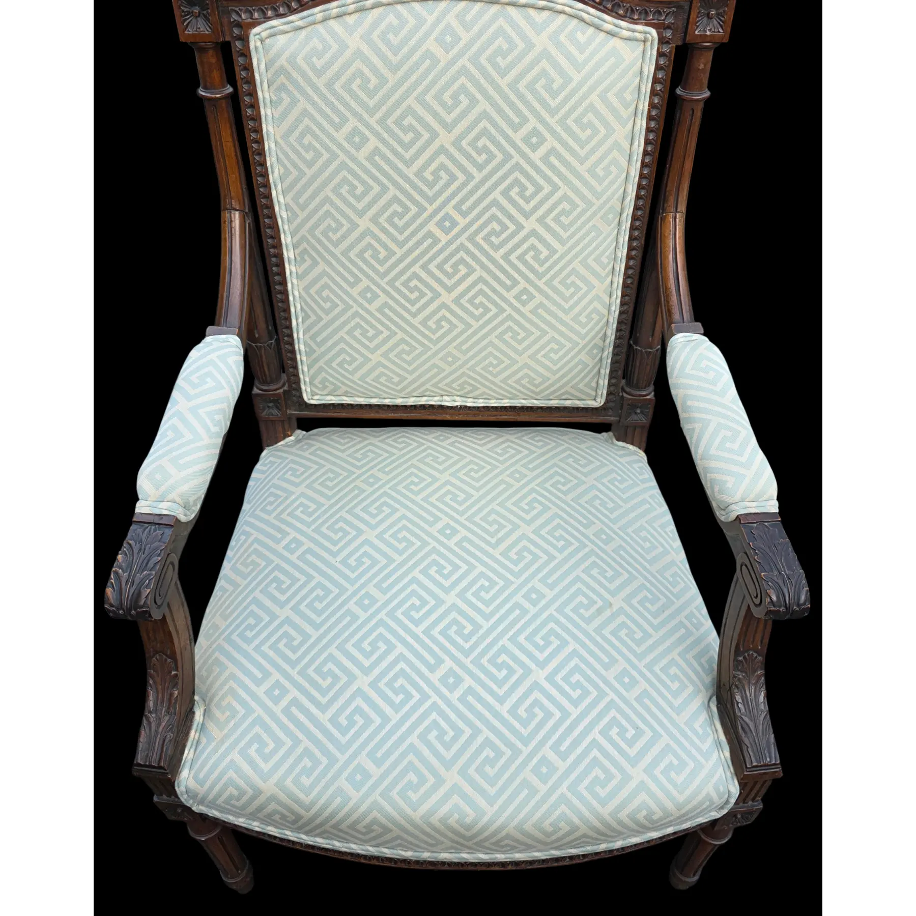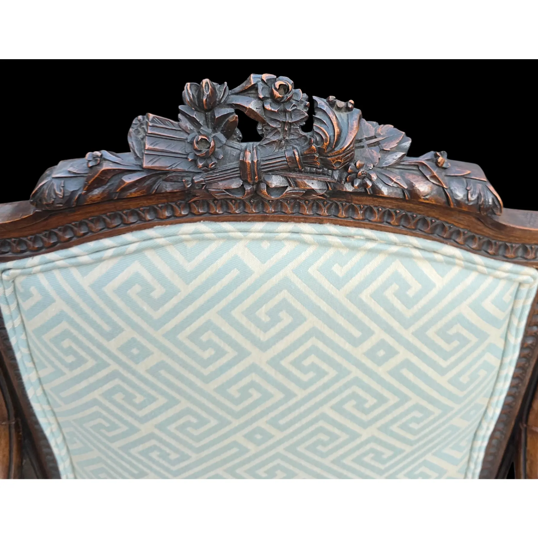 This Pair of antique French Louis XVI–style Hand-CArved Armchairs has classical detailing that gives them a refined balance of sculptural woodwork and tailored upholstery and makes them elgant and decoratively appealing for a variety of interior settings and styles. f