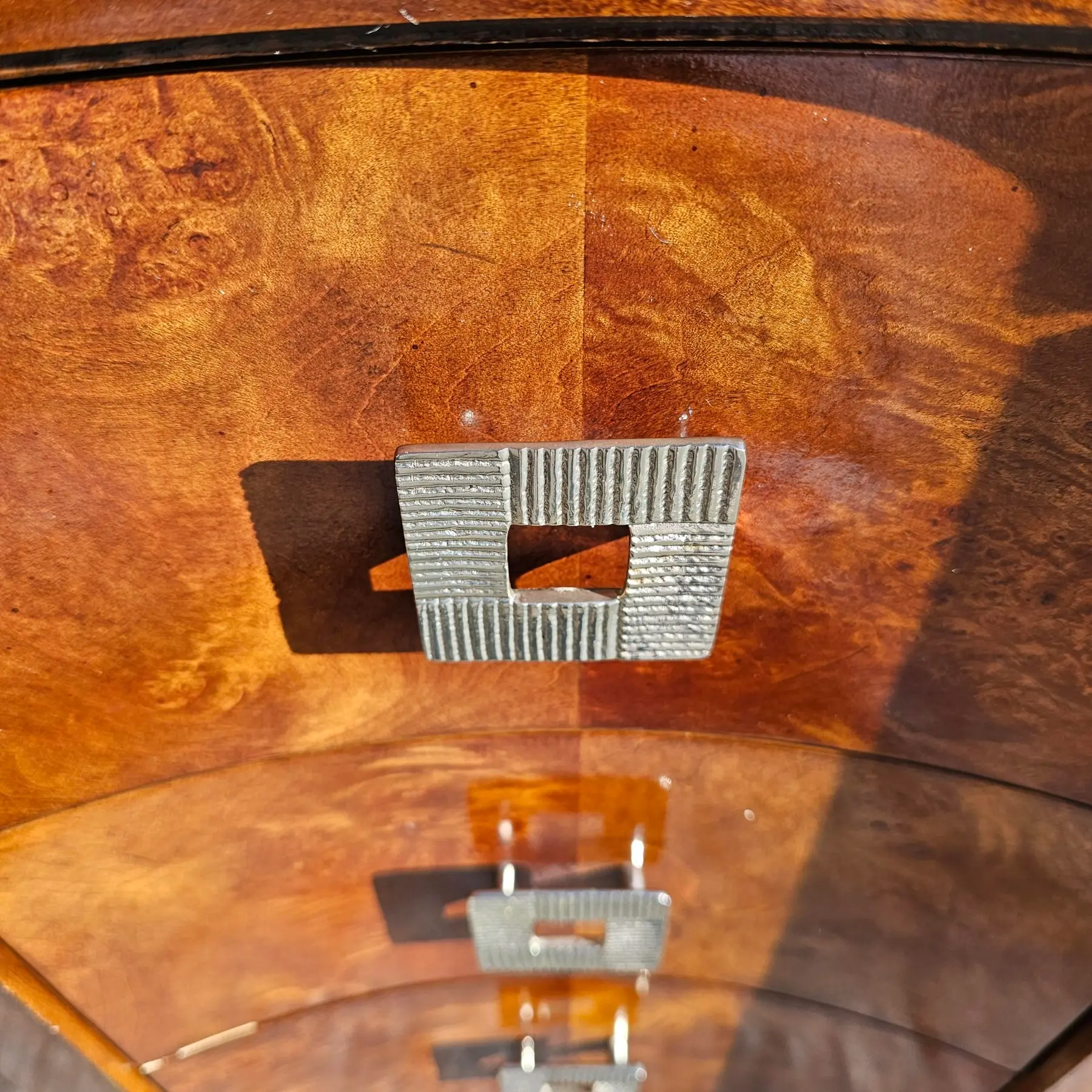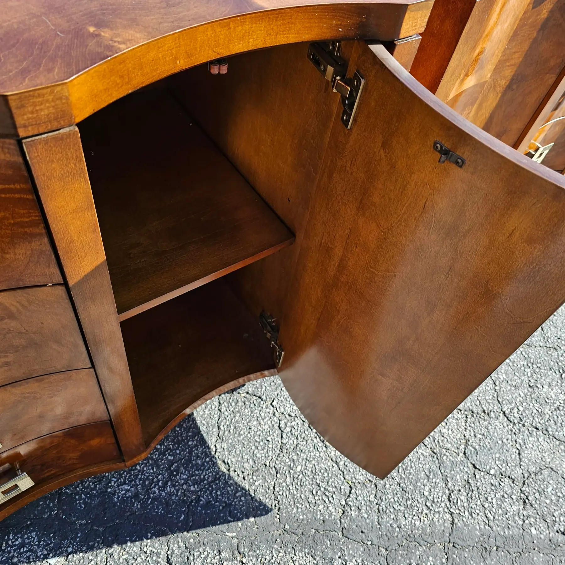 Central bank of four convex drawers flanked by curved cabinet doors on either side