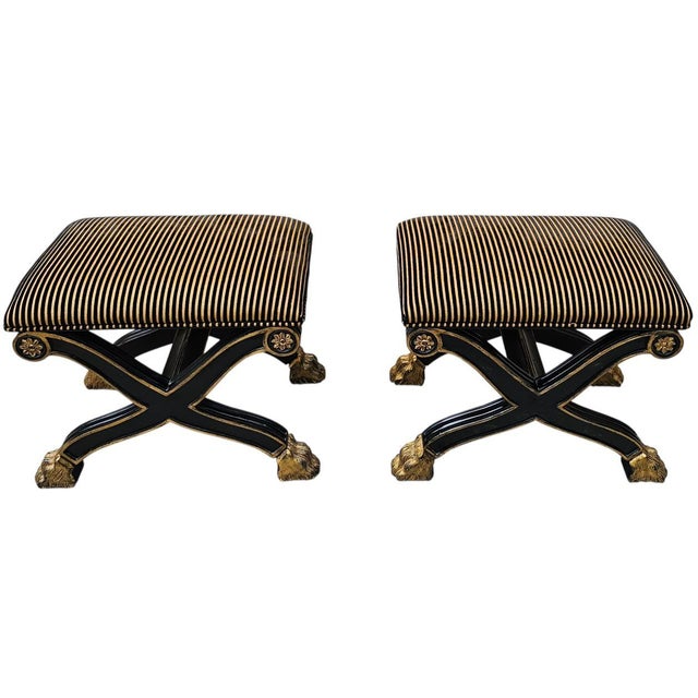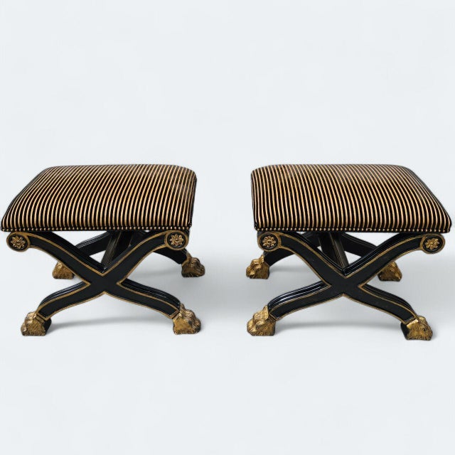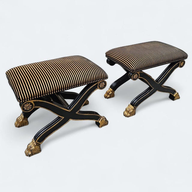 This Pair of Century Furniture Neoclassical X-Form Curule Consulate (French) Benches (Unsigned) blends Roman Empire design with the timeless elegance of furnishings.