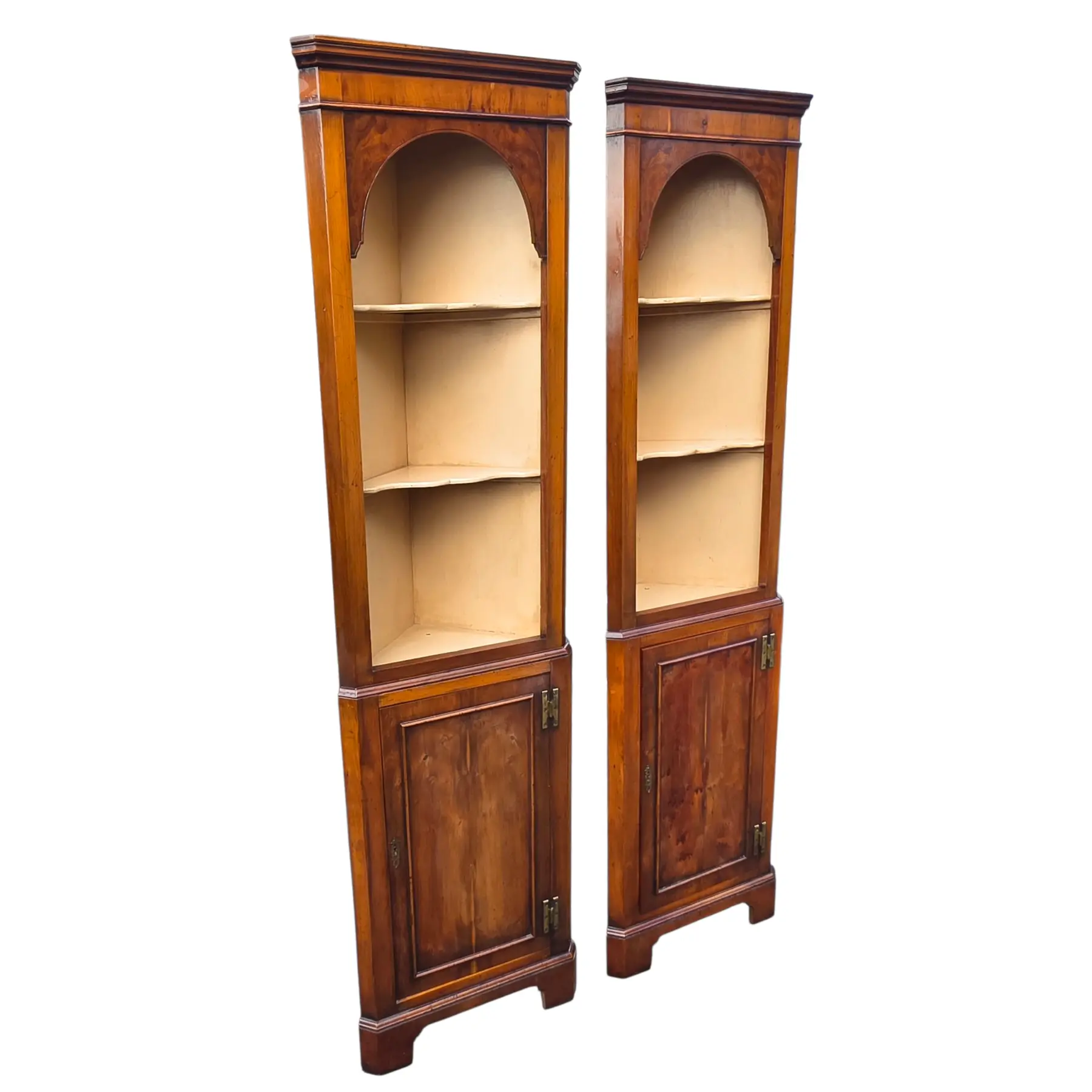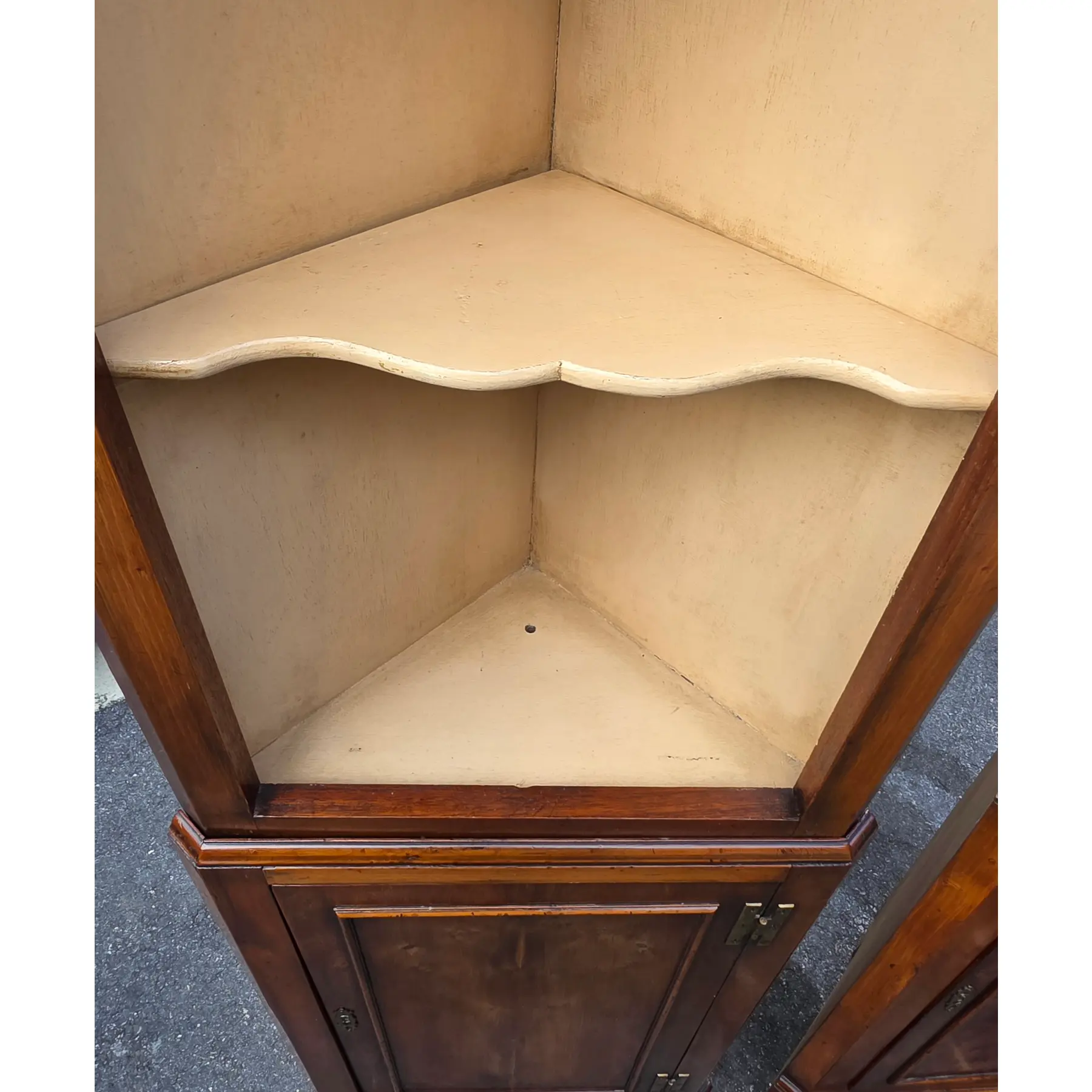 This Pair of Georgian Revival Diminutive Mahogany Corner Cabinets with arched top display openings and paneled base cupboards from the early 20th century is elegant and practical, with a scale that is increasingly difficult to find. This lovely pair has a narrow profile with balanced form and is versatile enough to layer and add to underutilized corners within a wide range of spaces and interior styles, from traditional to transitional.