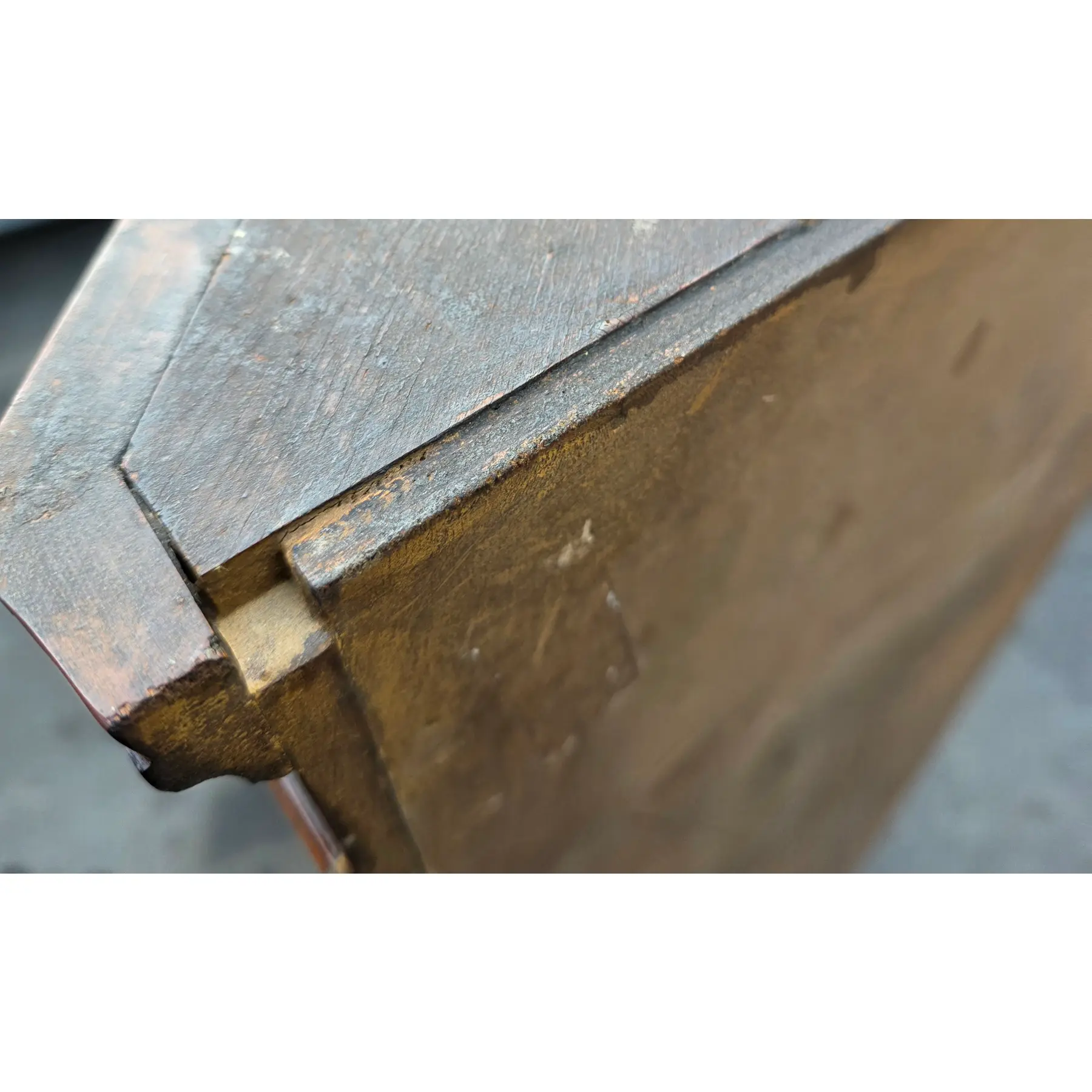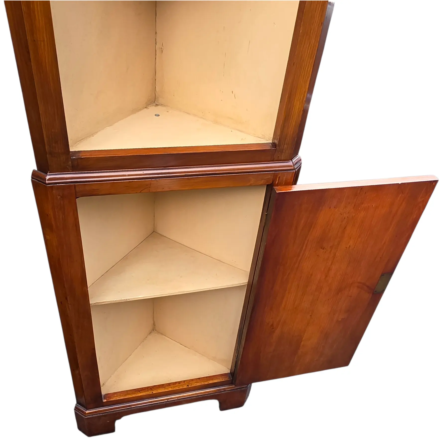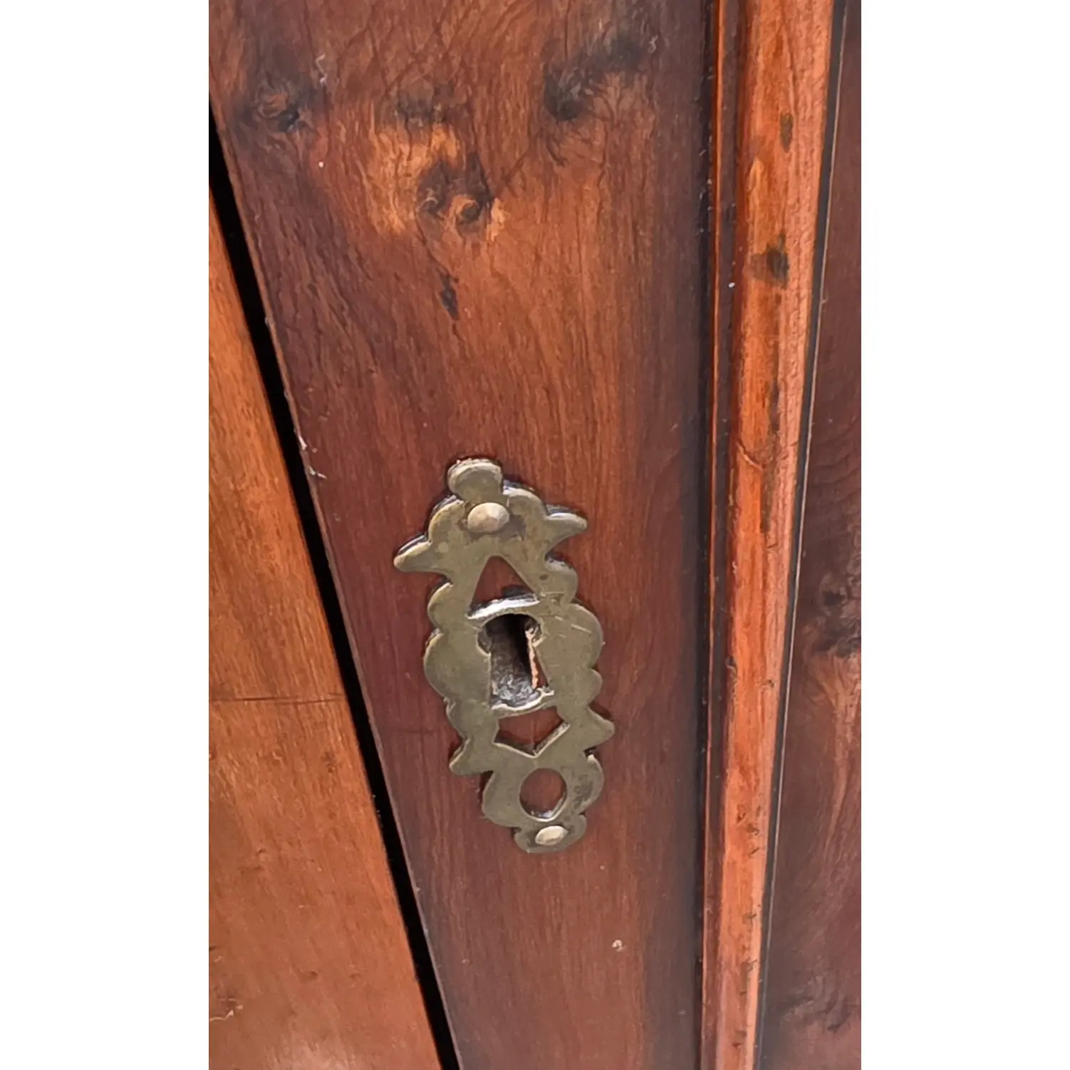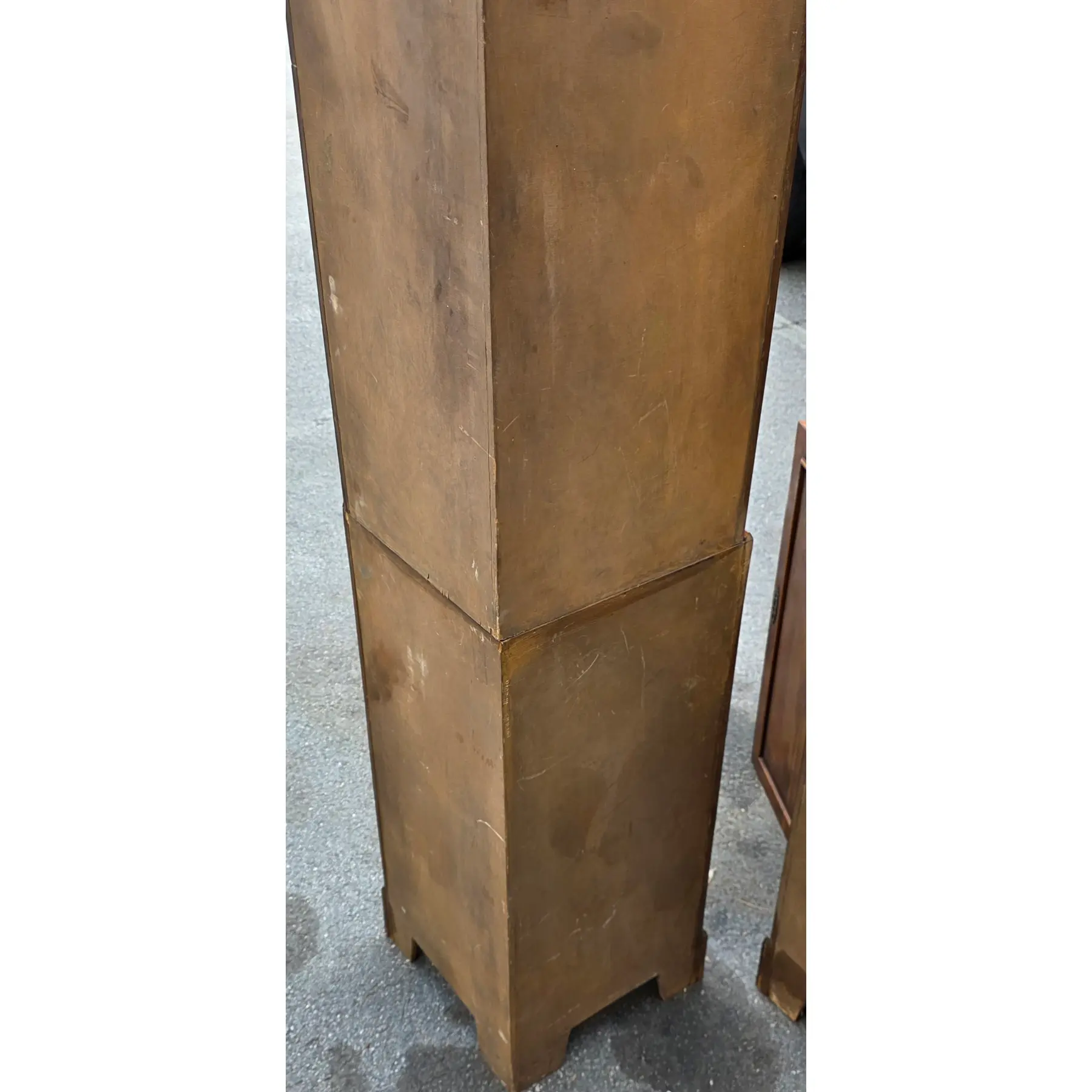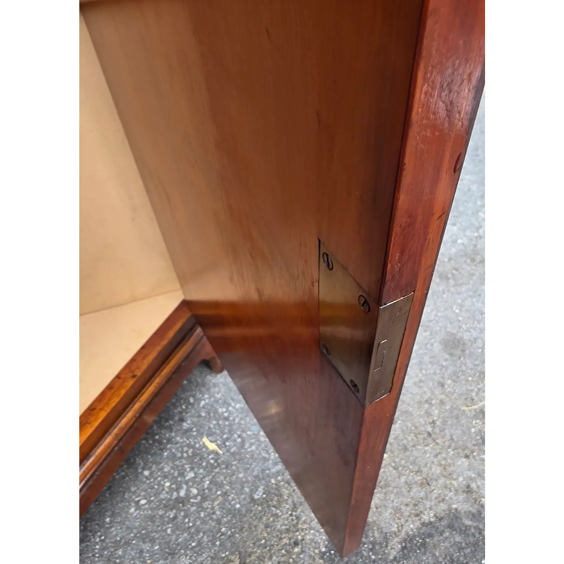 * Bottom section cupboard doors feature mahogany veneer fronts, original brass hardware, including exposed hinges and decorative escutcheons