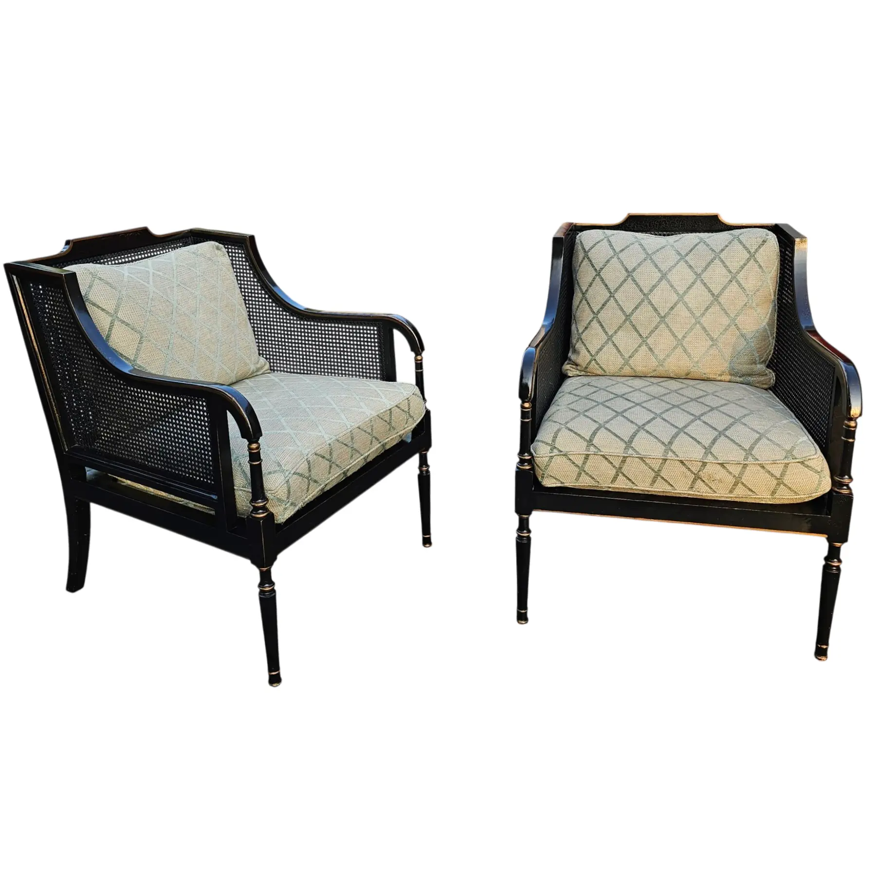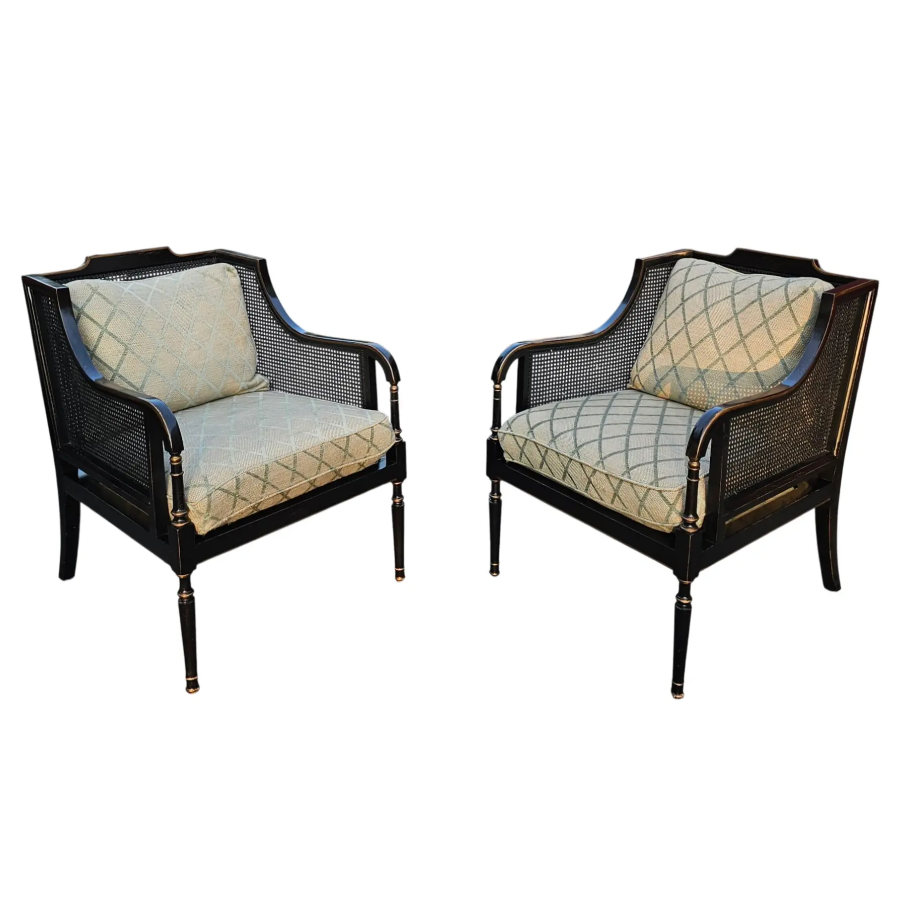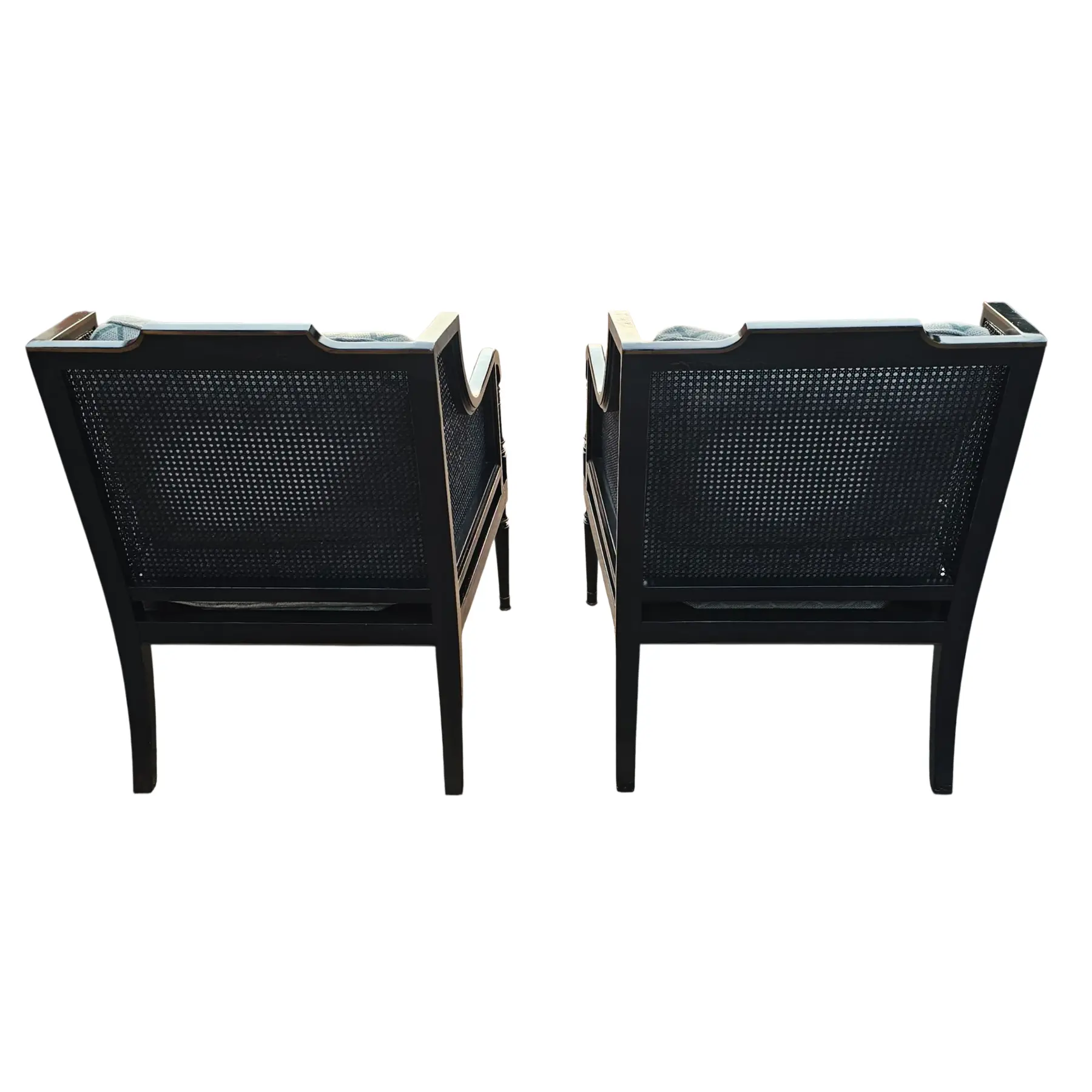 Pair of Minton-Spidell ‘Brighton’ Armchairs in Ebonized Finish with Goose Down Cushions has a timeless Regency-inspired silhouette refelcting classical English design.