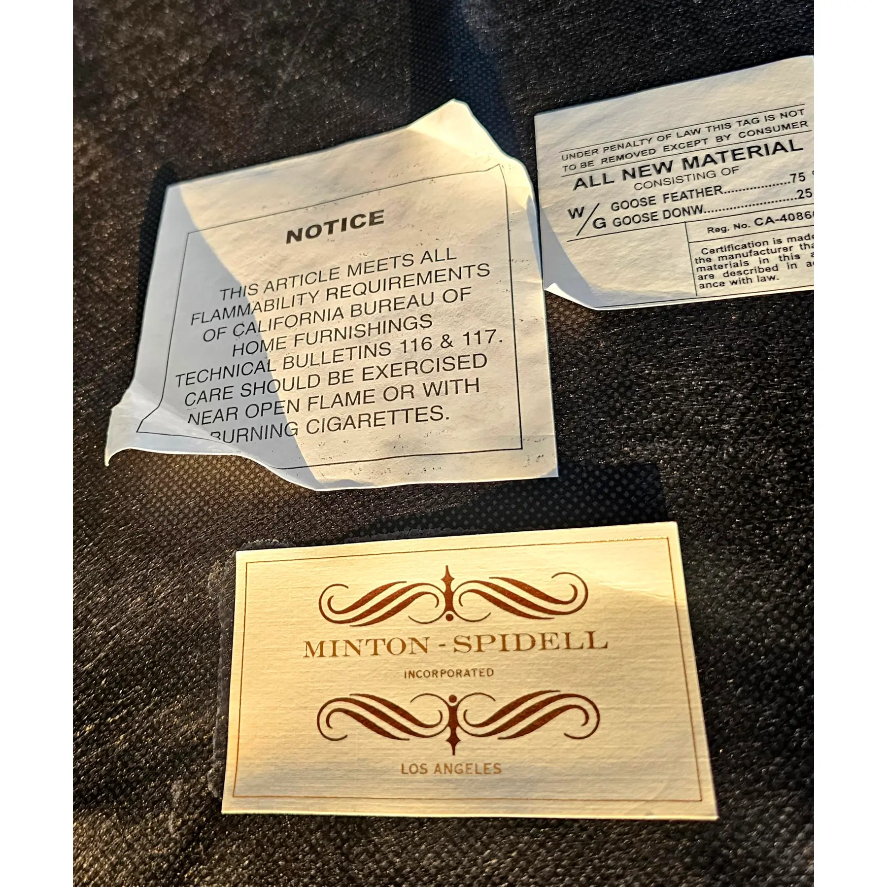 Original Minton-spidell brass plaque and upholstery tags