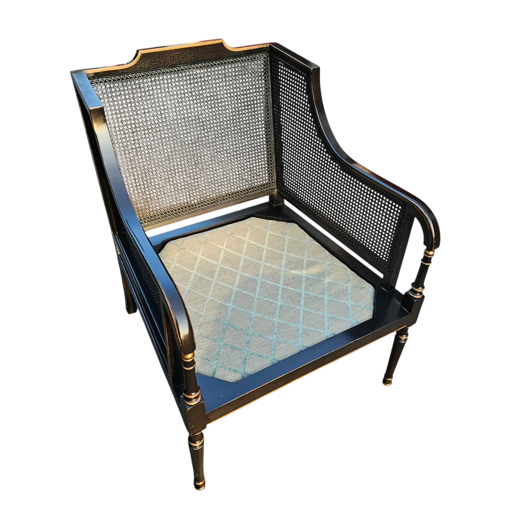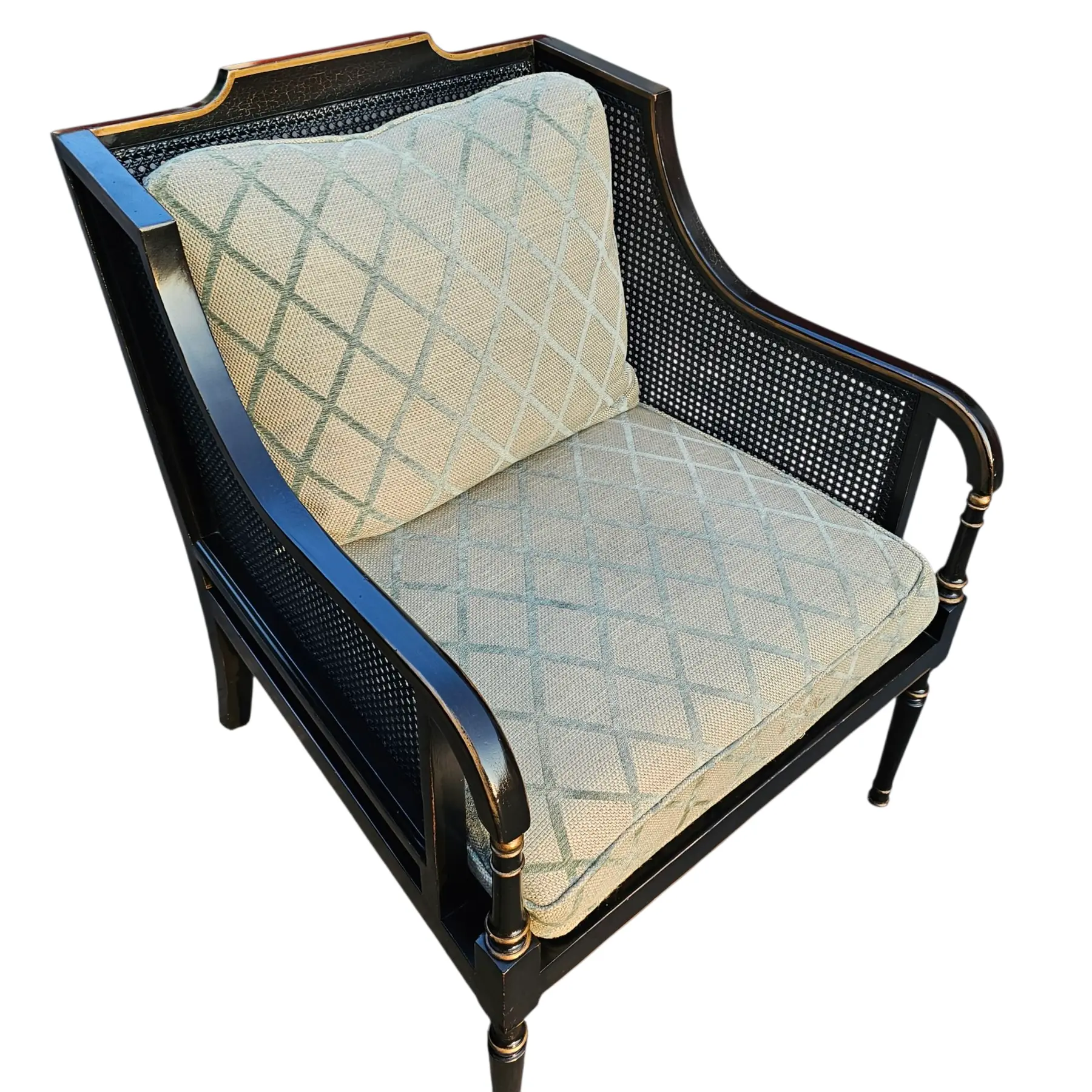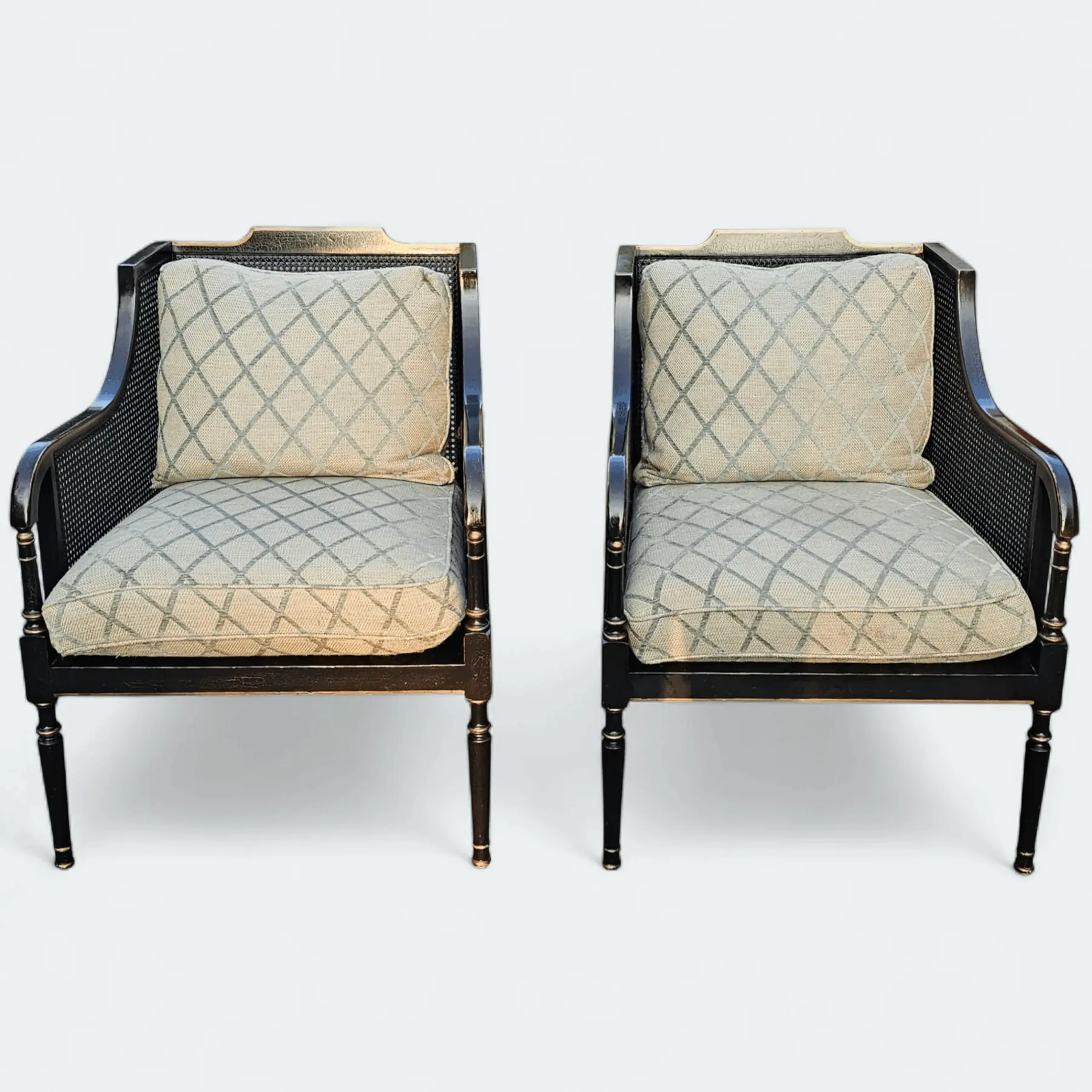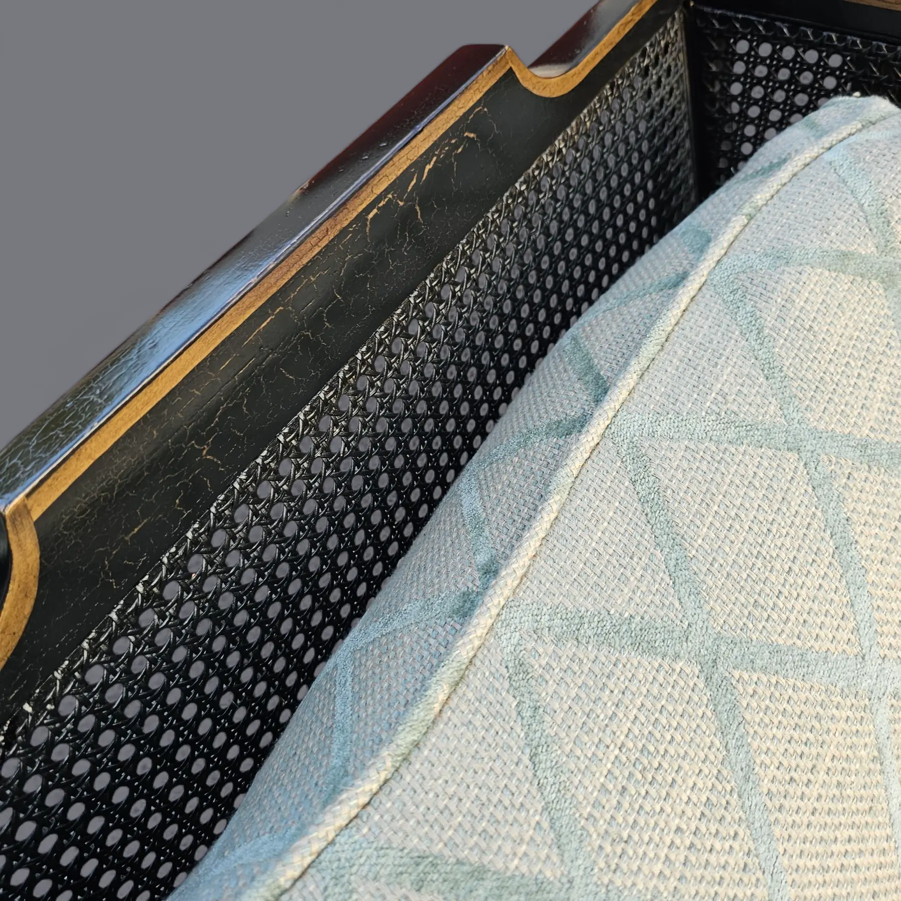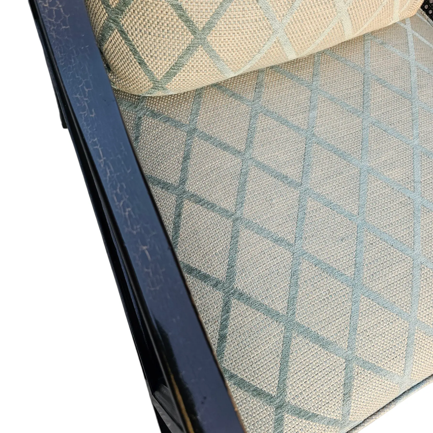 Cushions upholstered in a pale celadon-toned geometric fabric with diamond lattice pattern