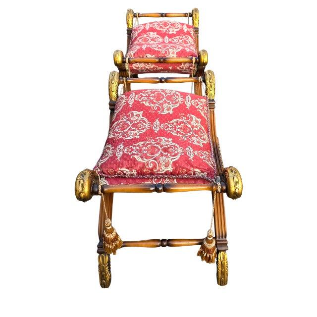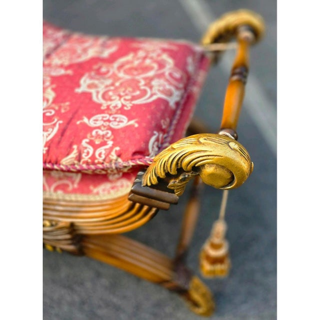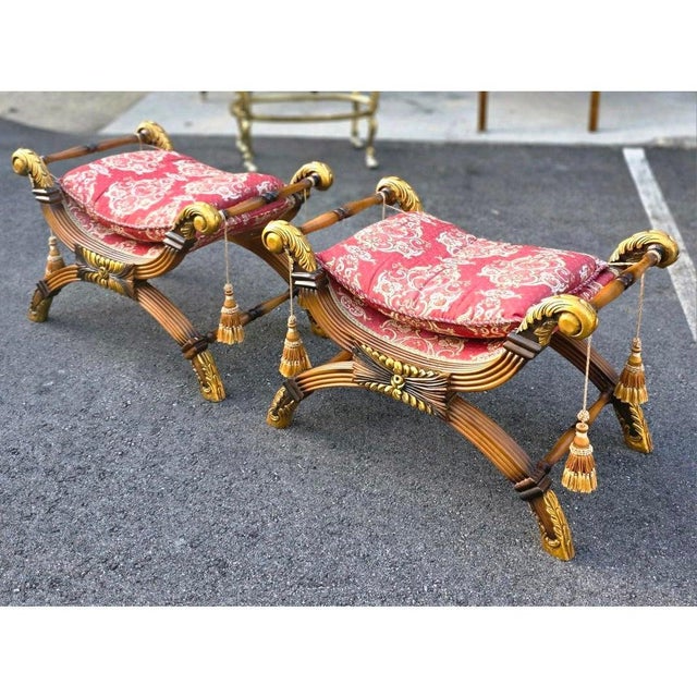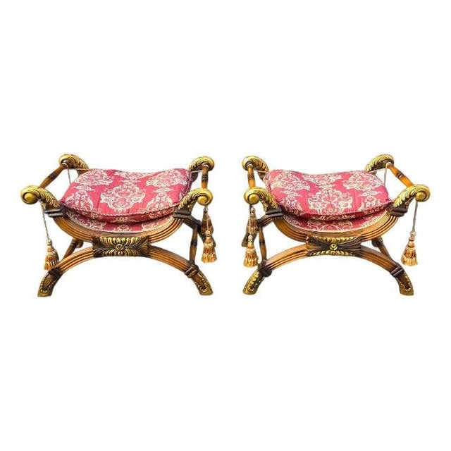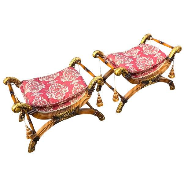 This Pair of Neoclassical-style, Carved, and Gilded Curule Benches is a rare opportunity to own visually magnetic and decorative furnishings that will brighten and enhance virtually any interior.