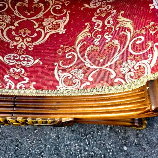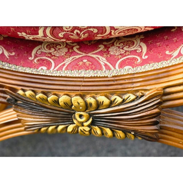 Lavish gilded embellishments of anthemion finials and curled acanthus scrolls, along with scalloped leaf motifs on the legs and crest rails