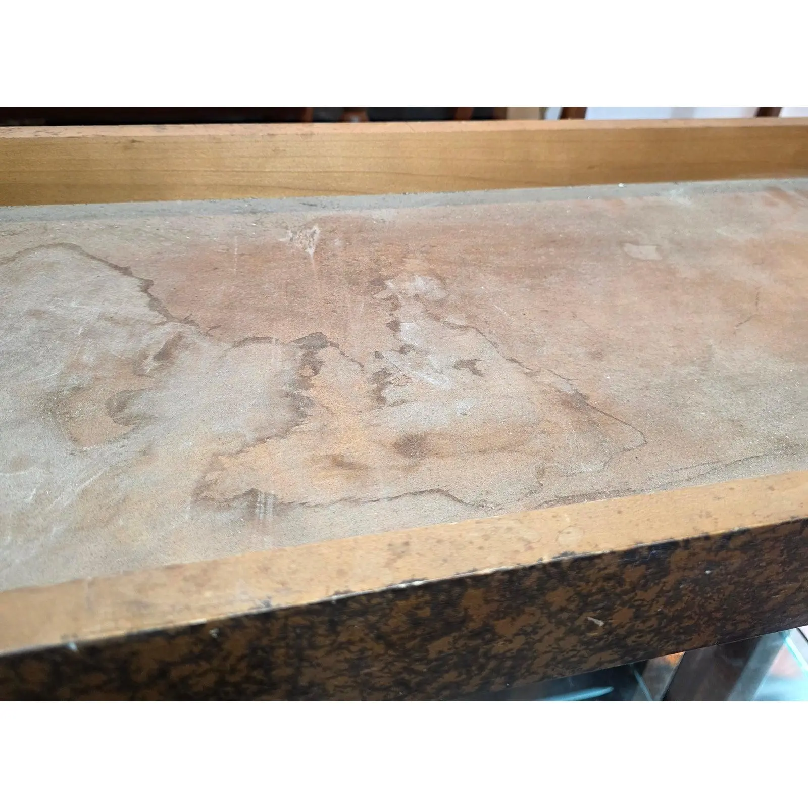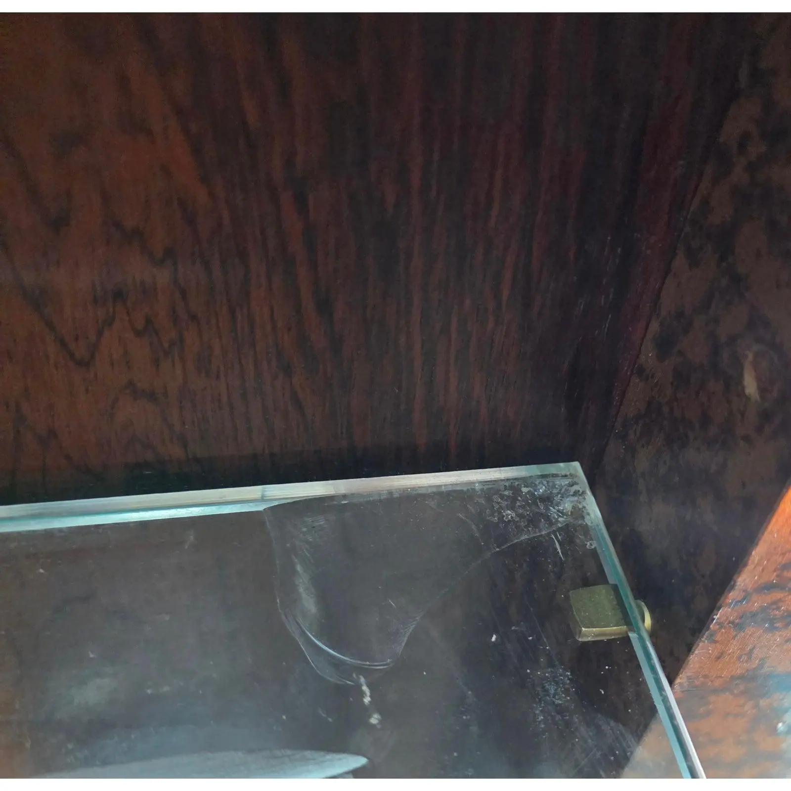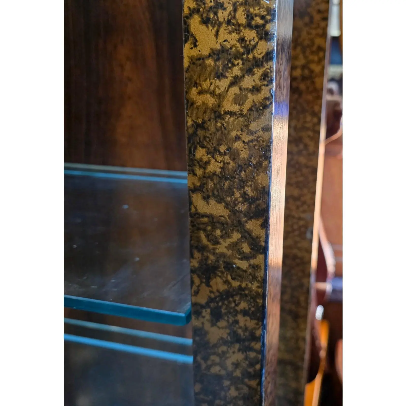 A striking pair of mid-century display cabinets distinguished by their bold architectural form and richly figured surfaces. Each cabinet is framed in a deeply textured, mottled lacquer finish reminiscent of églomisé or tortoiseshell, creating a dramatic contrast against the warm, bookmatched wood interiors.