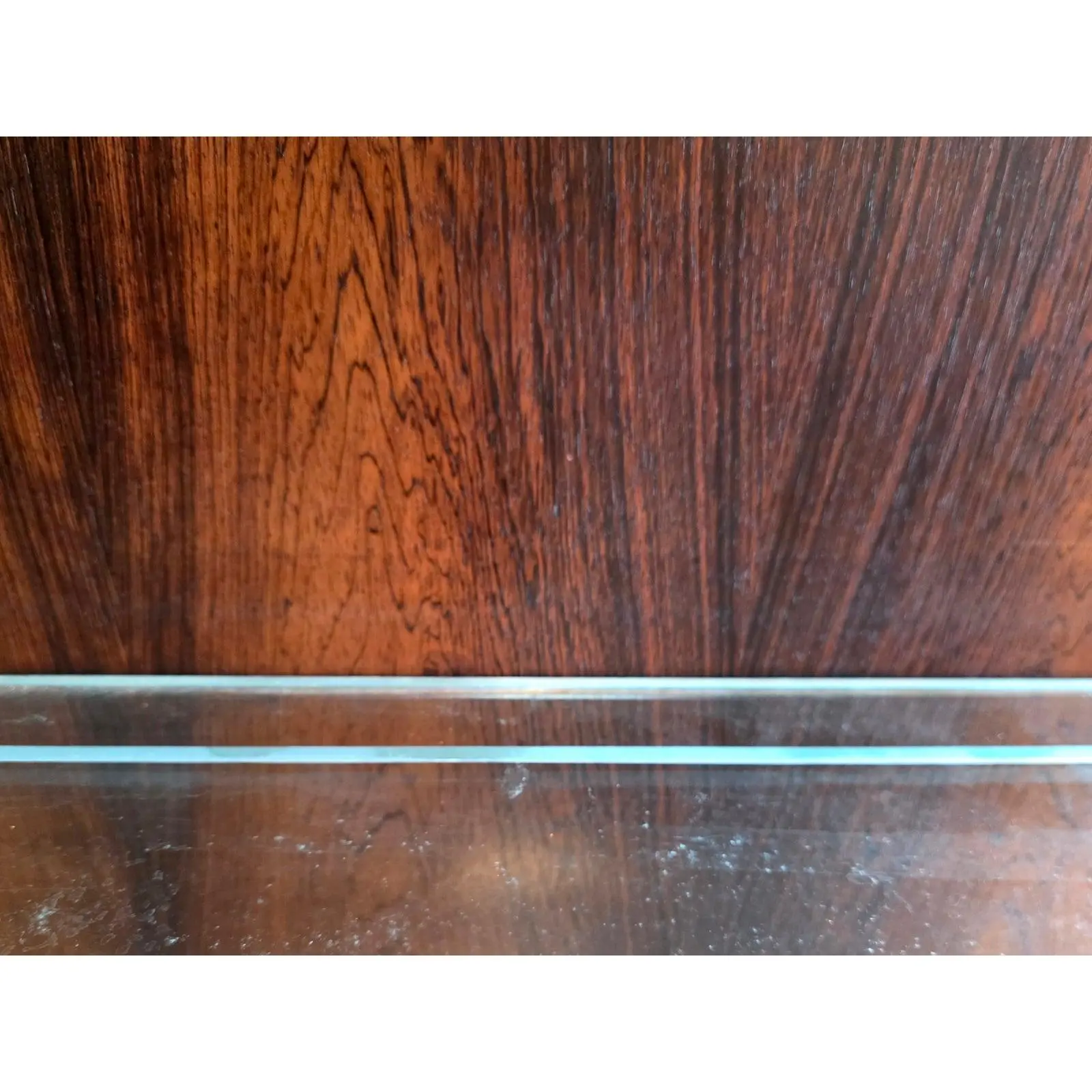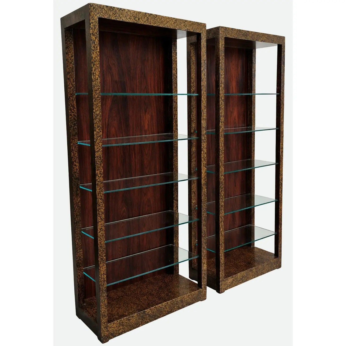 The cases are designed with clean, rectilinear lines and open fronts, allowing for unobstructed display. Multiple inset glass shelves appear to float within the structure, enhancing the visual lightness while providing ample space for objects, books, or decorative collections. The interiors feature a lustrous, reddish-brown veneer with pronounced grain patterning, adding depth and refinement.