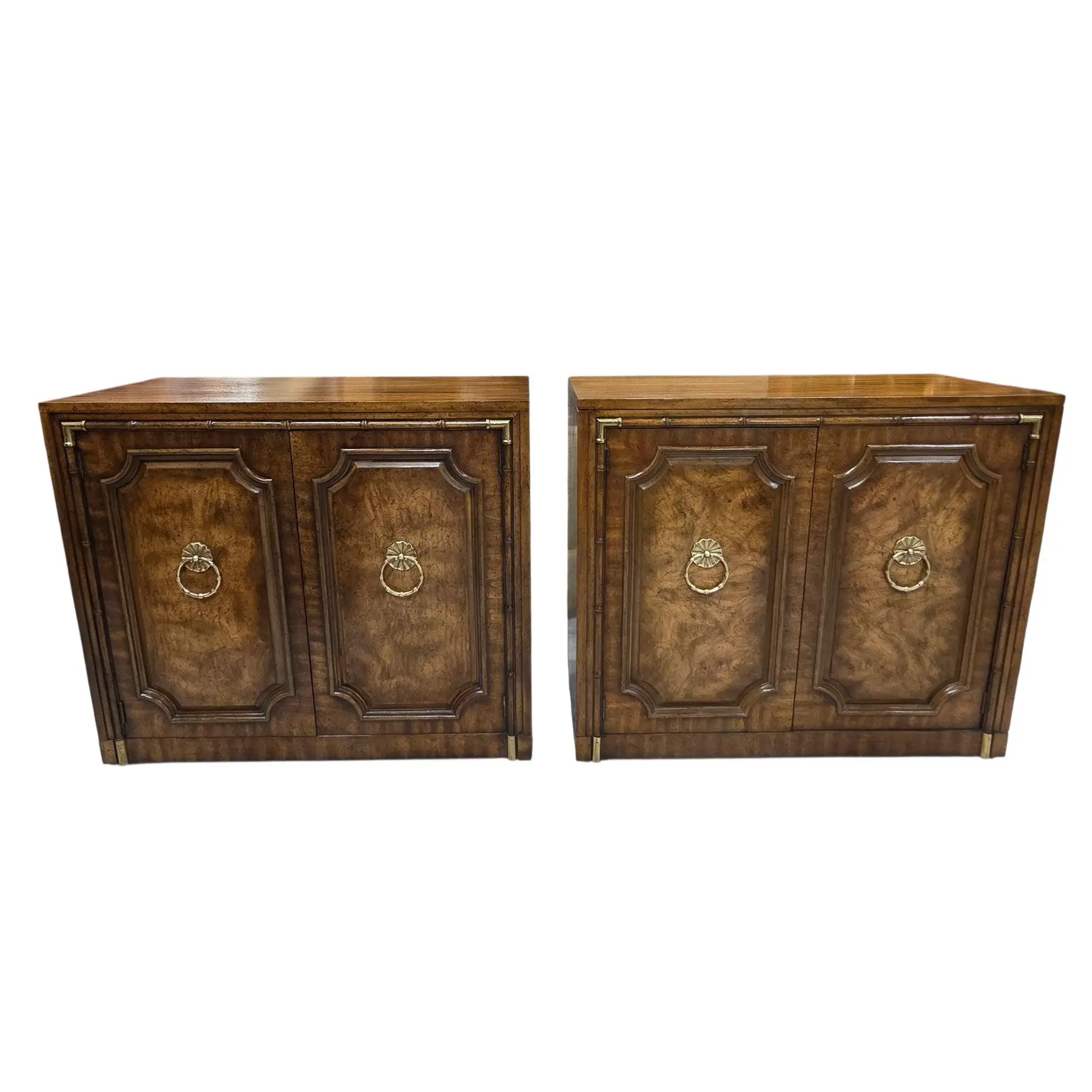 This Pair of Mid 20th Century Weiman Faux Bamboo 2-Door (Burl Front) Server Cabinets is a commanding and architecturally spectacular set,with an Asian-inspired composition of design and ornamental details