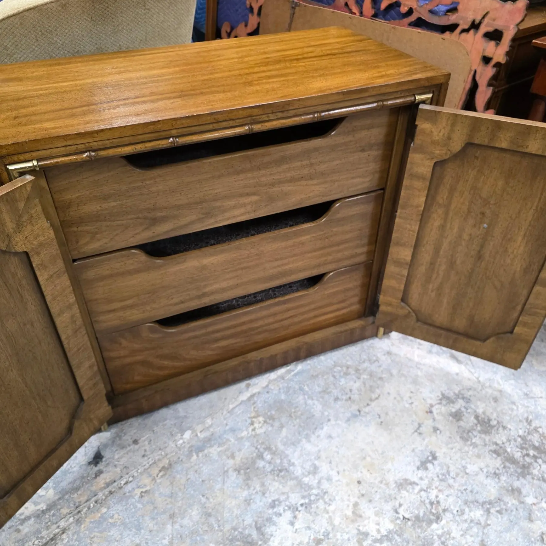 • Very good vintage condition and structurally sound, consistent with age and prior use. Wood surfaces display light surface wear, small scattered marks, and minor finish variation. Burl veneer door panels remain well preserved with only small speckling visible in the veneer pattern. Cabinet tops show light surface wear and minor marks consistent with normal use. Faux bamboo trim elements and corner posts have minor finish wear visible in select areas.
