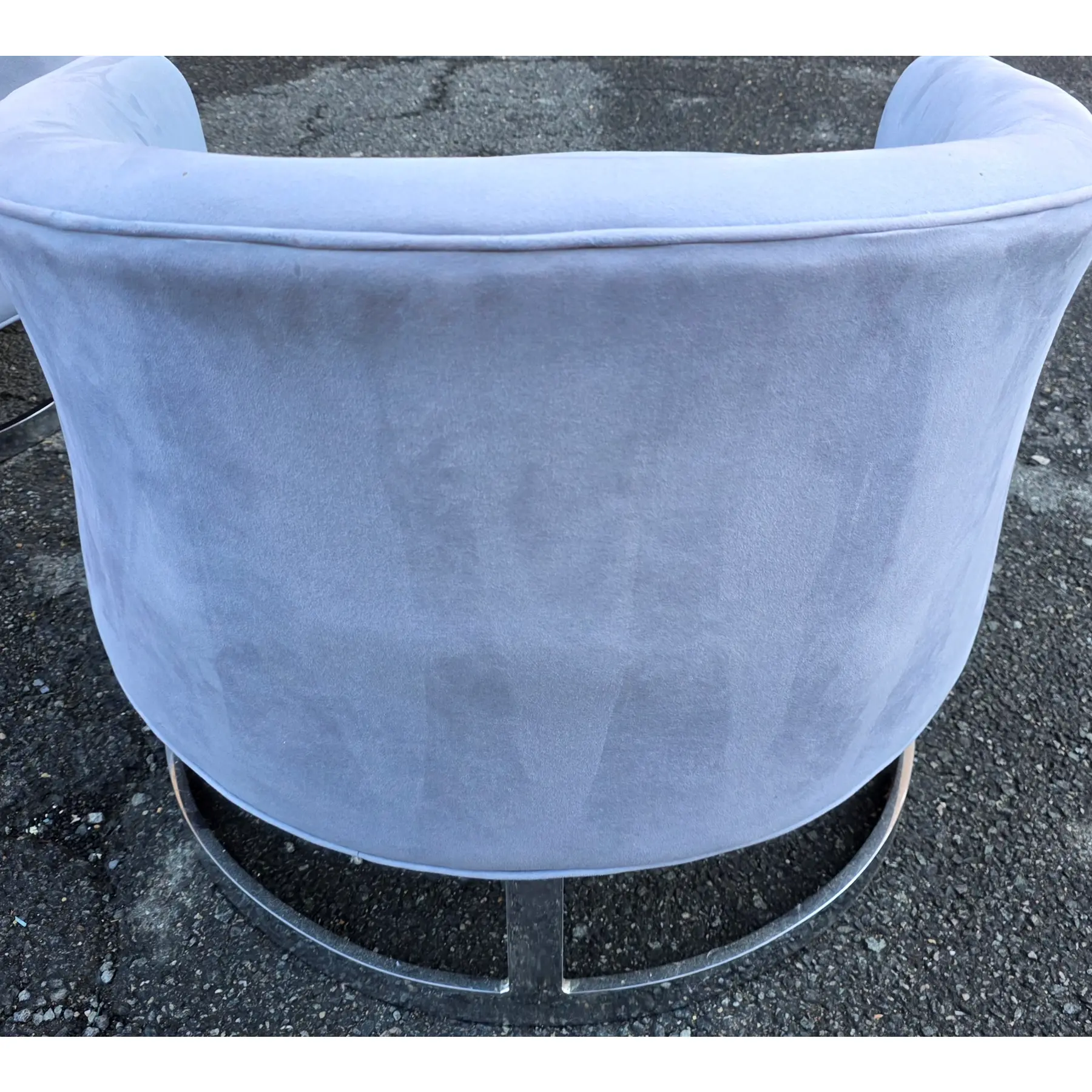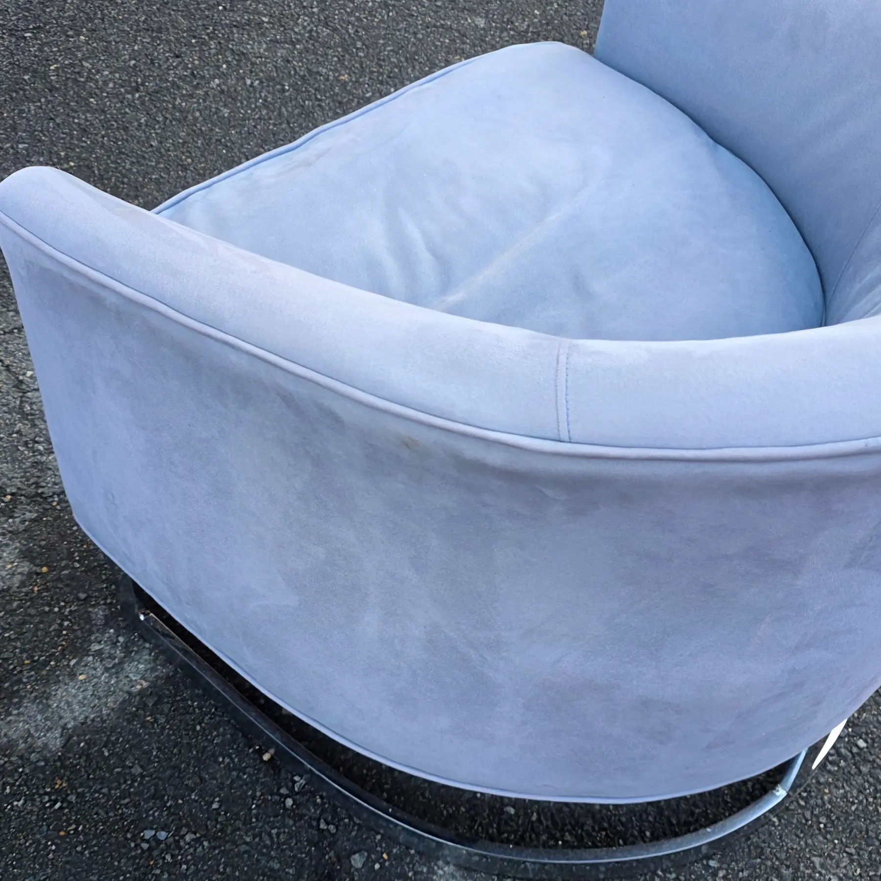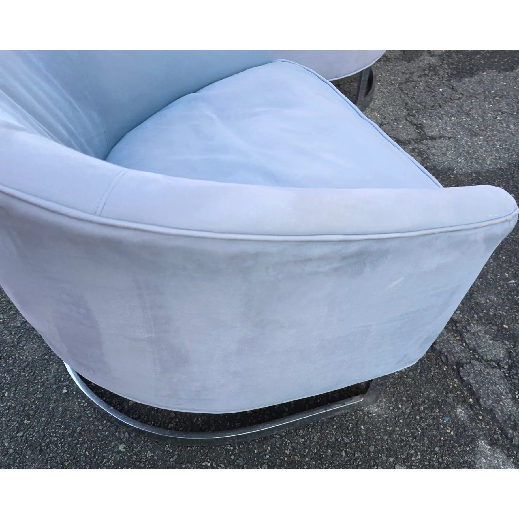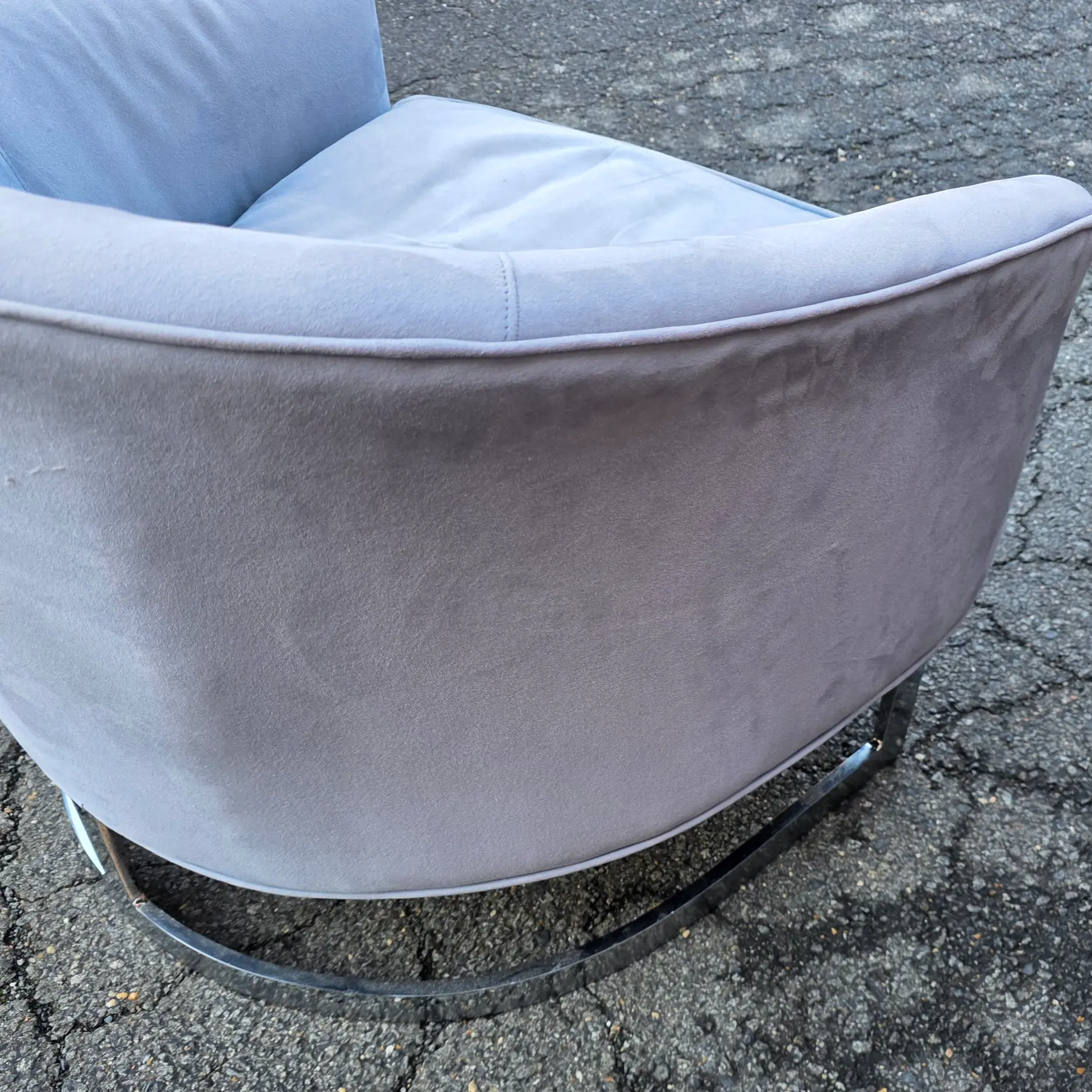 * Bases constructed in polished chrome with a continuous strap-style sled form – arcing forward and backward in a single banded and shows even coloration with visible nap variation consistent with velour or microfiber fabric