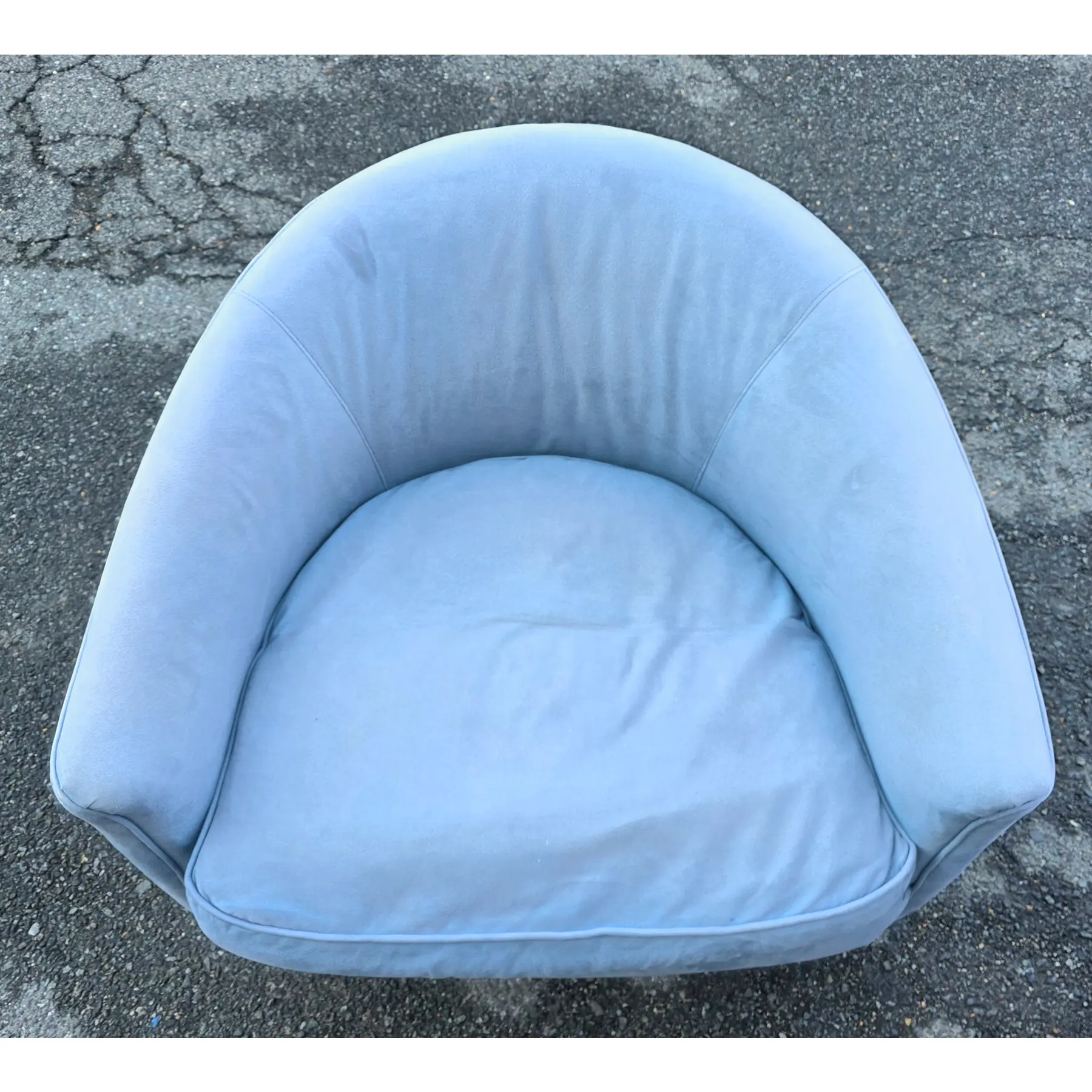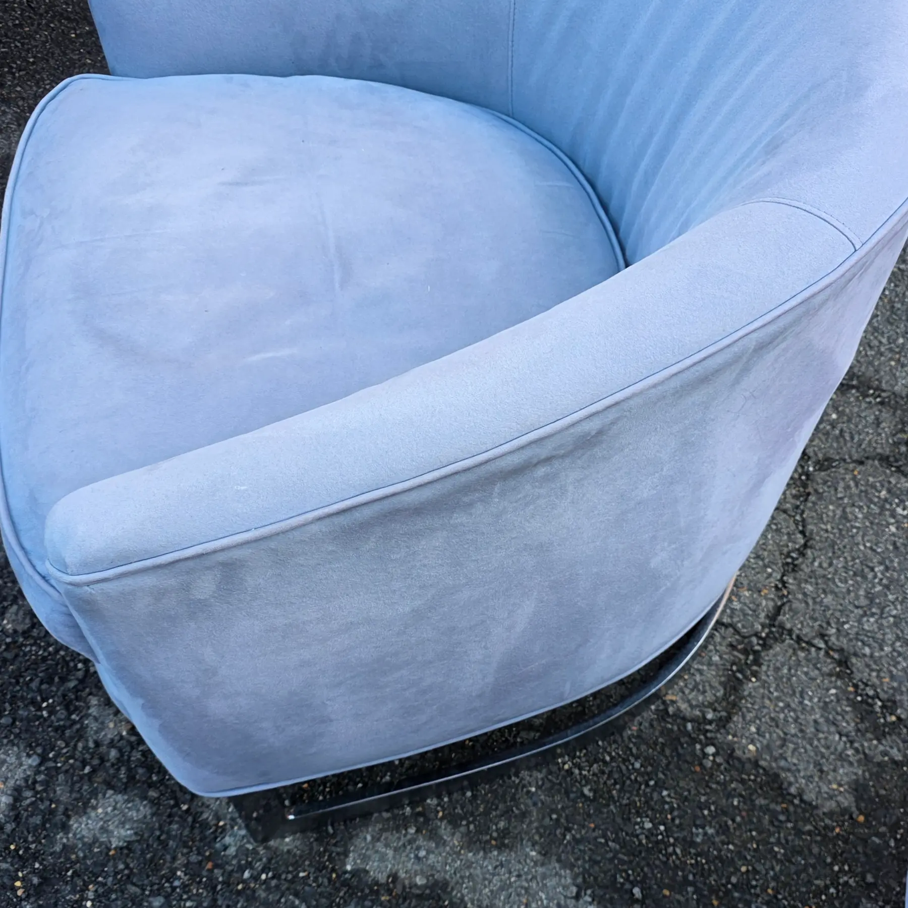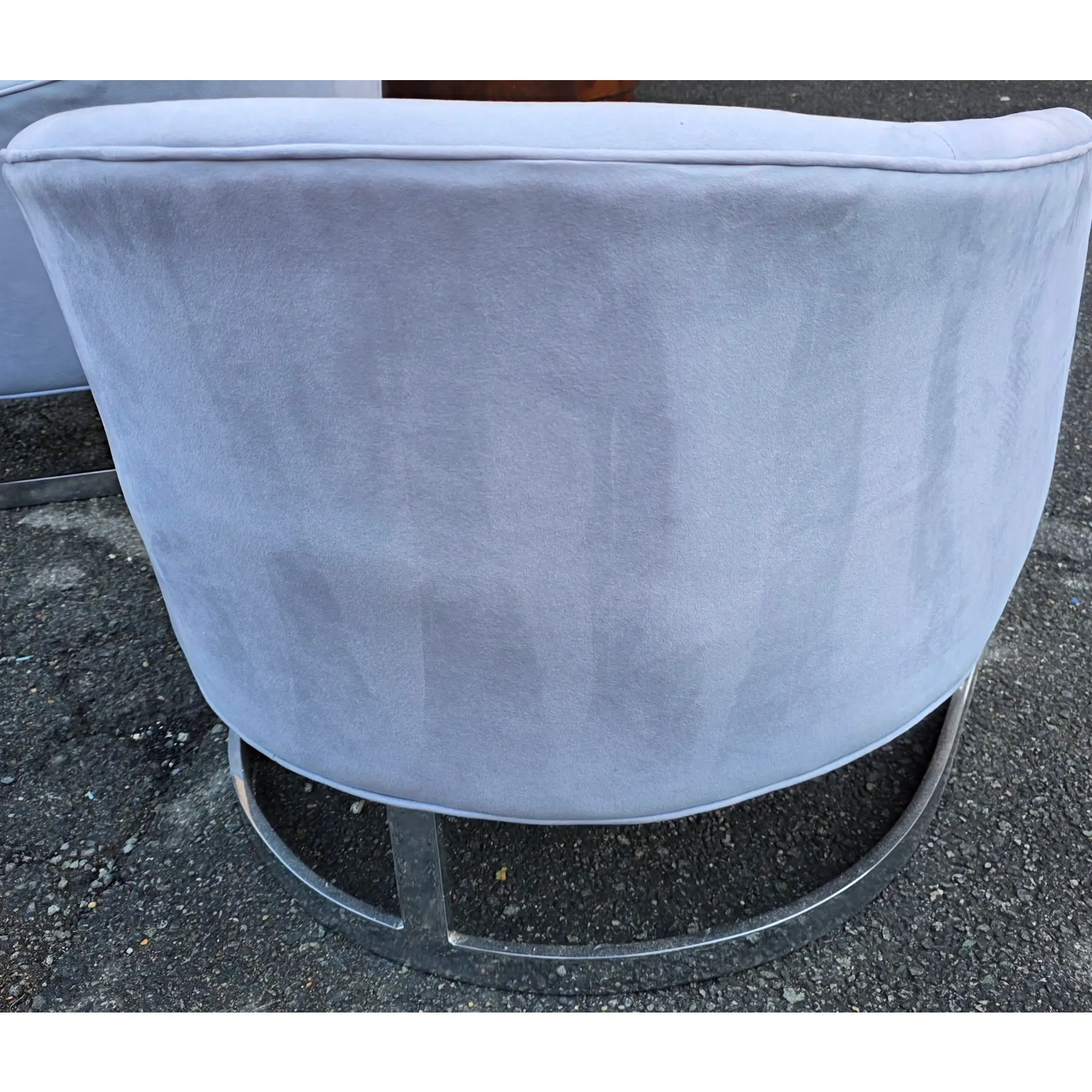 * Very good vintage condition with age-consistent signs of use, including light surface shading and tonal shifts visible across backs and arms, consistent with fabric pile and handling rather than wear-through. Minor faint marks and subtle pressure impressions visible on seat cushions and outer backs upon close inspection. Piping remains intact and aligned, with no visible separations or fraying.Chrome strap bases show light surface scratches, scuffs, and small areas of dulling consistent with age and prior use. Chairs are structurally solid with no visible structural breaks observed in the frames.